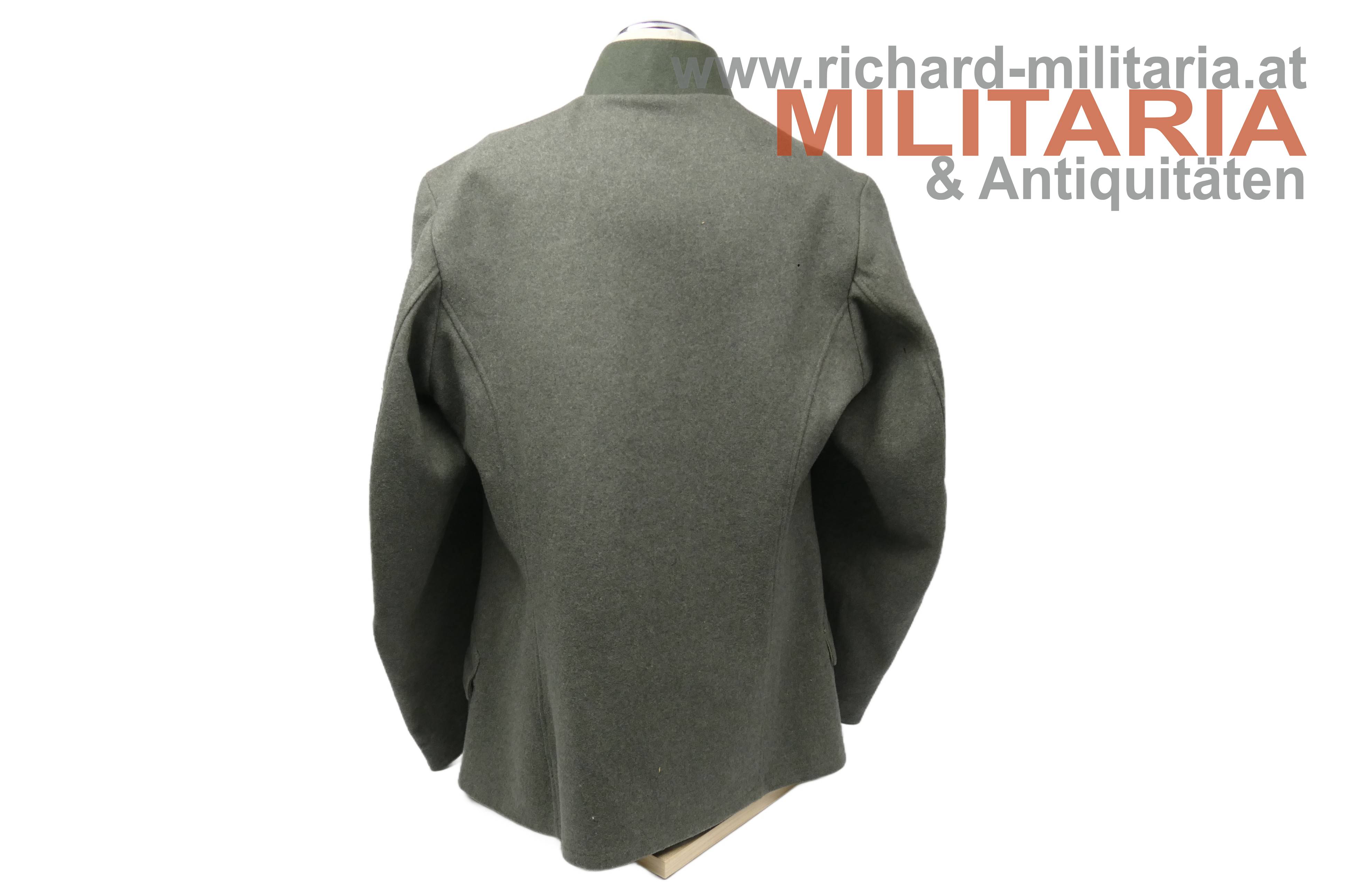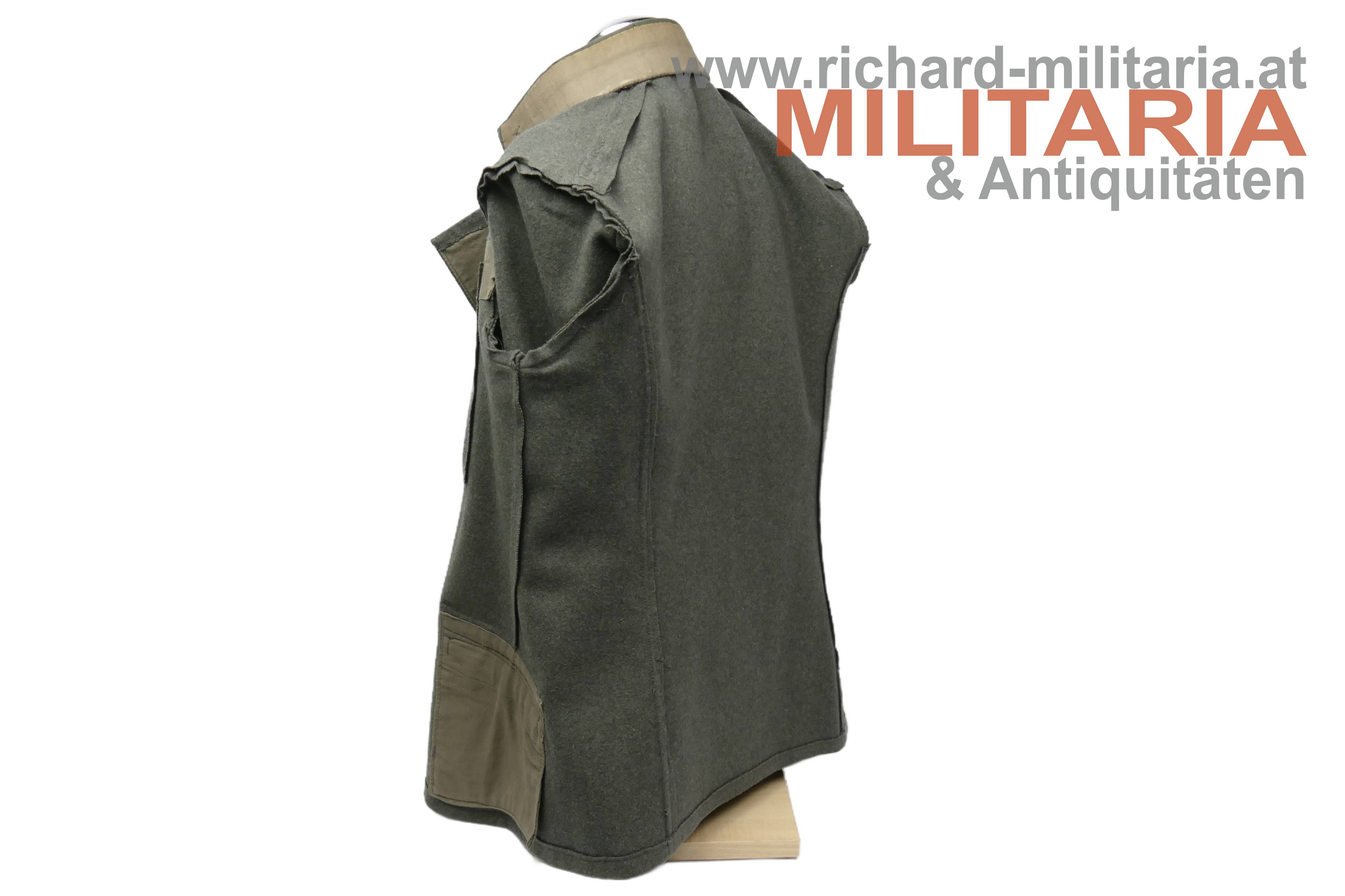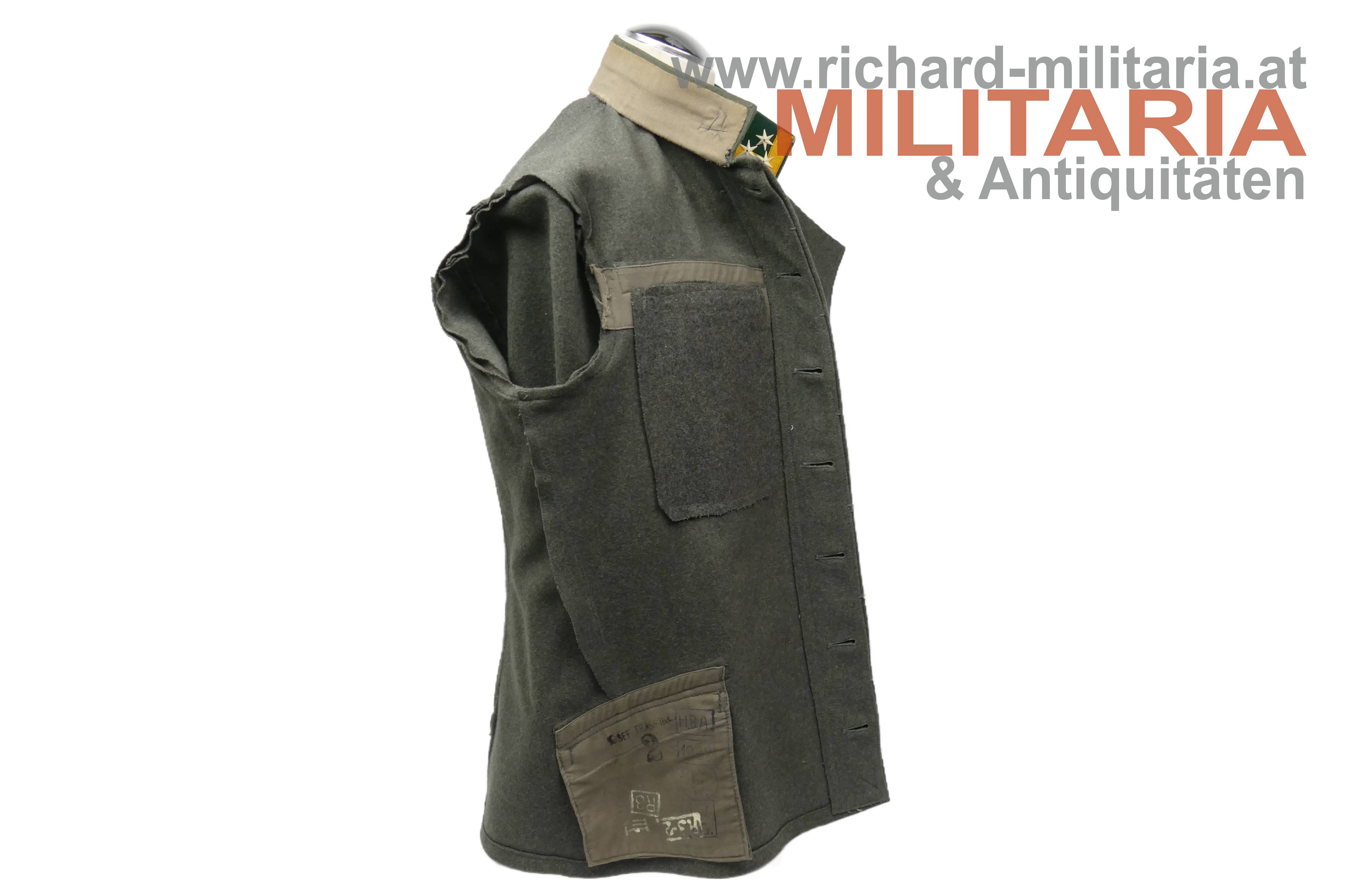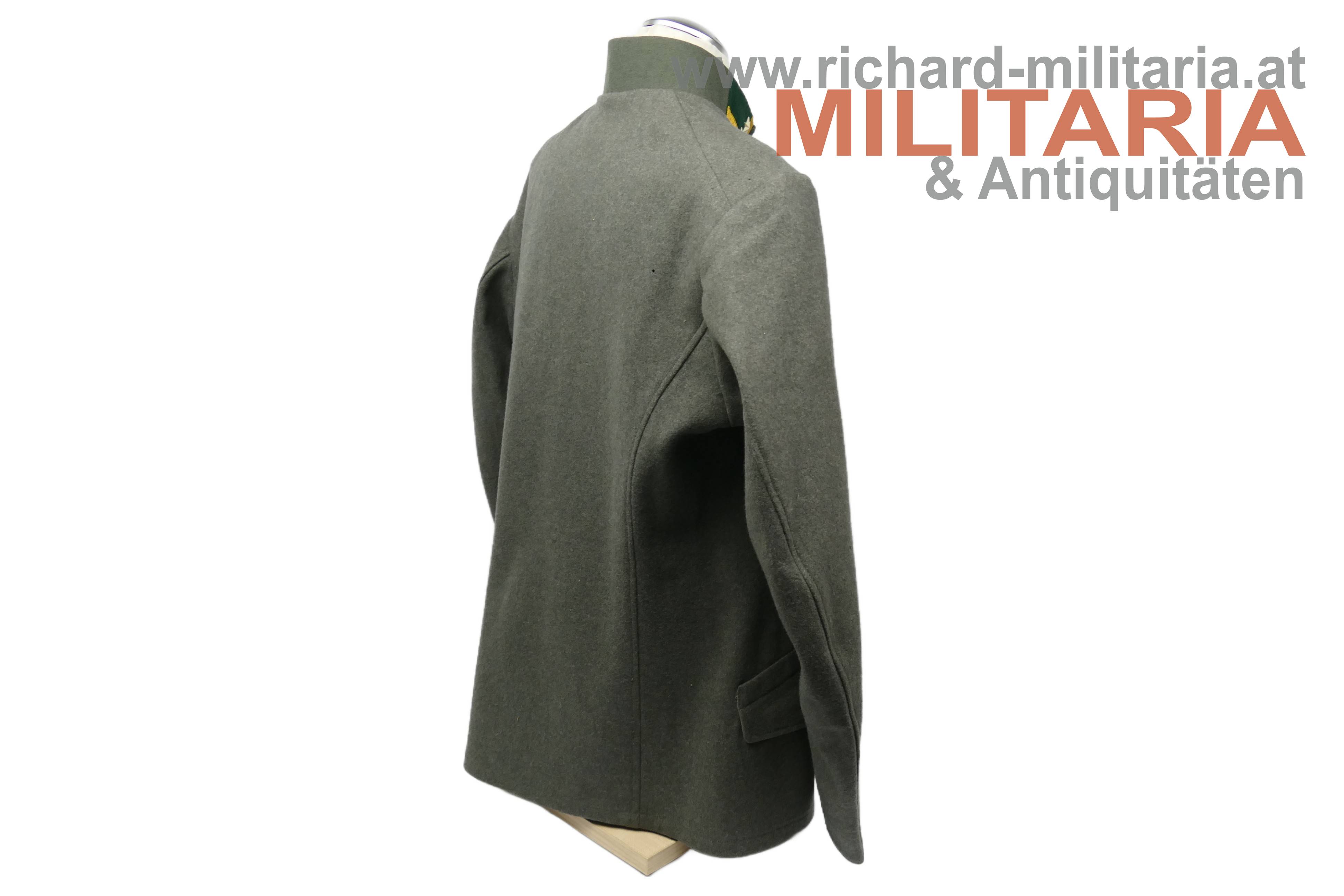 Bundesstaat - feldgraue Bluse eines Wachtmeister; feldgrauer grober Stoff; verdeckte Knopfleiste mit 7 feldgrau lackierten Knöpfe; eingesetzte voll ausgeführte Brust- und Schoßtaschen; die Brusttaschenpatten bereits wieder geschweift wie es bei den späteren Stücken der 1. Republik wieder üblich war; auf der linken Brust ein gedrillter Wollstofffaden zum Anbringen von Auszeichnungen; Bluse innen ungefüttert; auf der linken Schoßtasche mit "HBA 1932" gestempelt (!); daneben weitere Stempelungen; die Kragenlitzen der 1. Republik wurden entfernt und fachmännisch wie ab 1933 üblich wieder durch die ehemaligen Dienstgrad-Kennungen wie bei der Adjustierung der k.u.k. Armee ersetzt; am Stehkragen befinden sich grüne Kragenspiegel mit "kaisergelben" Wollbörtchen und je 3 Rangsternen; zwei sehr kleine Mottenlöcher revers, ansonsten einwandfreie Erhaltung;