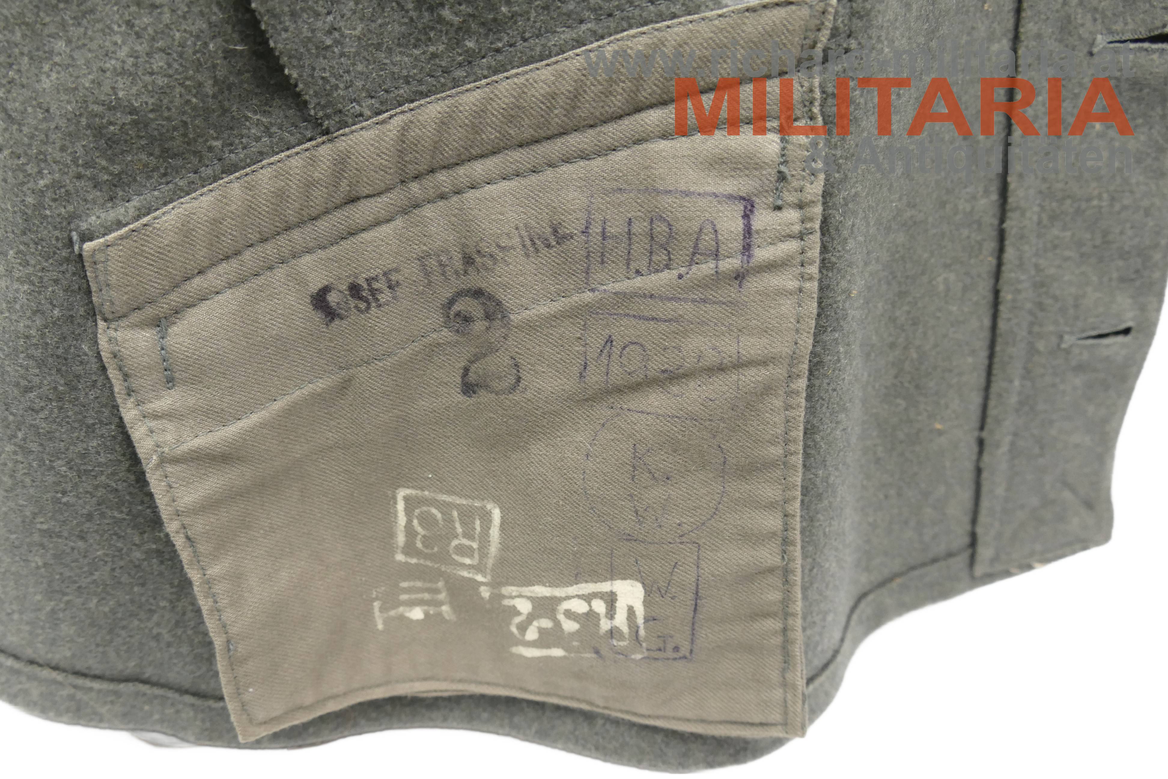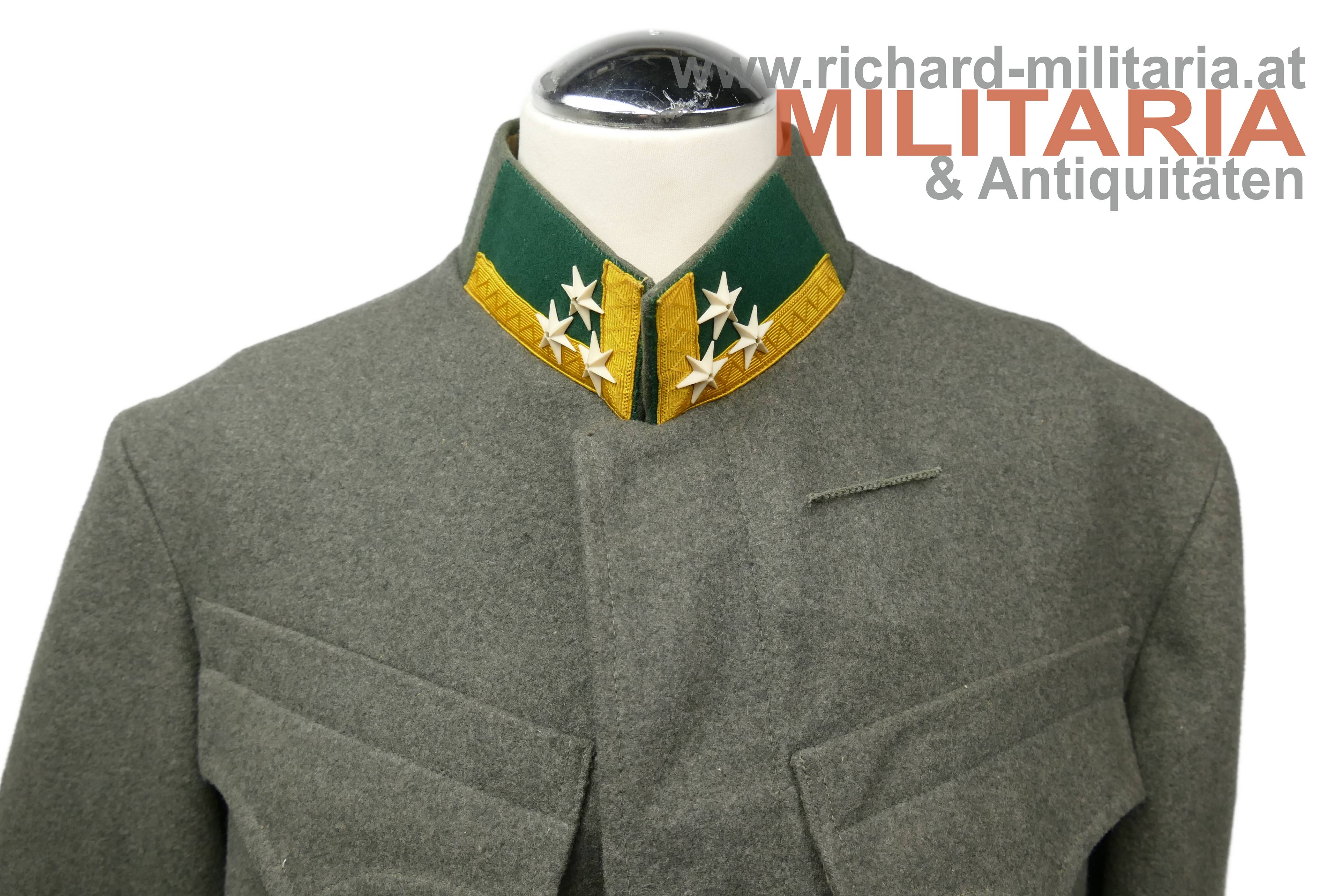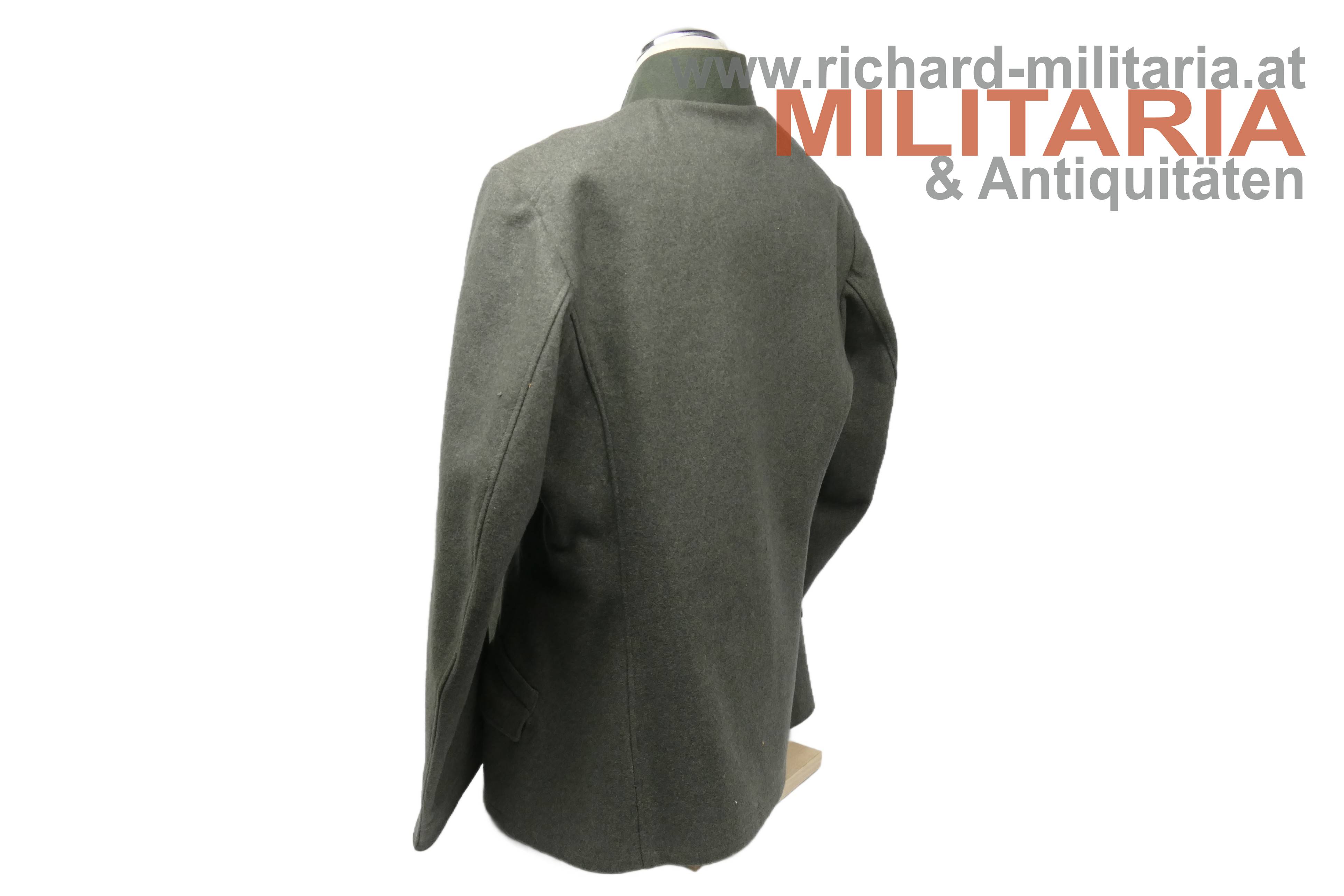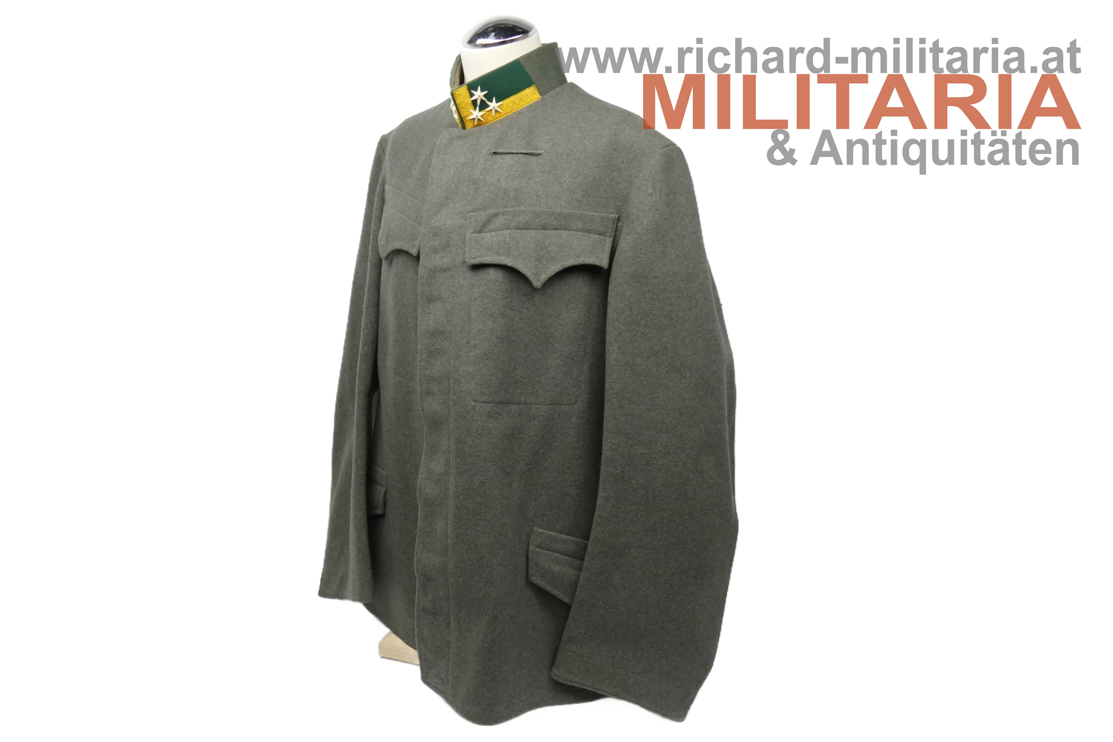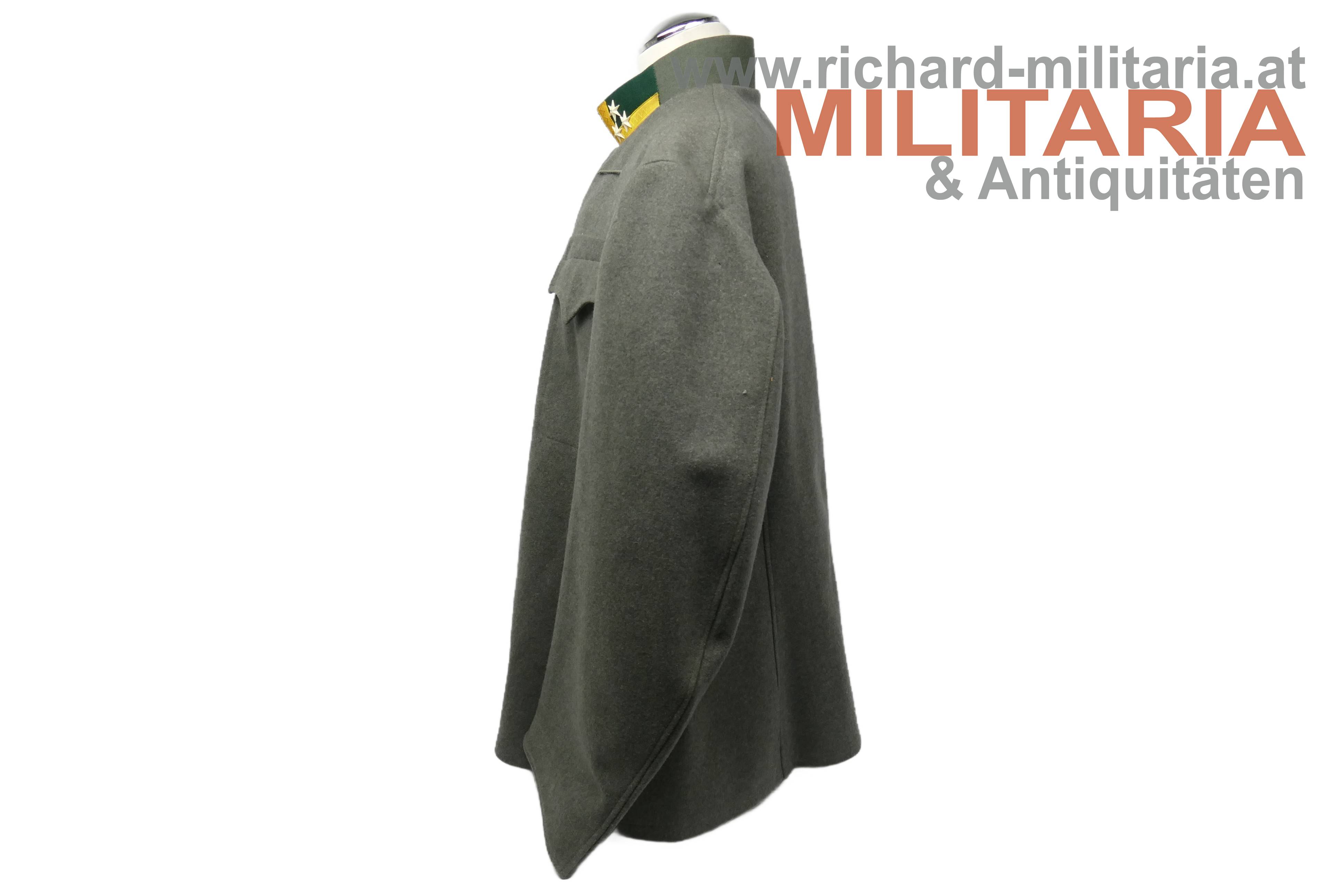 Bundesstaat - feldgraue Bluse eines Wachtmeister; feldgrauer grober Stoff; verdeckte Knopfleiste mit 7 feldgrau lackierten Knöpfe; eingesetzte voll ausgeführte Brust- und Schoßtaschen; die Brusttaschenpatten bereits wieder geschweift wie es bei den späteren Stücken der 1. Republik wieder üblich war; auf der linken Brust ein gedrillter Wollstofffaden zum Anbringen von Auszeichnungen; Bluse innen ungefüttert; auf der linken Schoßtasche mit "HBA 1932" gestempelt (!); daneben weitere Stempelungen; die Kragenlitzen der 1. Republik wurden entfernt und fachmännisch wie ab 1933 üblich wieder durch die ehemaligen Dienstgrad-Kennungen wie bei der Adjustierung der k.u.k. Armee ersetzt; am Stehkragen befinden sich grüne Kragenspiegel mit "kaisergelben" Wollbörtchen und je 3 Rangsternen; zwei sehr kleine Mottenlöcher revers, ansonsten einwandfreie Erhaltung;