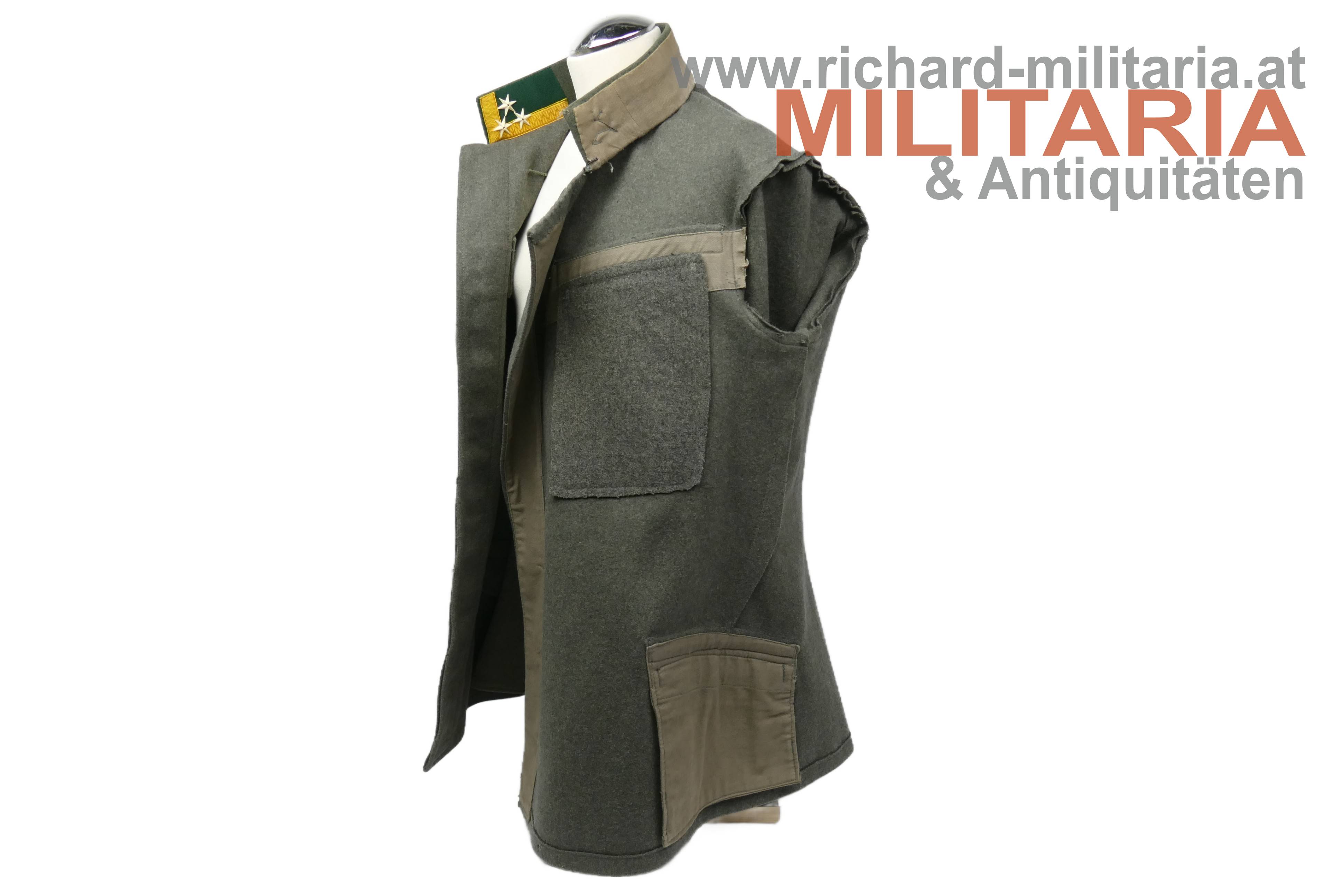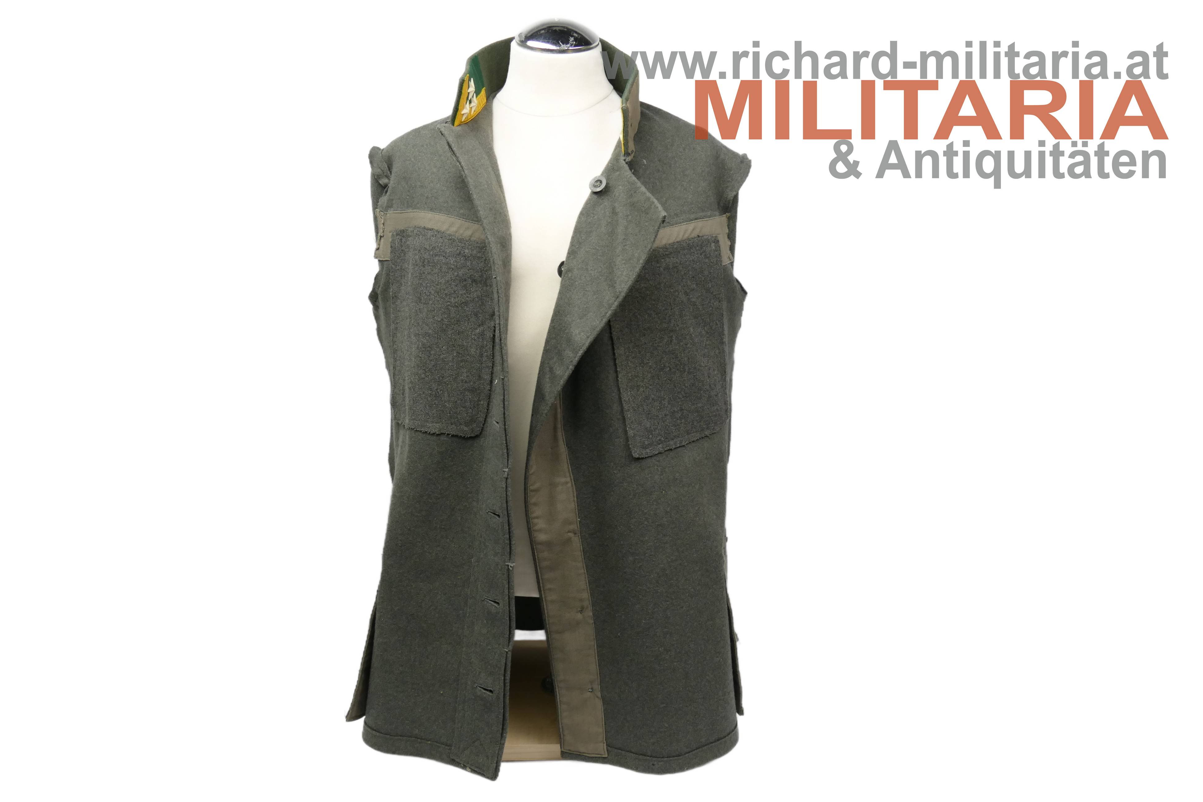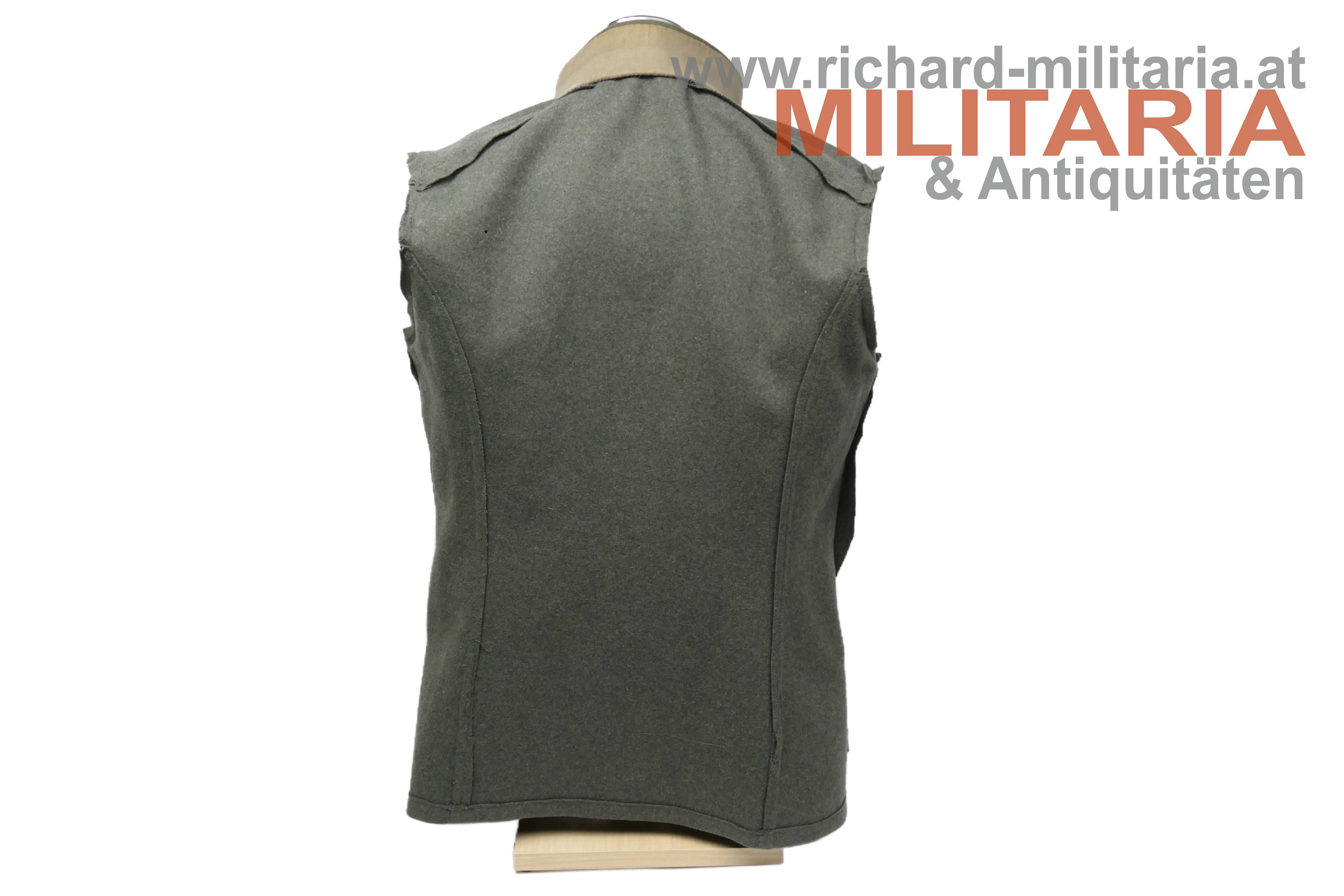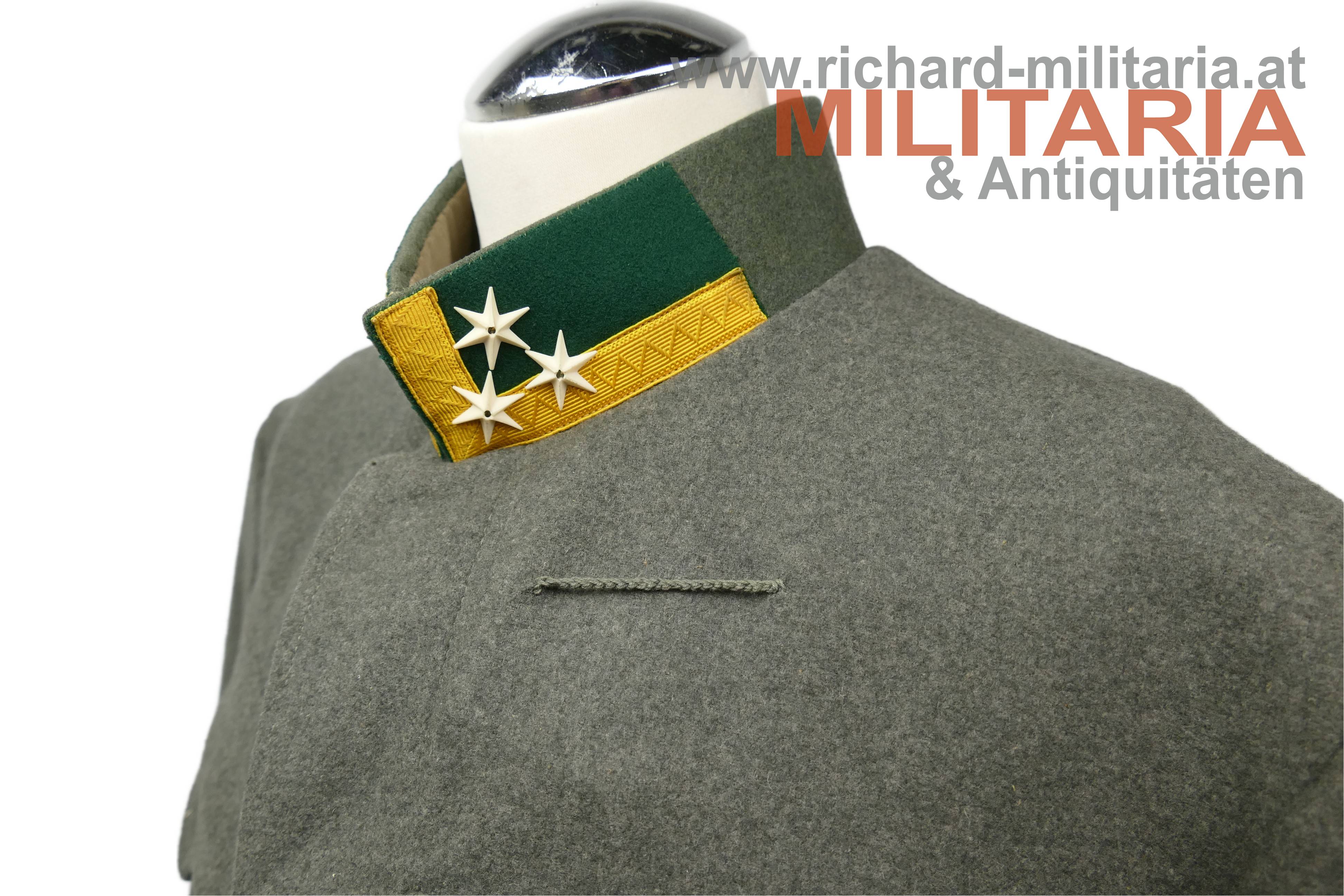 Bundesstaat - feldgraue Bluse eines Wachtmeister; feldgrauer grober Stoff; verdeckte Knopfleiste mit 7 feldgrau lackierten Knöpfe; eingesetzte voll ausgeführte Brust- und Schoßtaschen; die Brusttaschenpatten bereits wieder geschweift wie es bei den späteren Stücken der 1. Republik wieder üblich war; auf der linken Brust ein gedrillter Wollstofffaden zum Anbringen von Auszeichnungen; Bluse innen ungefüttert; auf der linken Schoßtasche mit "HBA 1932" gestempelt (!); daneben weitere Stempelungen; die Kragenlitzen der 1. Republik wurden entfernt und fachmännisch wie ab 1933 üblich wieder durch die ehemaligen Dienstgrad-Kennungen wie bei der Adjustierung der k.u.k. Armee ersetzt; am Stehkragen befinden sich grüne Kragenspiegel mit "kaisergelben" Wollbörtchen und je 3 Rangsternen; zwei sehr kleine Mottenlöcher revers, ansonsten einwandfreie Erhaltung;