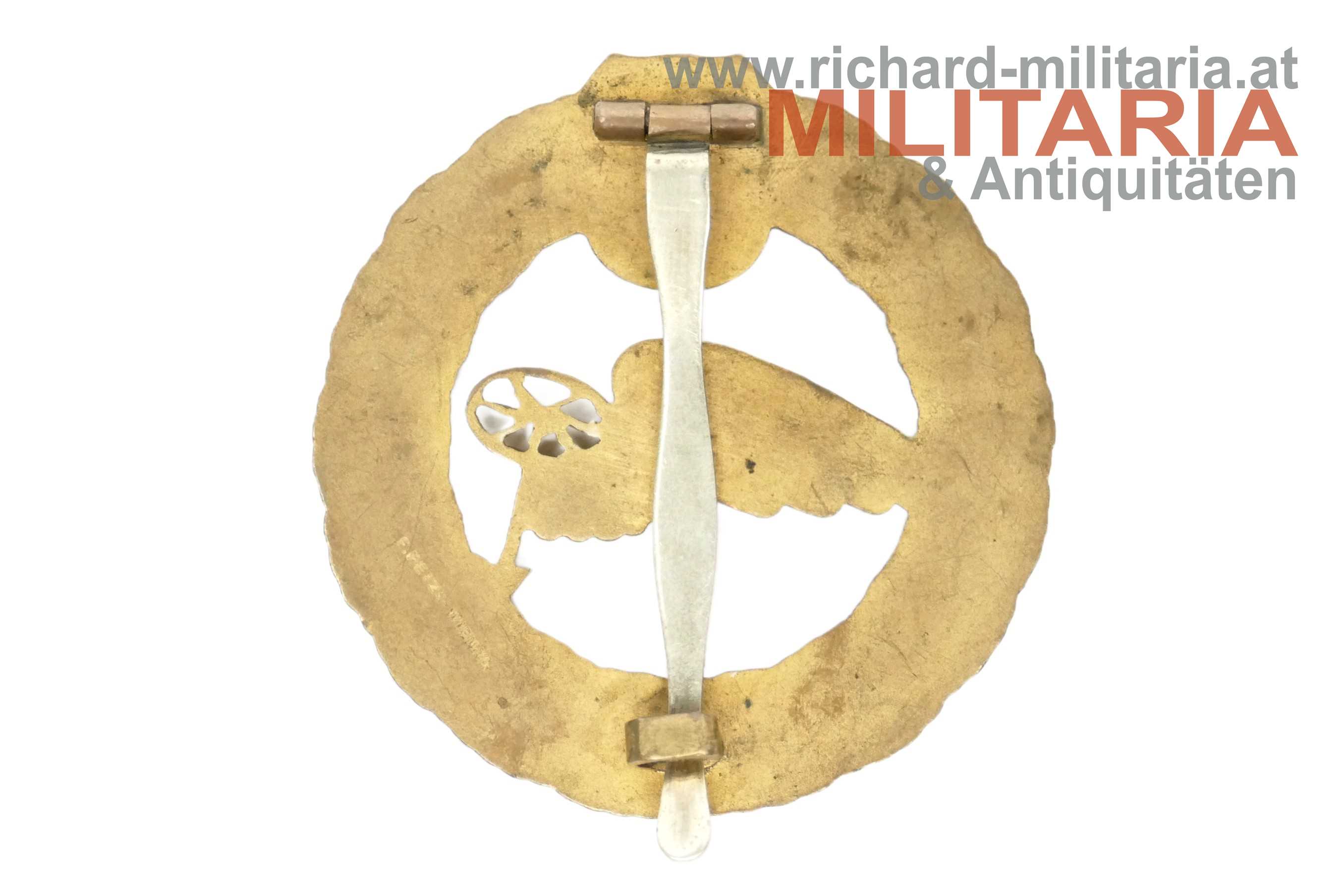 Bundesstaat - Heeres Kraftfahr - Fahrlehrer-Abzeichen; Bronze vergoldet und emailliert; Emaillierung mit zwei minimalen Beschädigungen - mit freiem Auge kaum zu erkennen; revers der Hersteller "F. Petzl - Wien.VI."; originales Nadelsystem;