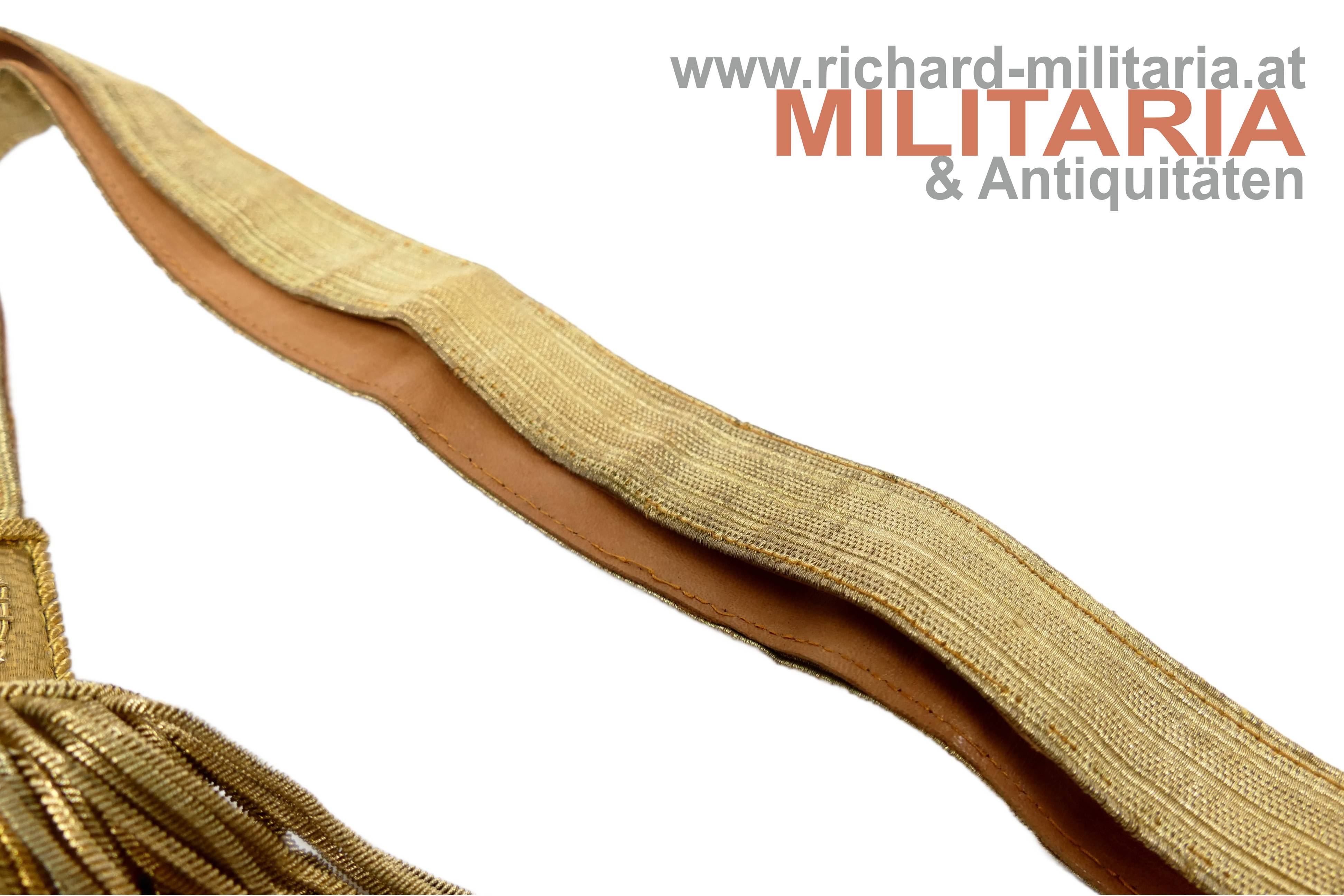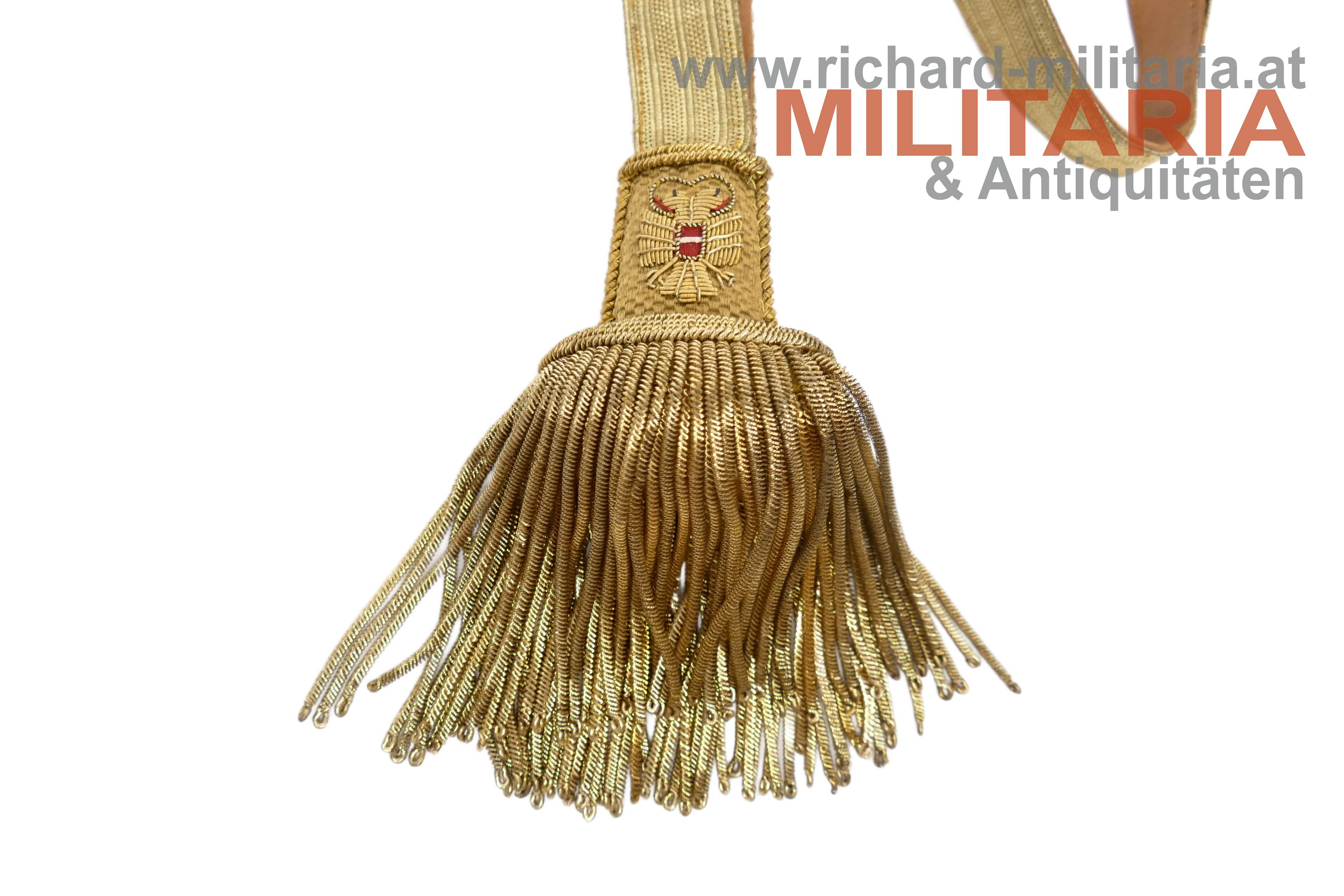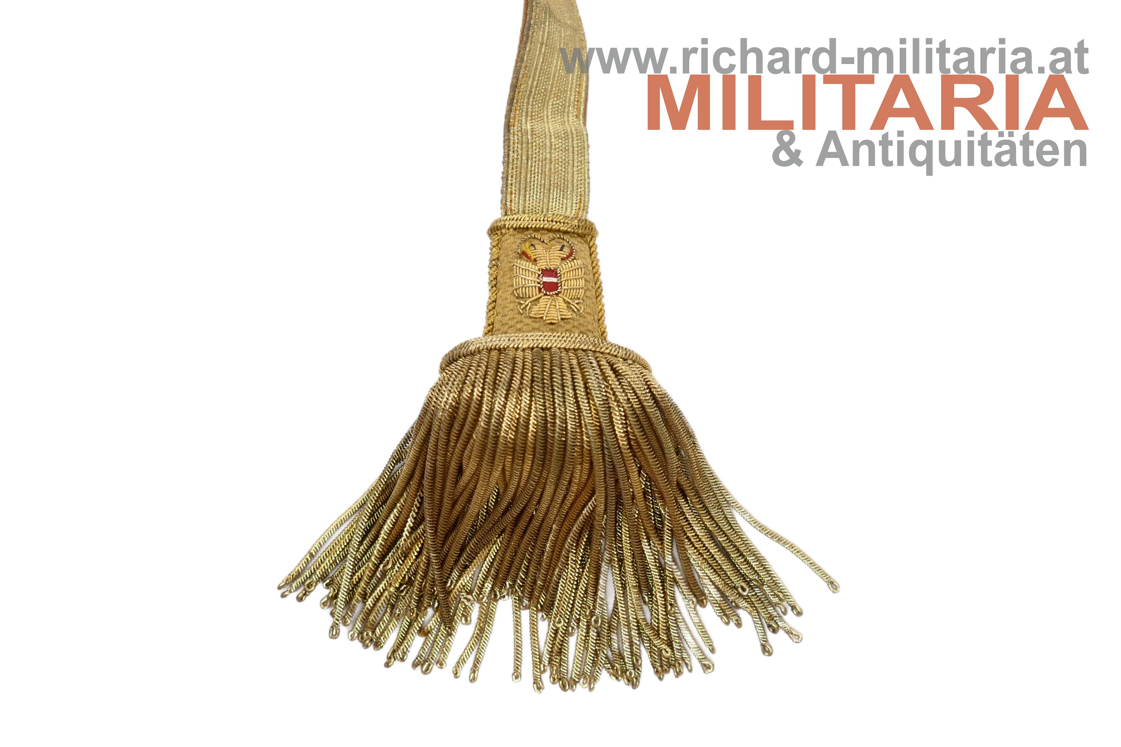 Bundesstaat - Säbel-Portepee für Offiziere; Band, Quastenkopf und verdrillte Quasten aus Goldfaden; Band mit hellbraunem Leder unterfüttert; Naht an manchen Stellen etwas geöffnet; am Quastenkopf beidseitig der Bundesadler aus Goldfaden aufgestickt und das Wappenschild aus rot-weiß-rotem Stoff;