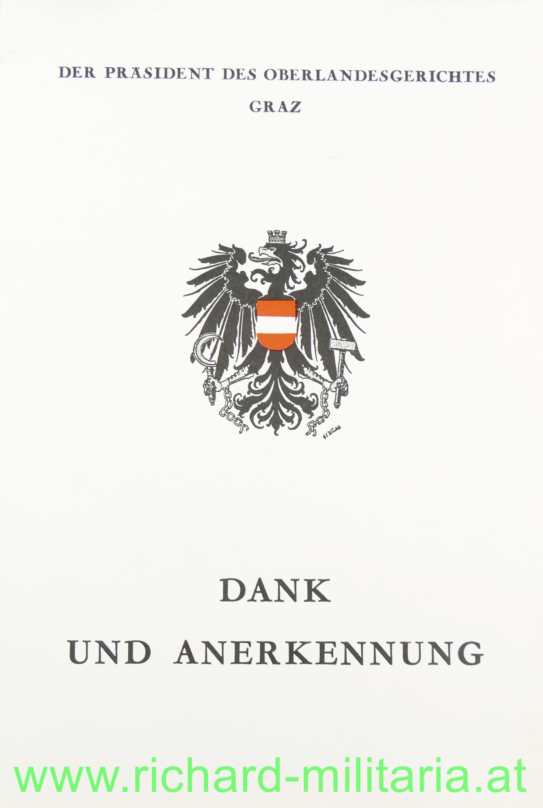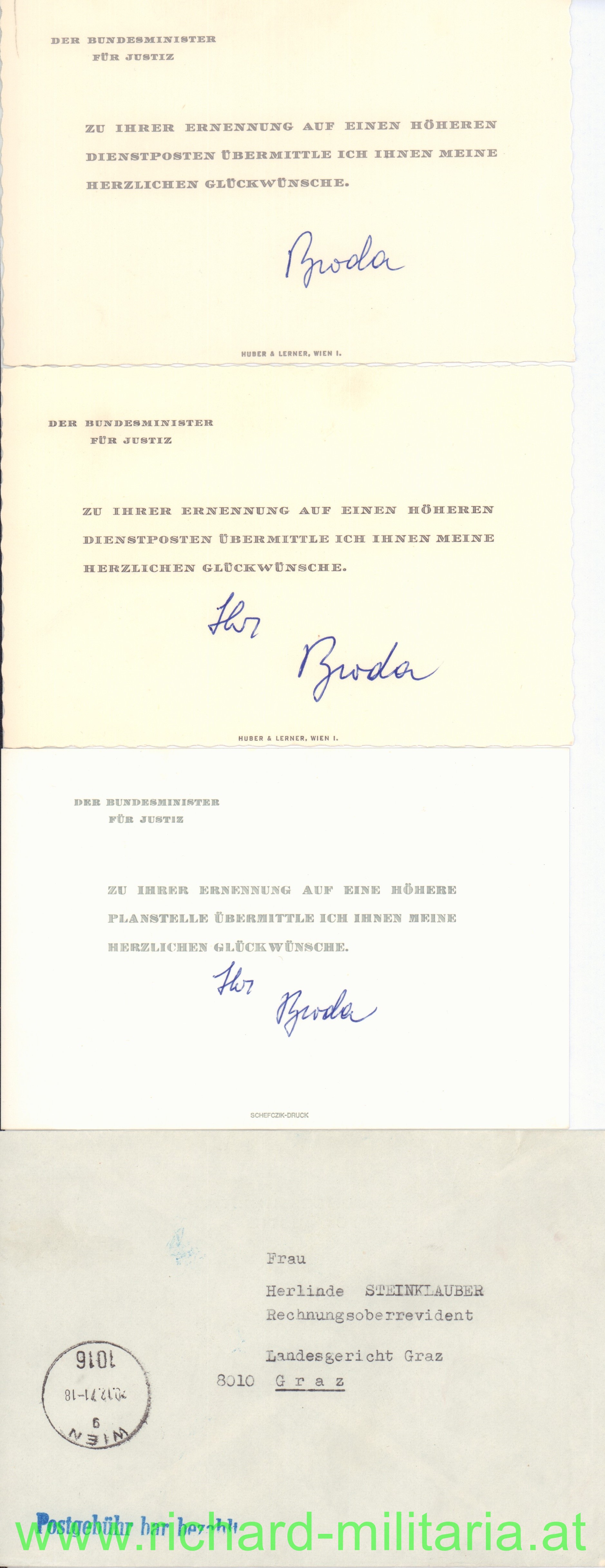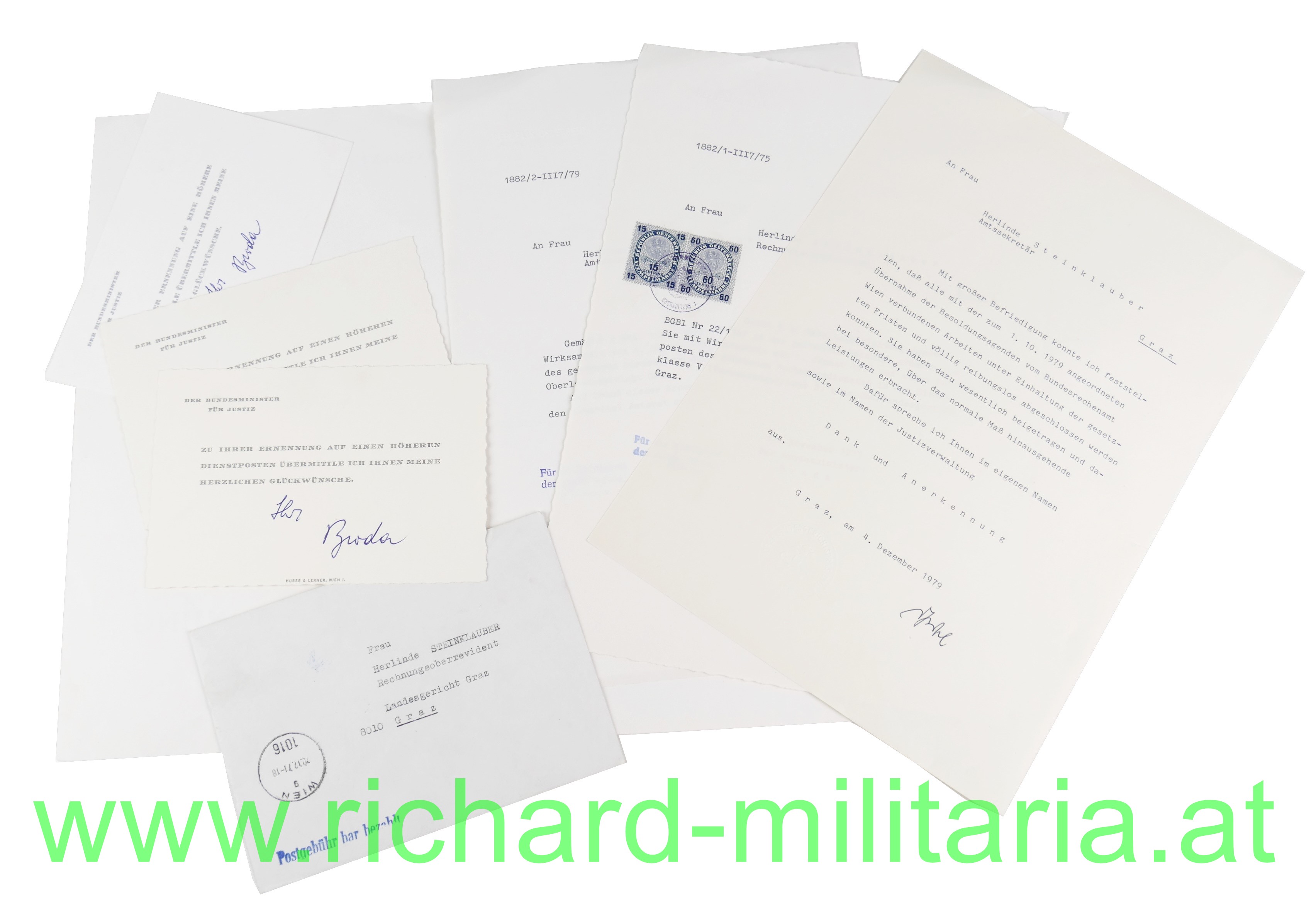 Umschlagmappe "Dank und Anerkennung - Der Präsident des Oberlandesgerichtes Graz" an Herlinde Steinklauber, Amtssekretär; dazu weitere Schreiben