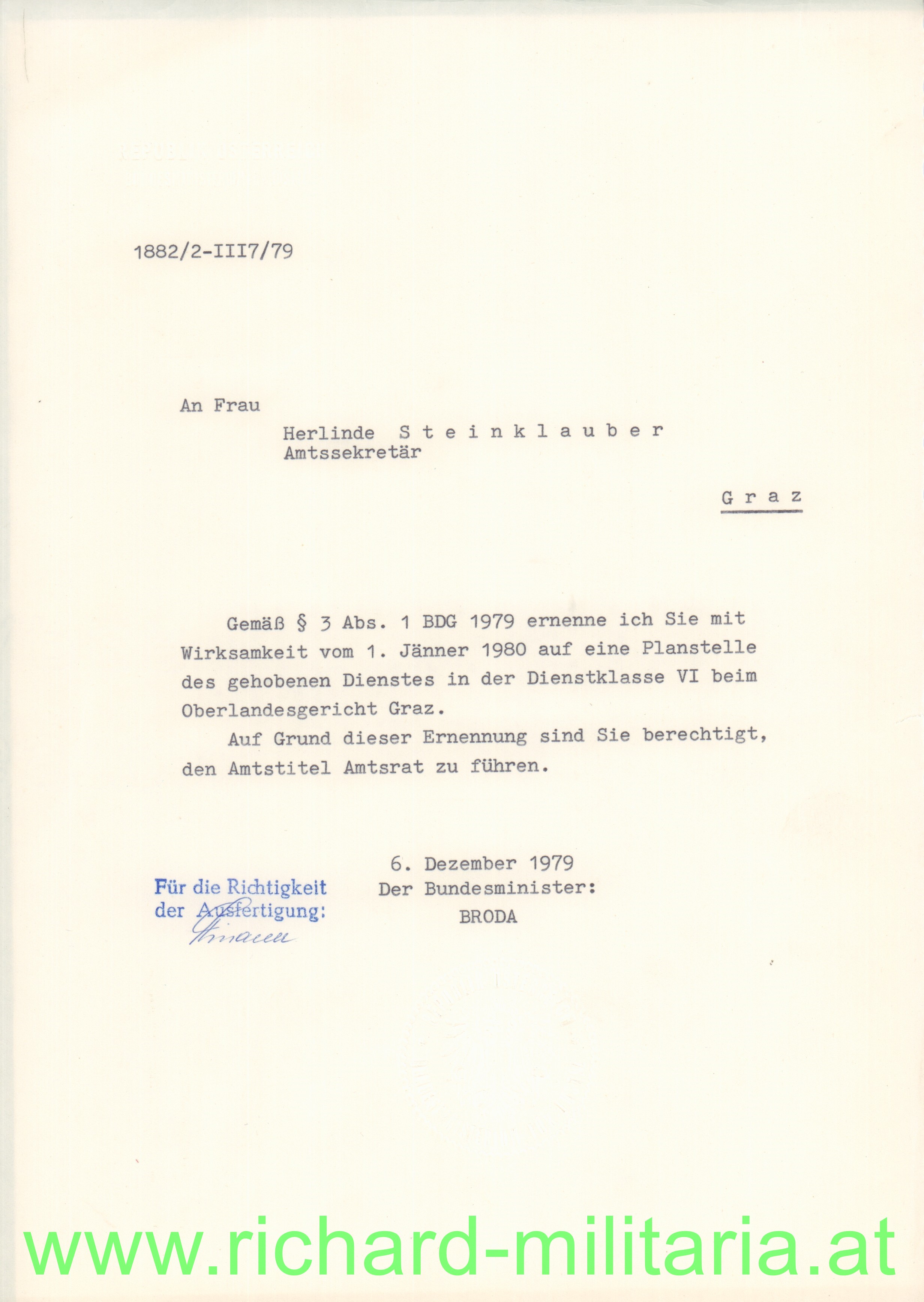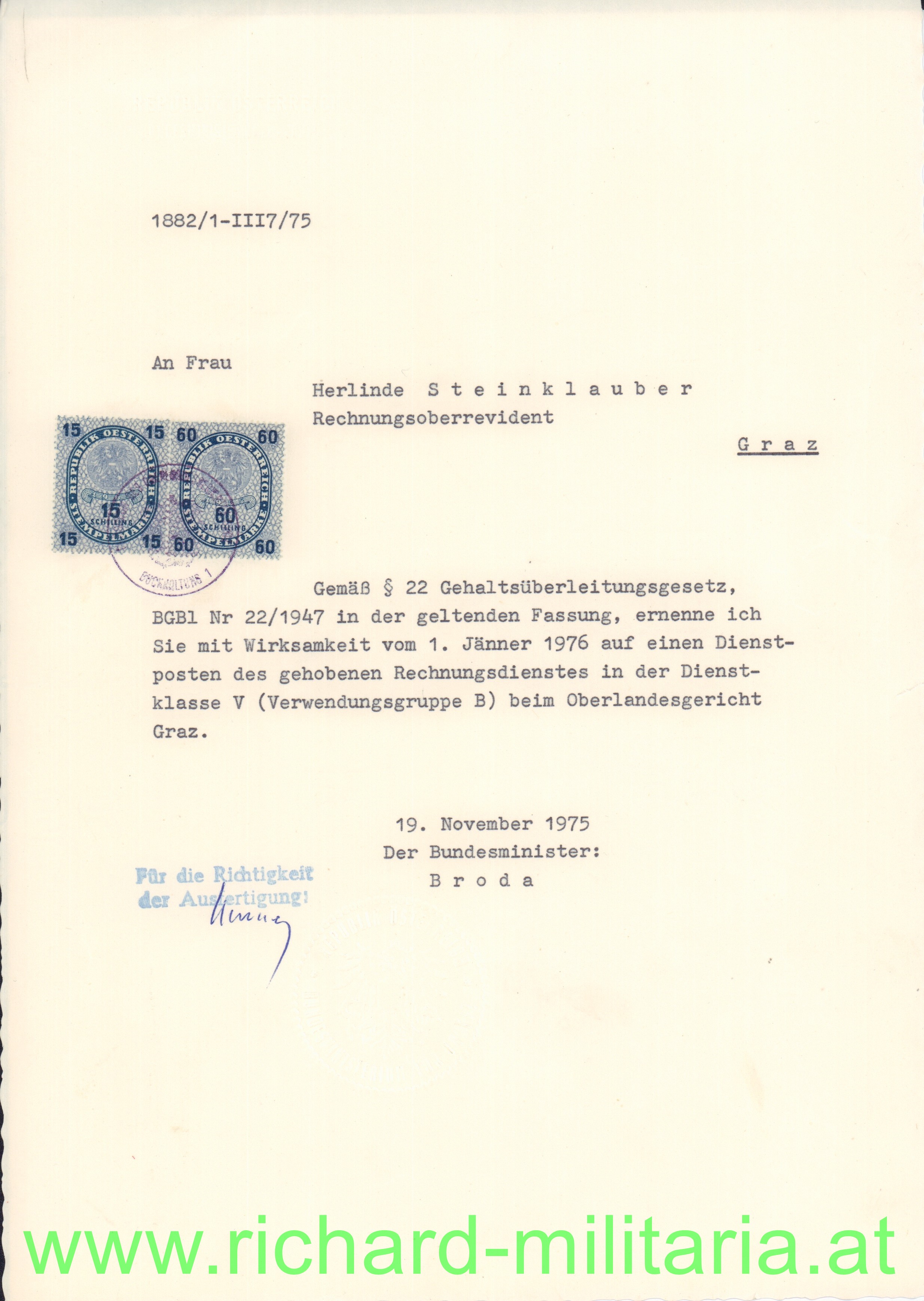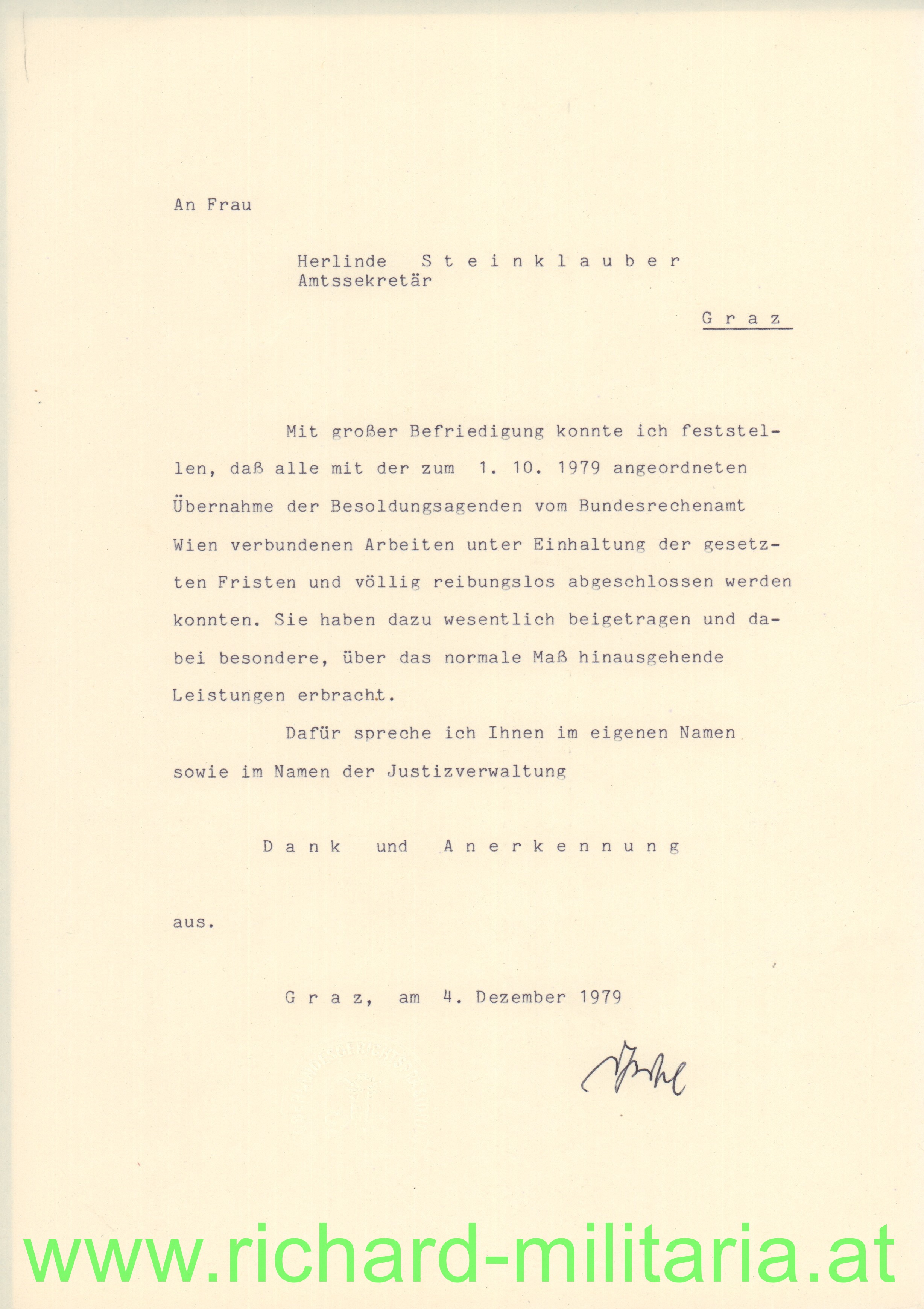 Umschlagmappe "Dank und Anerkennung - Der Präsident des Oberlandesgerichtes Graz" an Herlinde Steinklauber, Amtssekretär; dazu weitere Schreiben