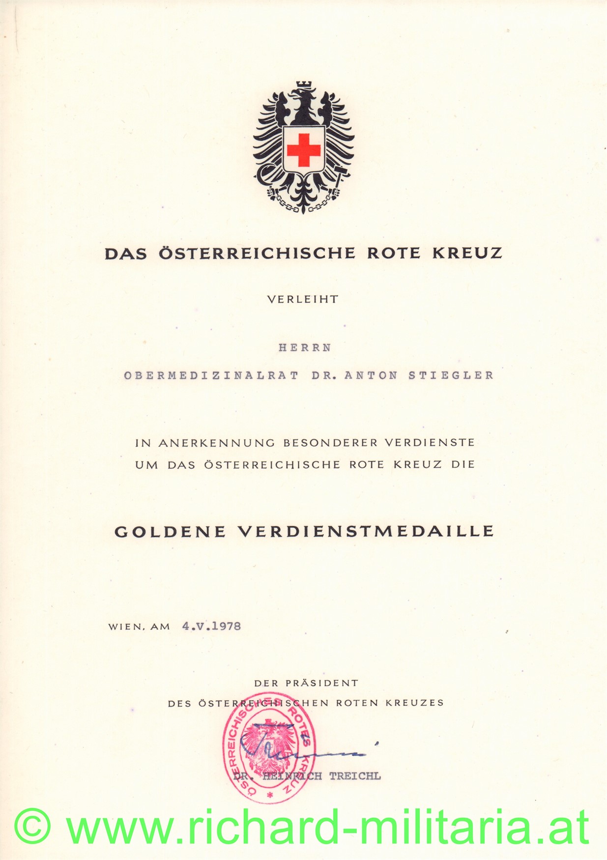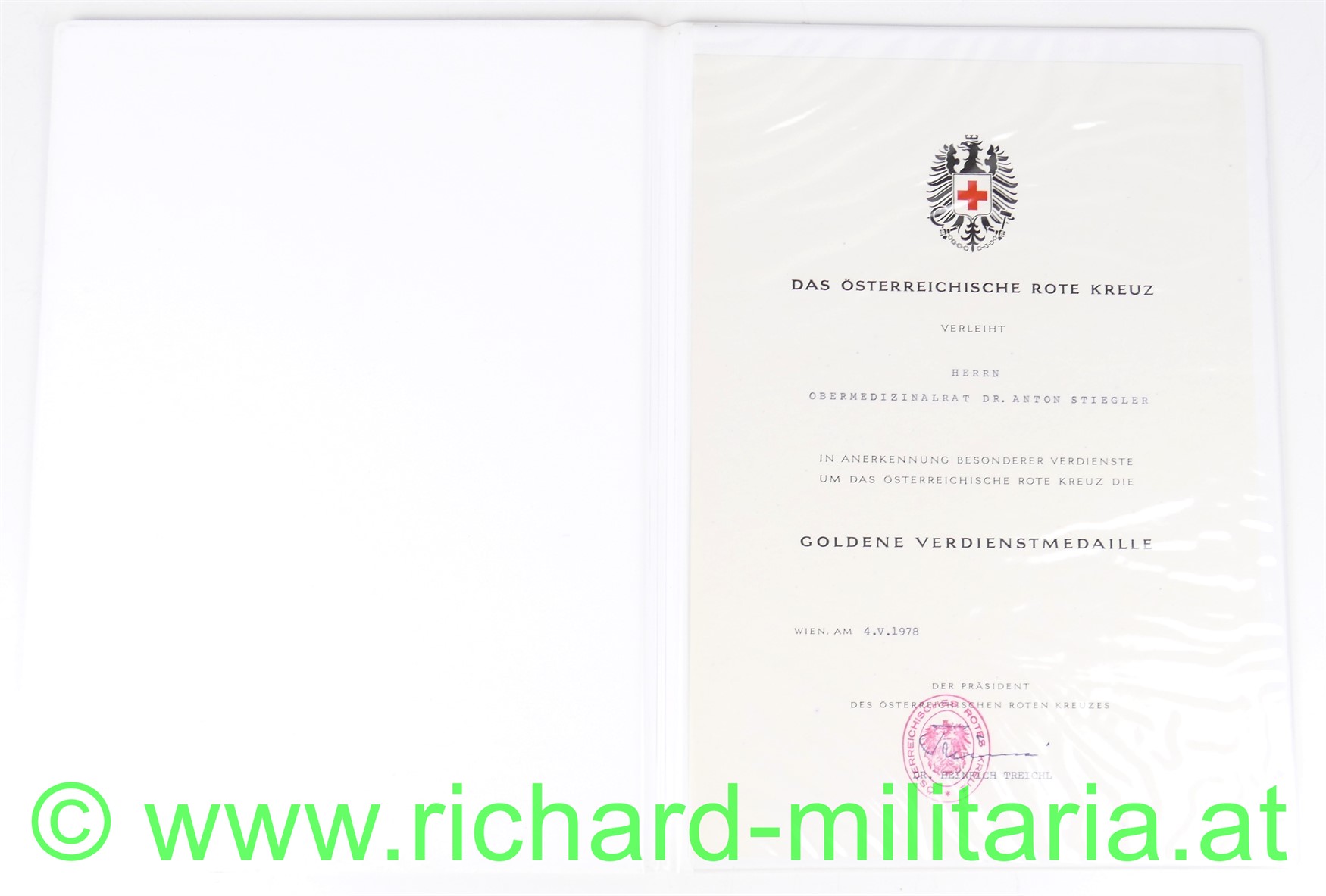 Verleihungsurkunde an Herrn Obermedizinalrat Dr. Anton Stiegler, zur Goldenen Verdienstmedaille; Wien am 4.5.1978, Format A4, mit originaler Verleihungsmappe; sehr guter zustand