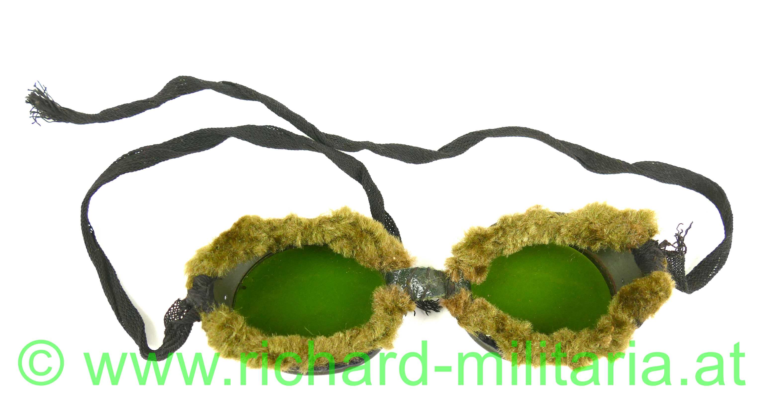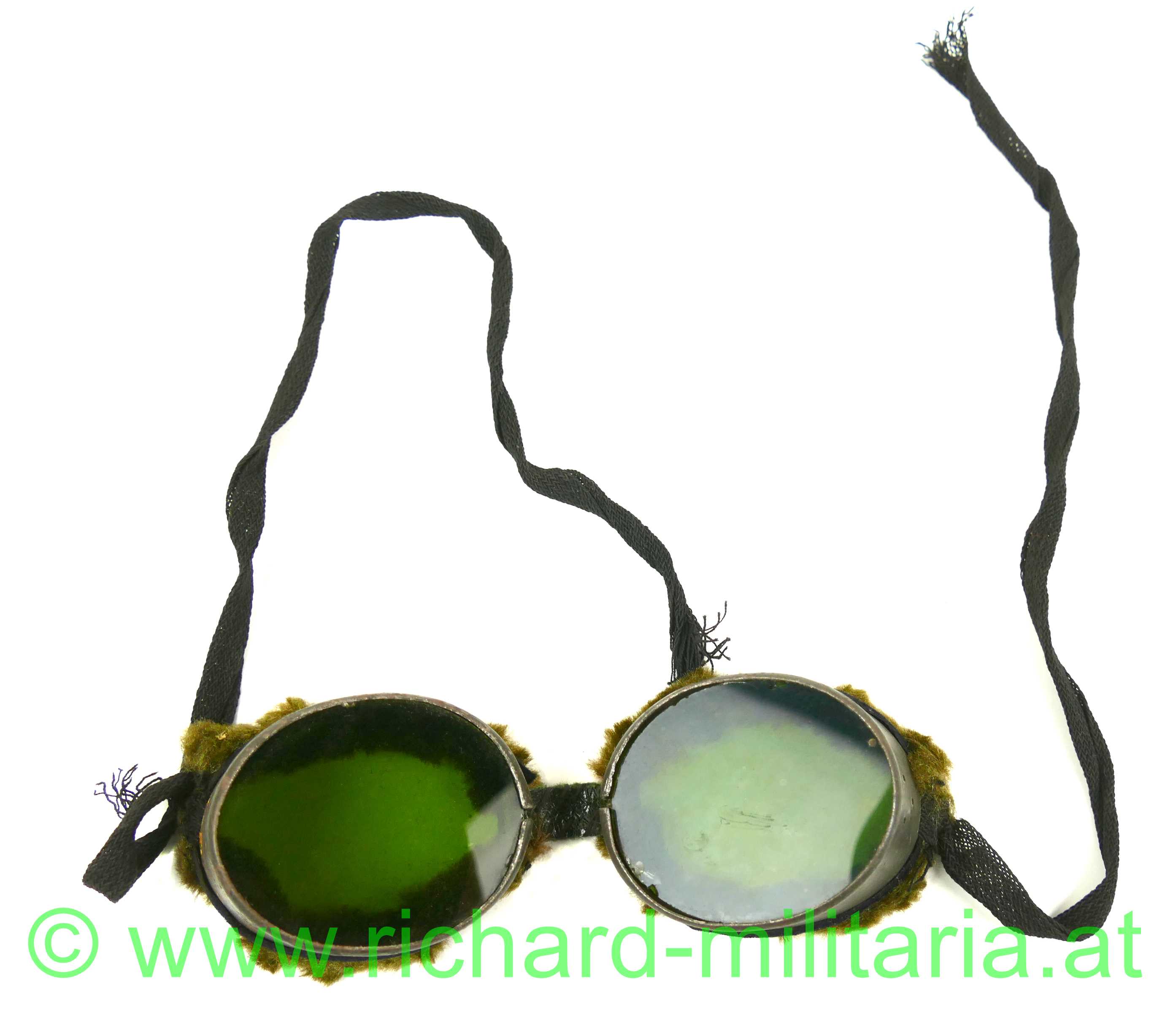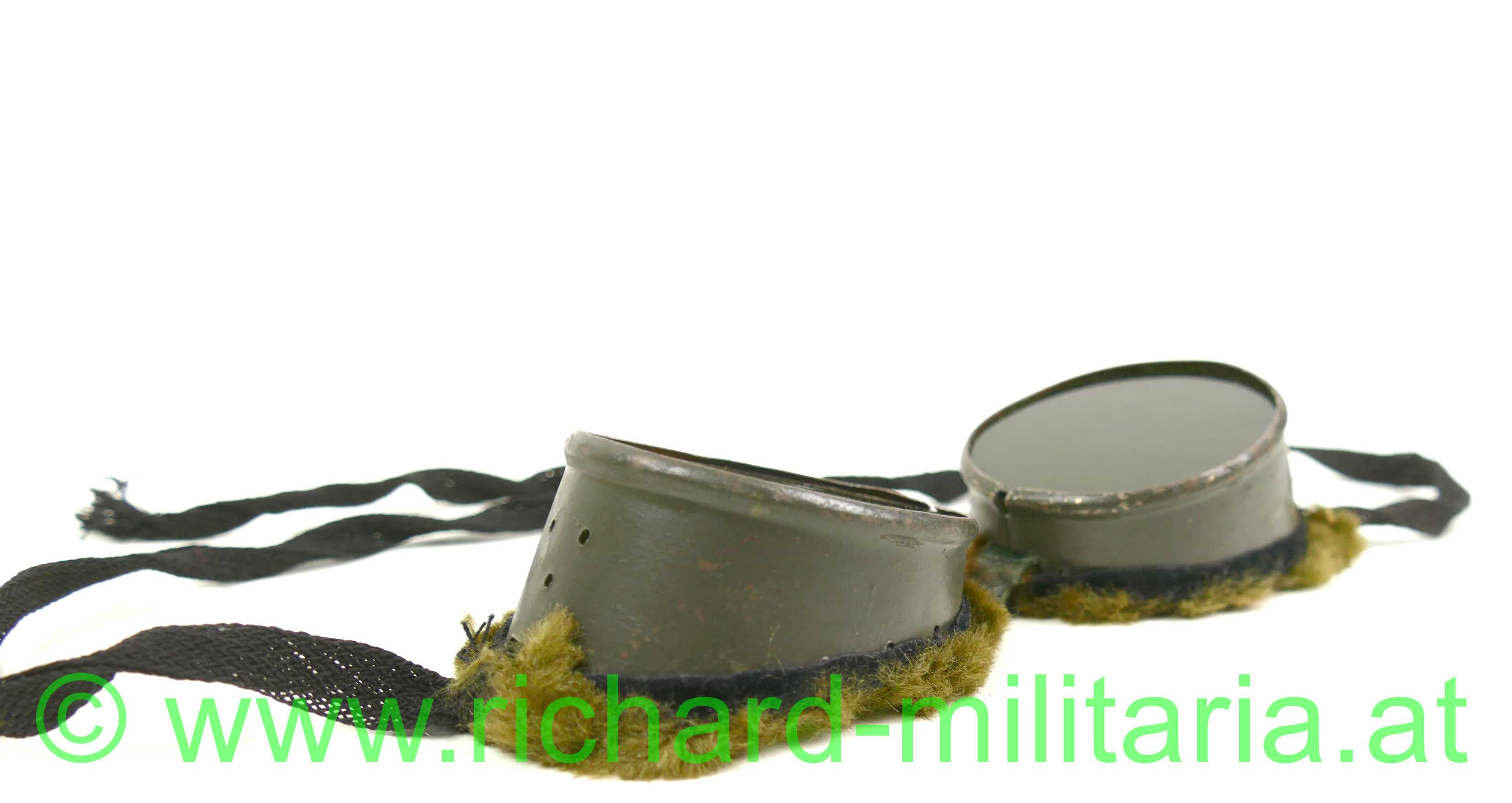 Schneebrille für Gebirgstruppen der österreichisch-ungarischen Armee, feldgrau lackiertes Eisenblech mit eingesetzten grünen Gläsern, Rahmen mit weichem Kunstfell besetzt, Mittelriemen aus Leder handvernäht, schwarze Leinenbänder zur Befestigung,