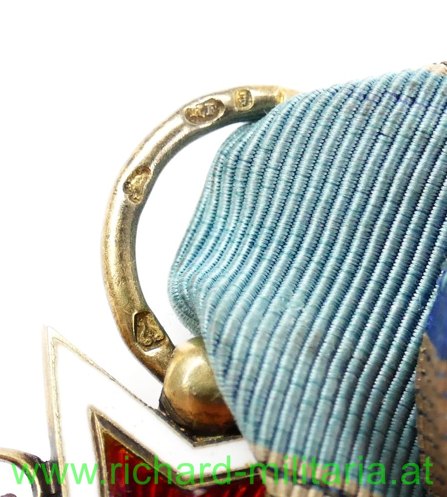 Rumänien - Orden der Krone 1. Modell 1881-1941 - Ritterkreuz ohne Schwerter; Ausgabe mit magnetischer Krone im Medaillon; Ring mehrfach punziert; Silber vergoldet; emailliert; Vergoldung am Avers etwas vergangen, Revers mit intakter Vergoldung; Band mit Bandrosette