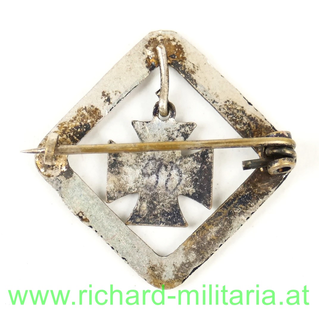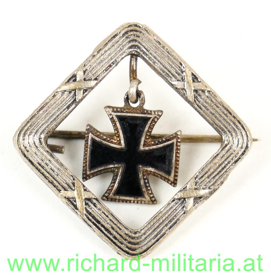 k.u.k. patriotisches Abzeichen -  auf der Spitze stehender quadratischer Rahmen mit eingehängtem emaillierten Eisernen Kreuz; Tombak versilbert, originales Nadelsystem;