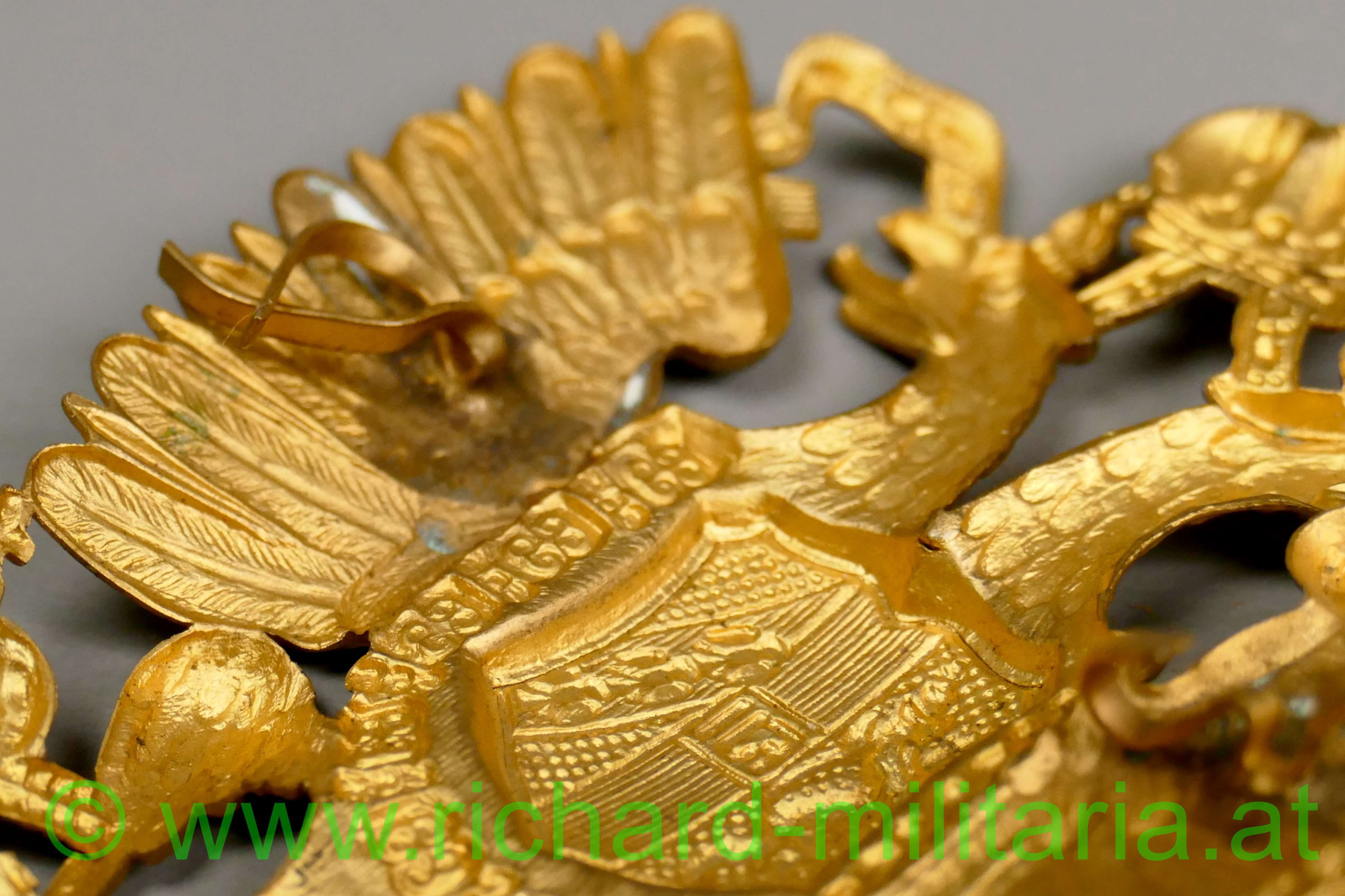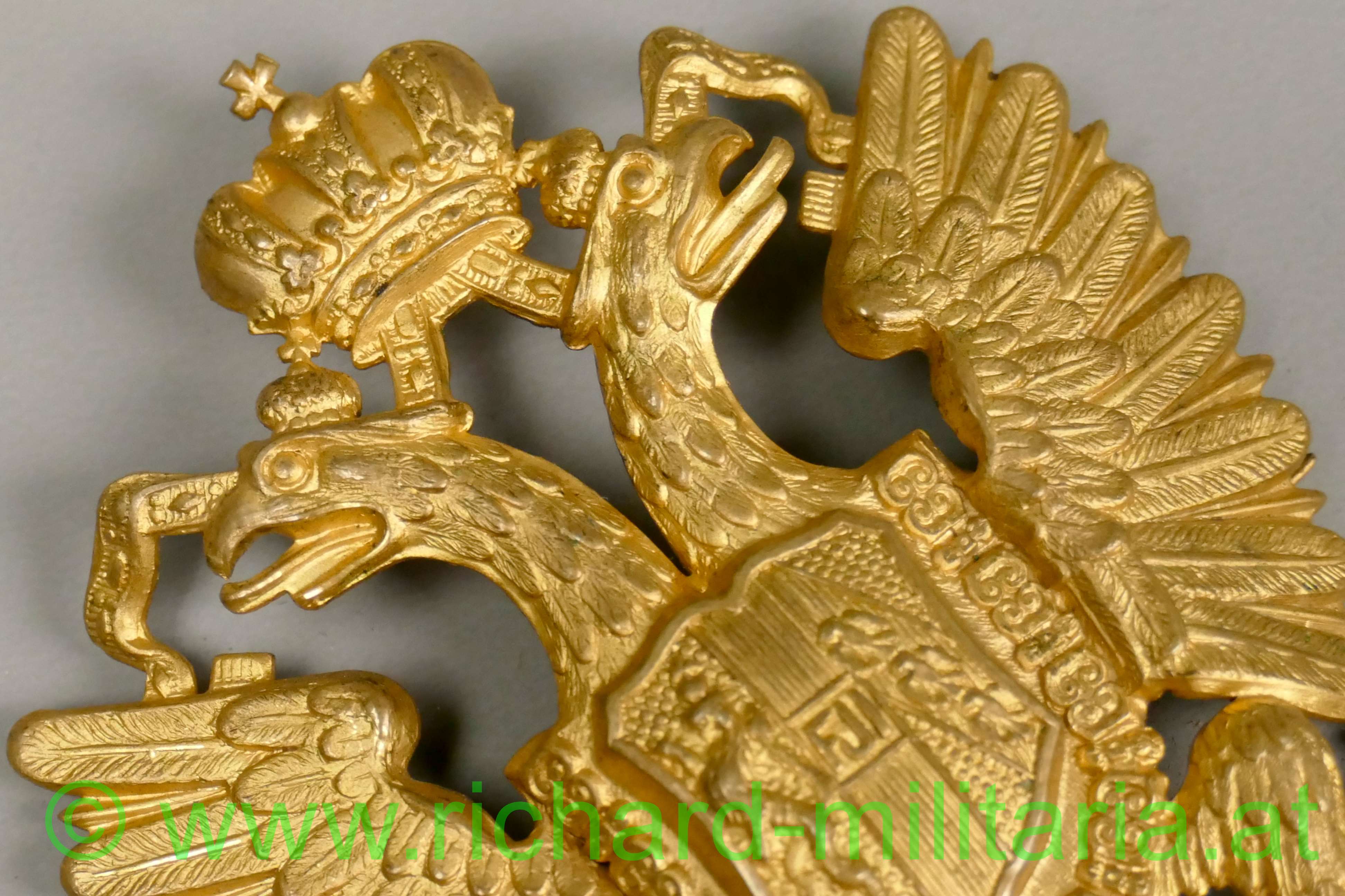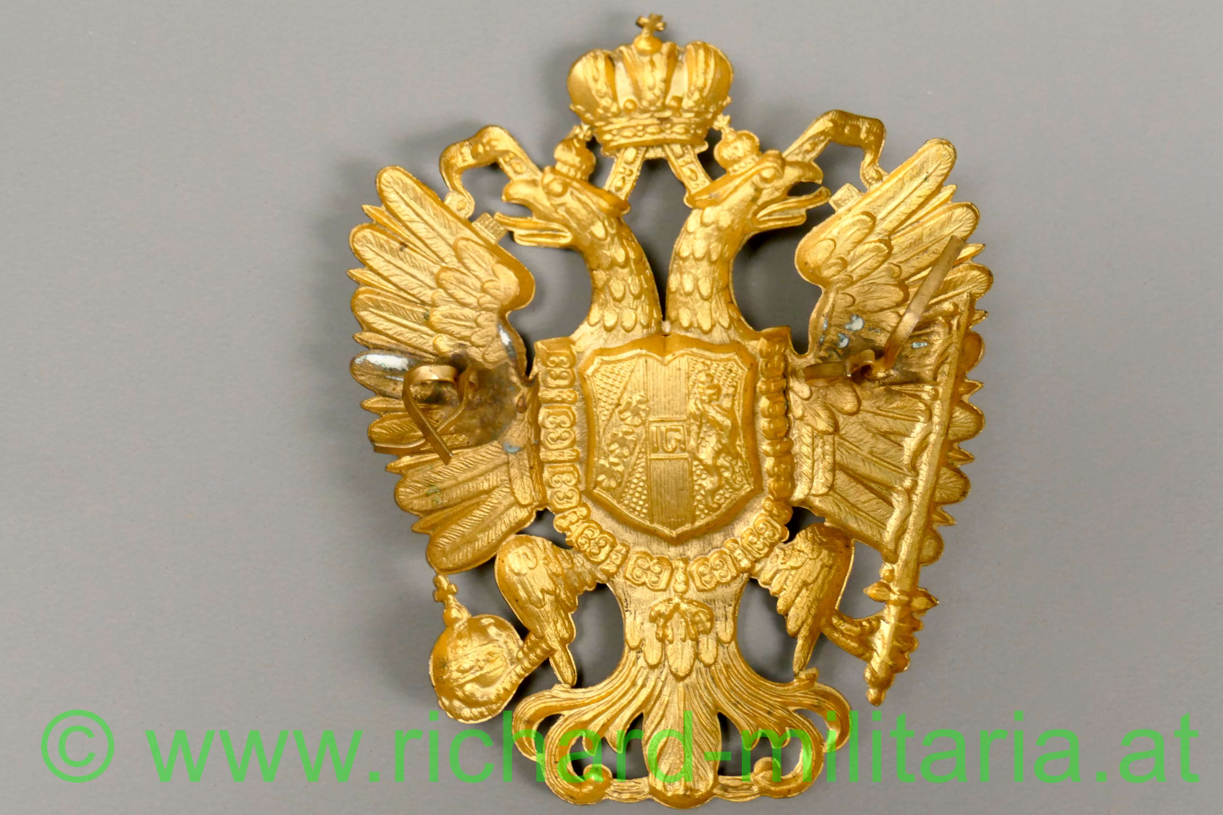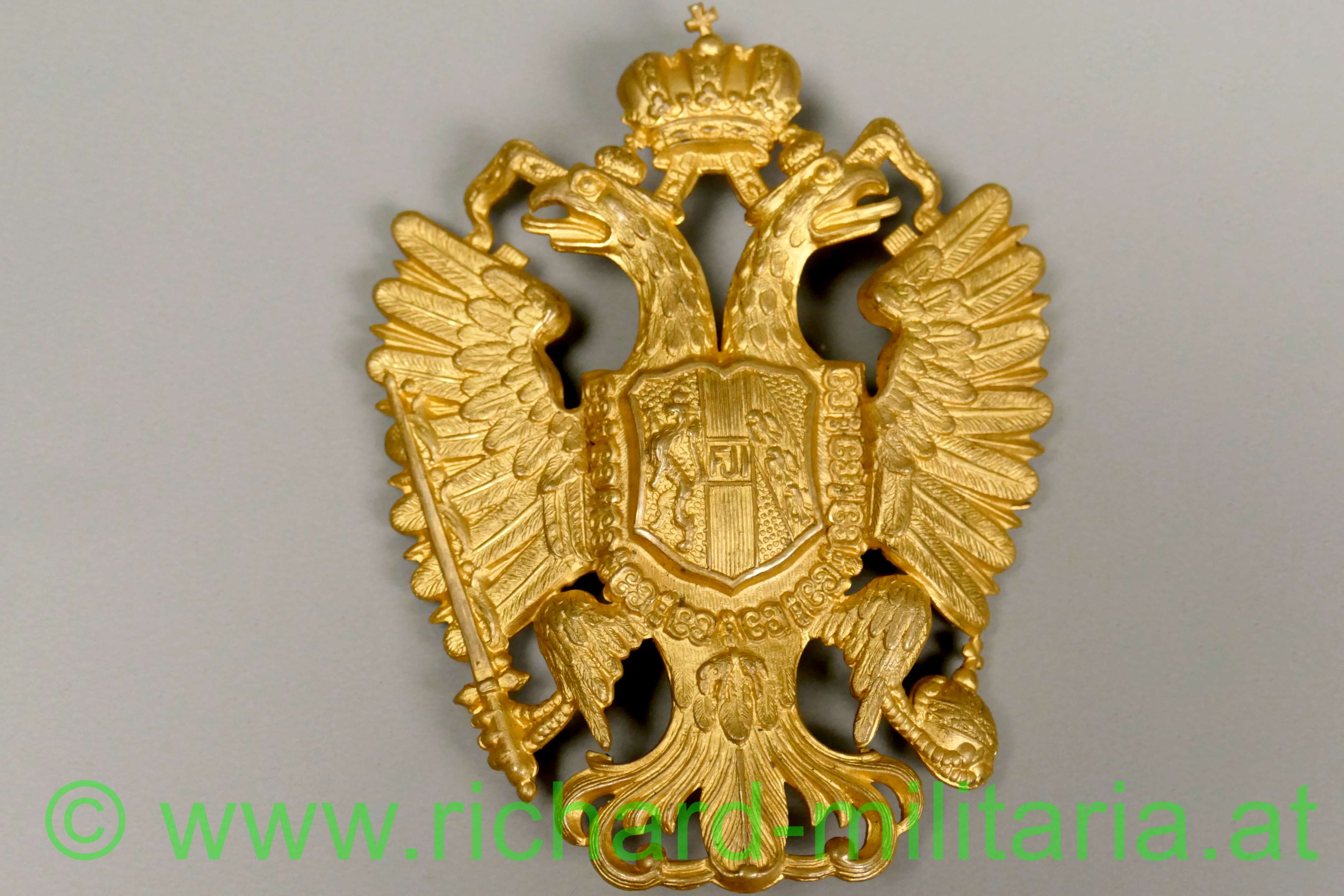 k.u.k. Tschakoadler für Infanterie oder Artillerie; Tombak feuervergoldet; mit dem allerhöchsten Namenszug "FJ1"; Rückseite mit den beiden Doppelsplinten; Zustand 1-2