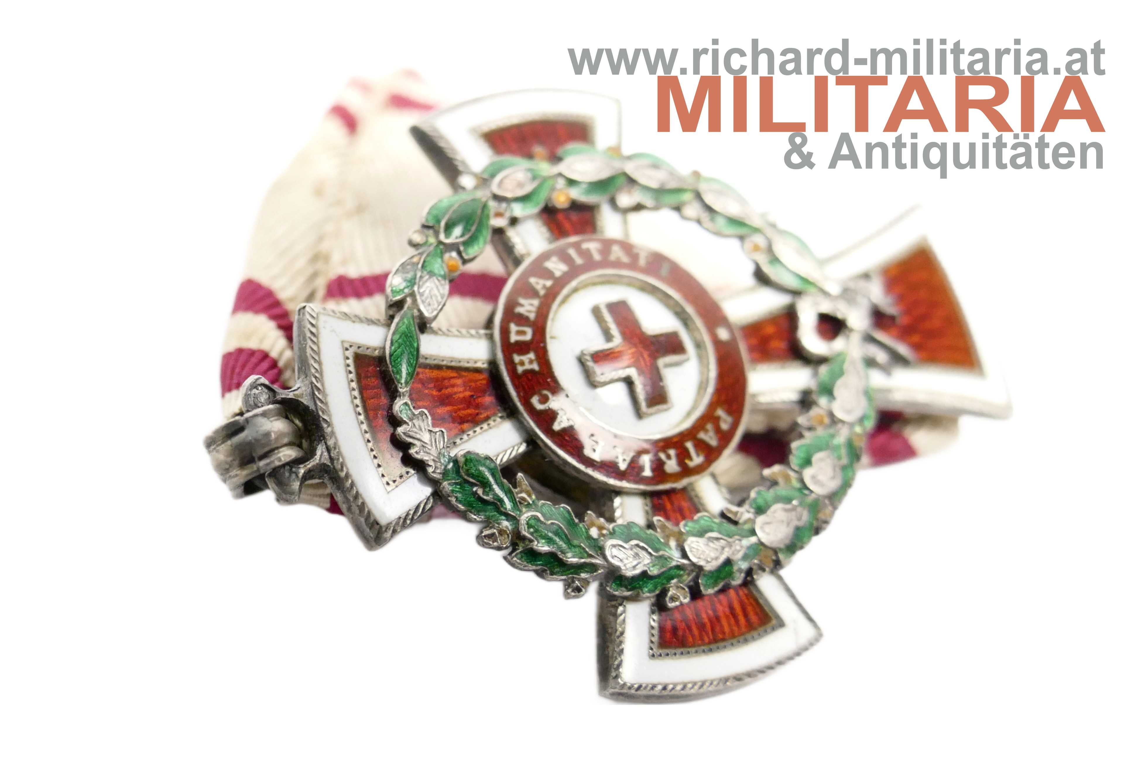 k.u.k. Ehrenzeichen vom Roten Kreuz II. Klasse mit KD; Silber mit Dianakopfpunzierung; getragen mit einigen Emailbeschädigungen in der KD; originales Band