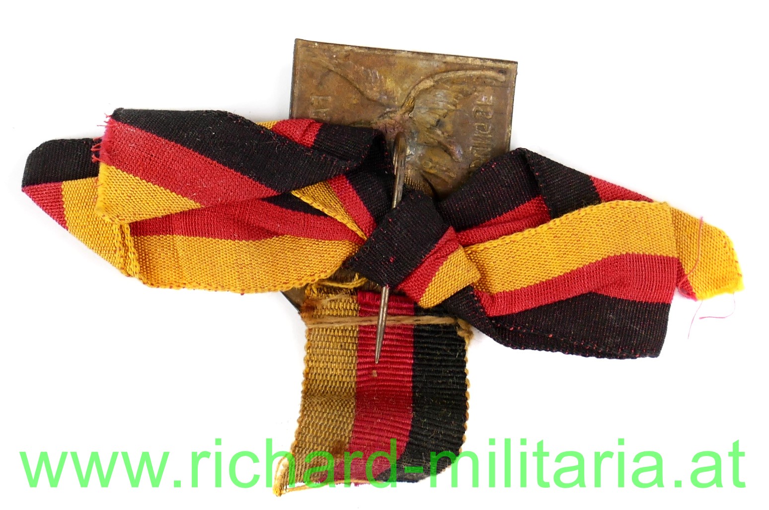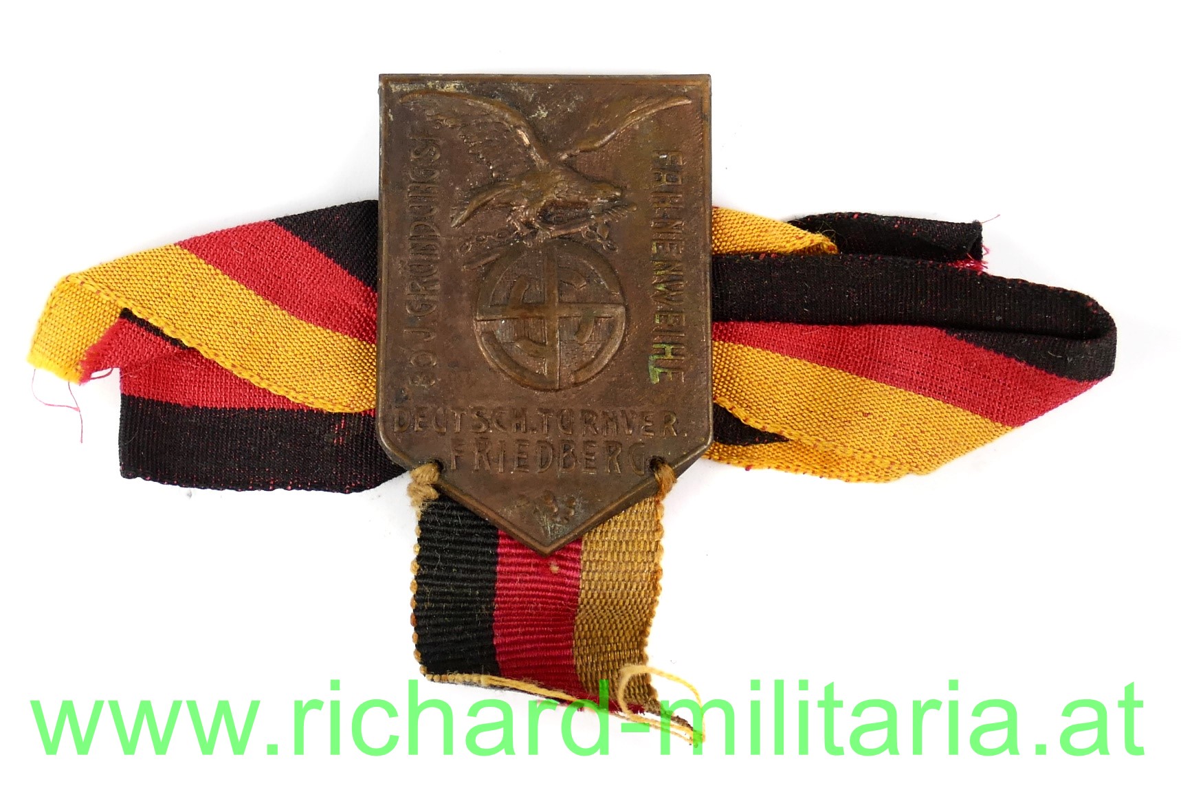 Deutscher Turnerbund Friedberg - 30 J. Gründungsfest - Fahnenweihe, Tombak hohl geprägt bronziert; mit originaler Nadel; hinterlegt mit einer Schlaufe in den Farben schwarz/rot/gold