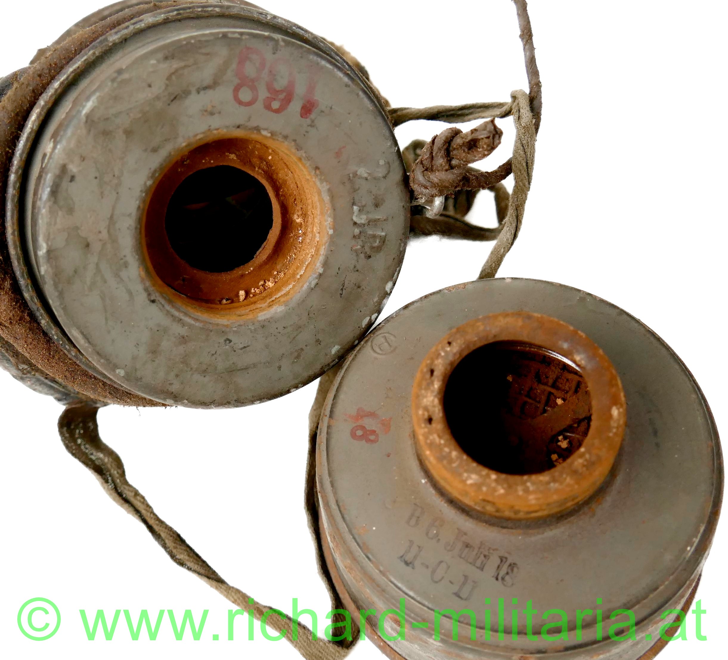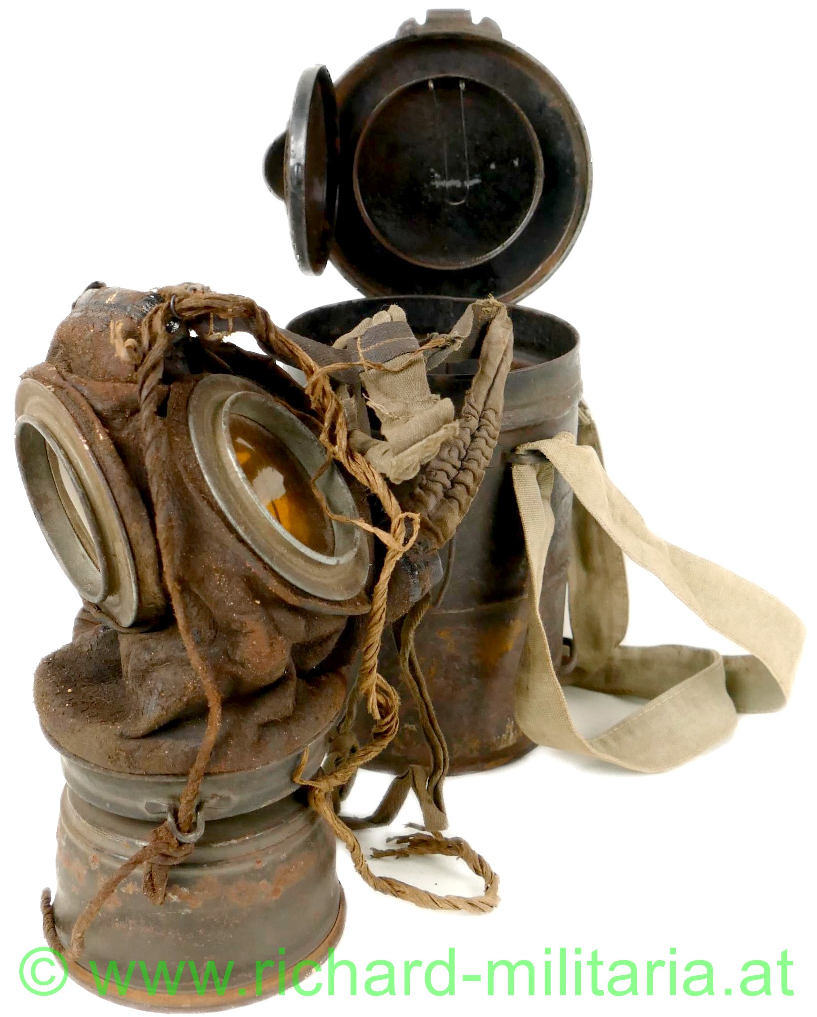 Deutsches Kaiserreich - Gasmaske - komplett mit Dose und Beriemung; Ledermaske bzw. Gasmaske 17, Schafsleder für den Gesichtsbereich, Spiralbänder, Sichtscheiben mit Verstärkungsrahmen und innen liegenden Schutzgittern (1 Schutzgitter fehlt), Behälter mit viel original Farbe, am Deckel personalisiert: "DIETRICH", Verschlussmechanismus voll funktionsfähig, Trageriemen aus olivgrünem Leinen; Ersatzgläser fehlen, Filter mit Hersteller und Fertigungsdatum versehen,