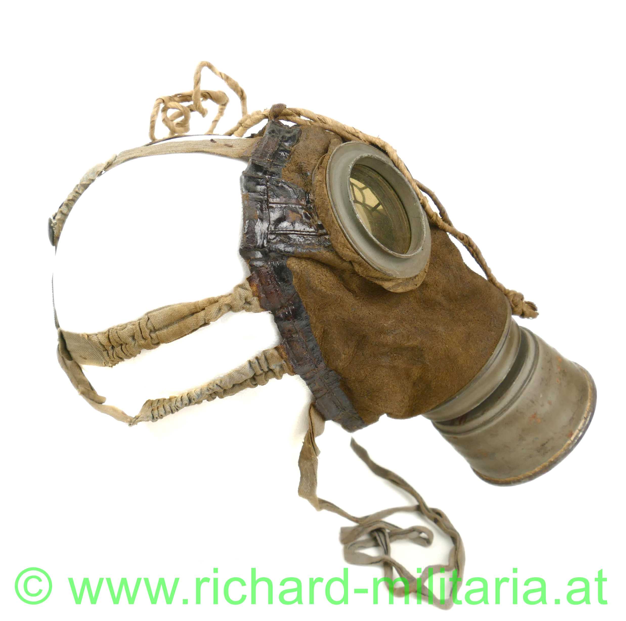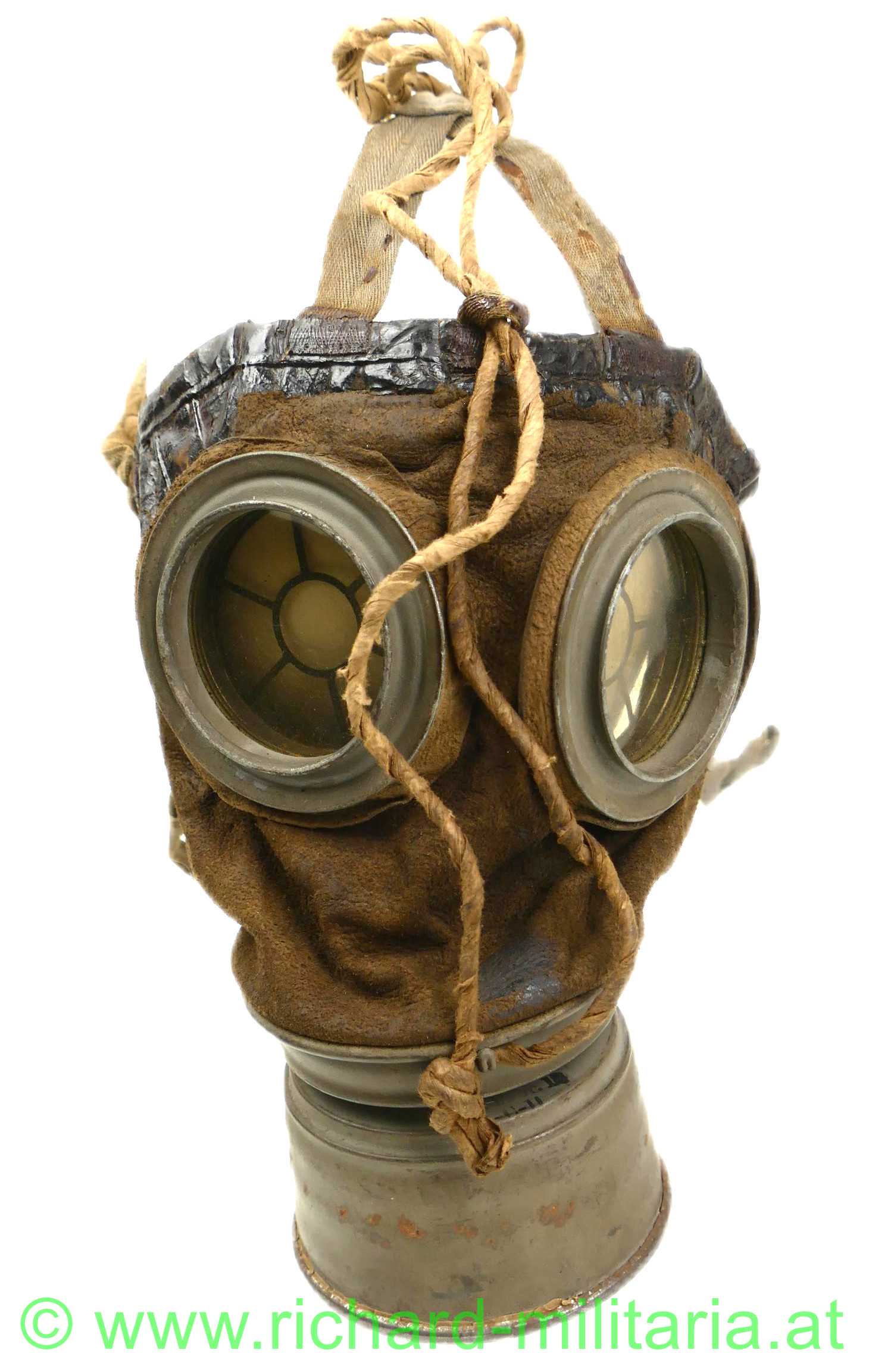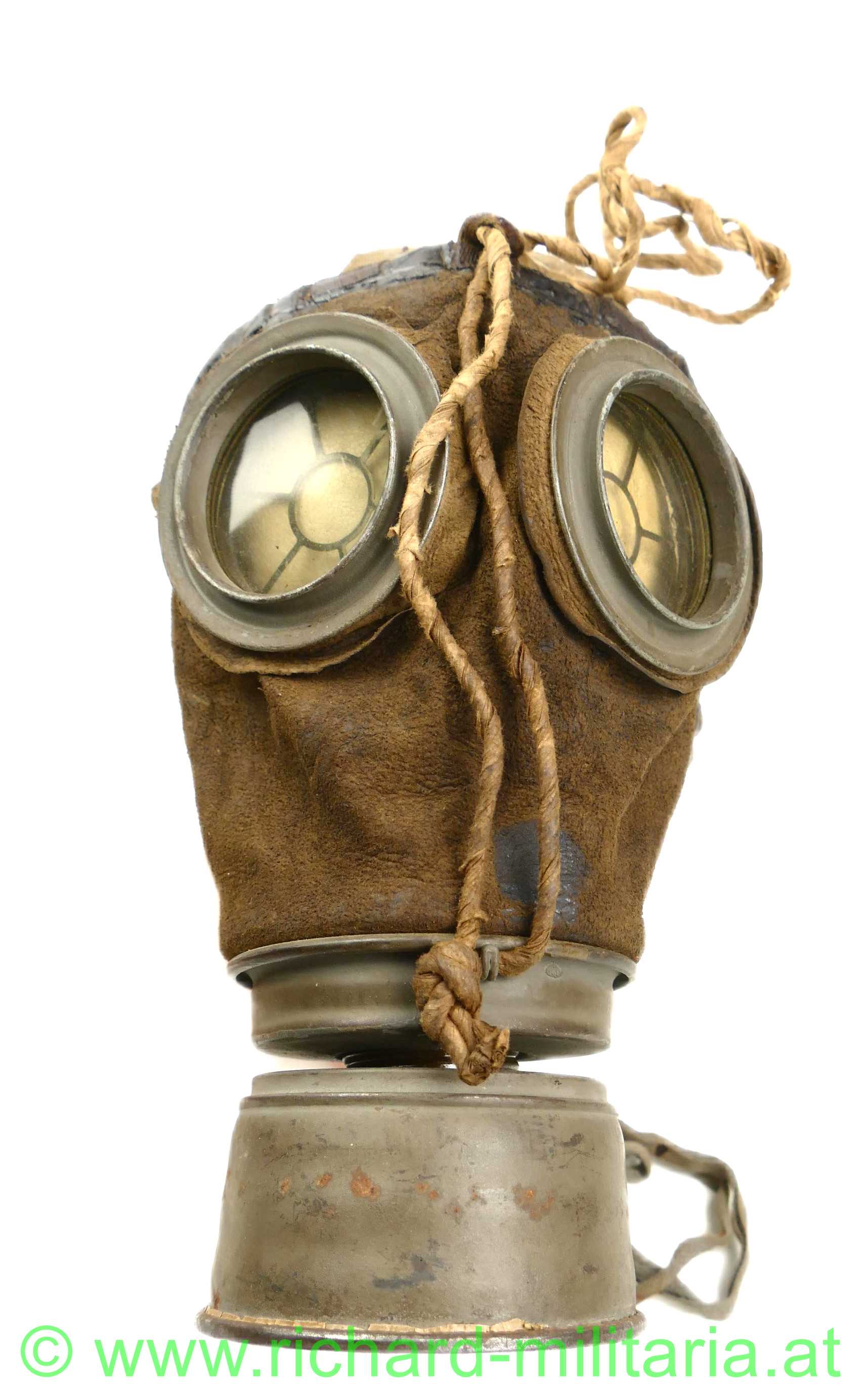 Deutsches Kaiserreich - Gasmaske - komplett mit Dose und Beriemung; Ledermaske 17 / Gasmaske 17, Schafsleder für den Gesichtsteil, Spiralbänder, Sichtscheiben mit Verstärkungsrahmen und innen liegenden Schutzgittern, Behälter mit 95 % original Farbe mit Leinenberiemung und Lederabschluss, originale Ersatzgläser im Cellophan; Filter ist Hersteller u. mit Fertigungsdatum versehen;
