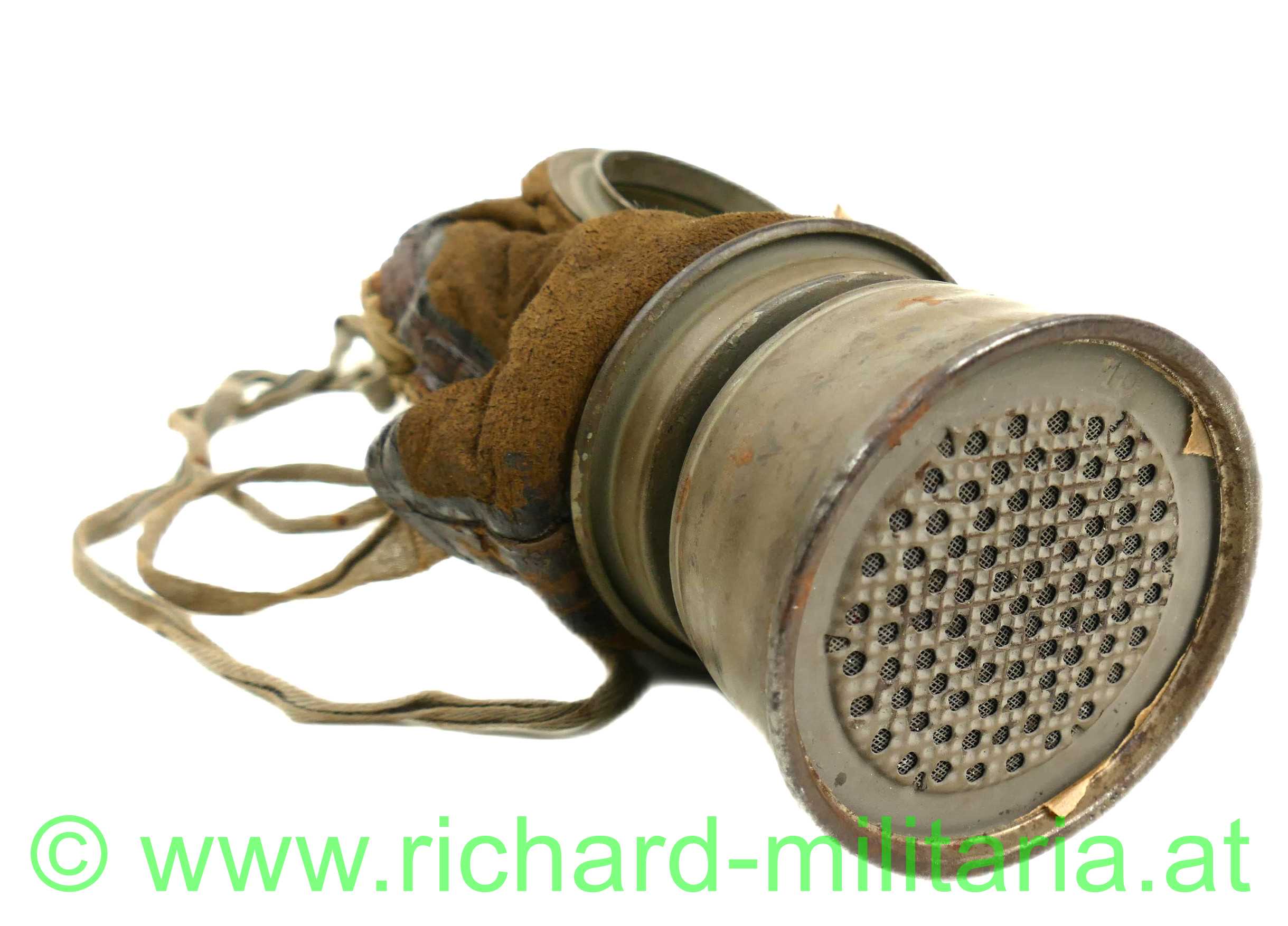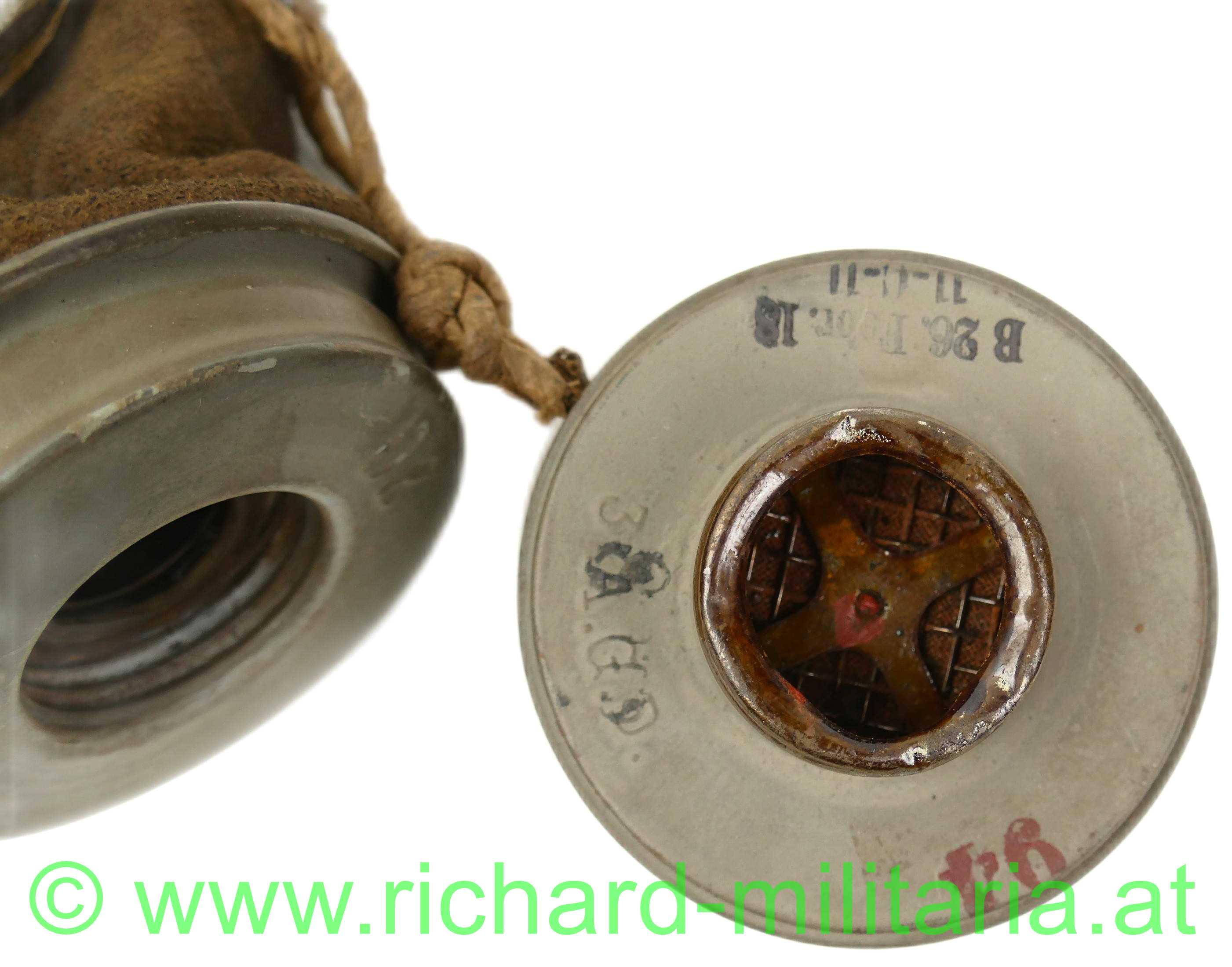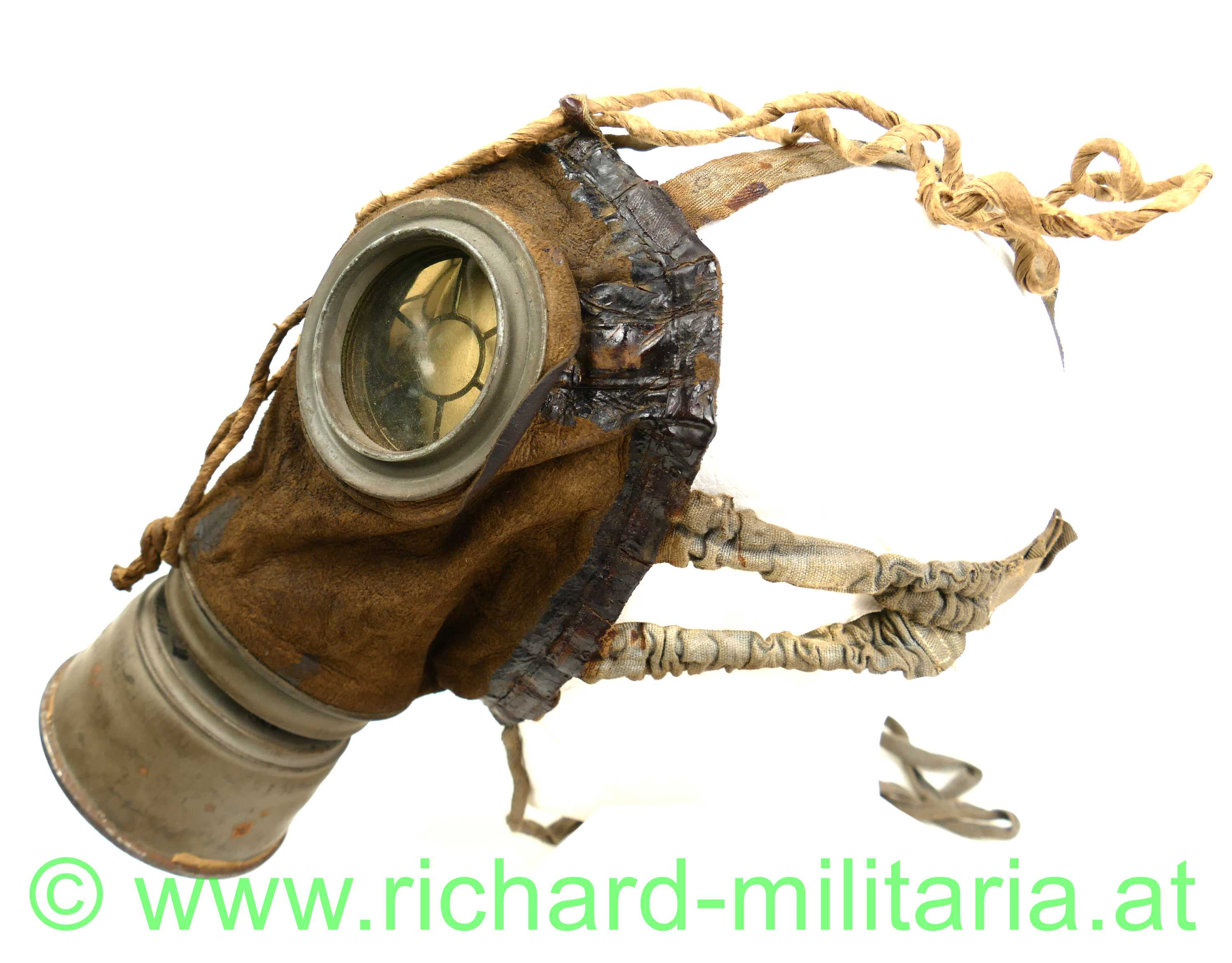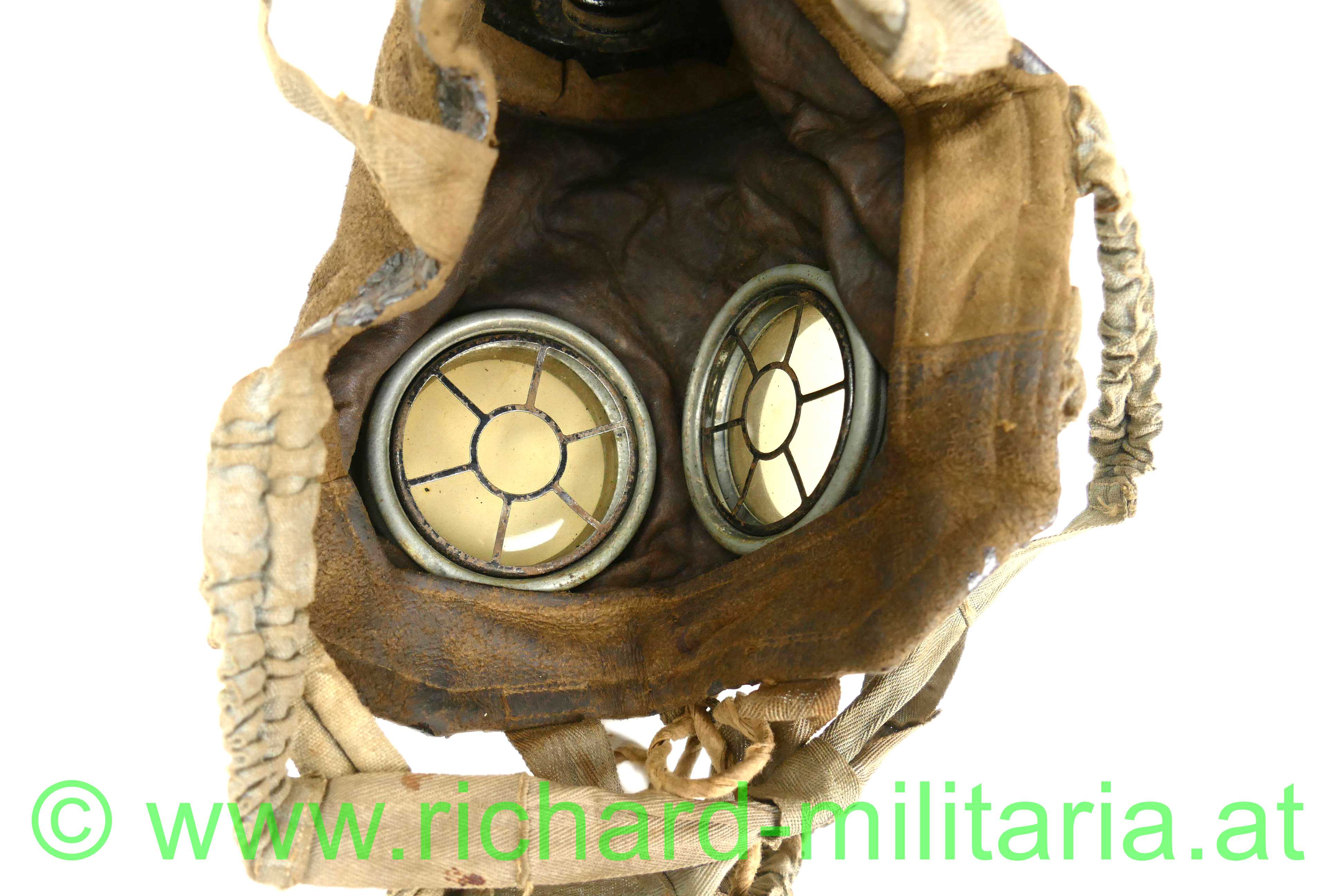 Deutsches Kaiserreich - Gasmaske - komplett mit Dose und Beriemung; Ledermaske 17 / Gasmaske 17, Schafsleder für den Gesichtsteil, Spiralbänder, Sichtscheiben mit Verstärkungsrahmen und innen liegenden Schutzgittern, Behälter mit 95 % original Farbe mit Leinenberiemung und Lederabschluss, originale Ersatzgläser im Cellophan; Filter ist Hersteller u. mit Fertigungsdatum versehen;
