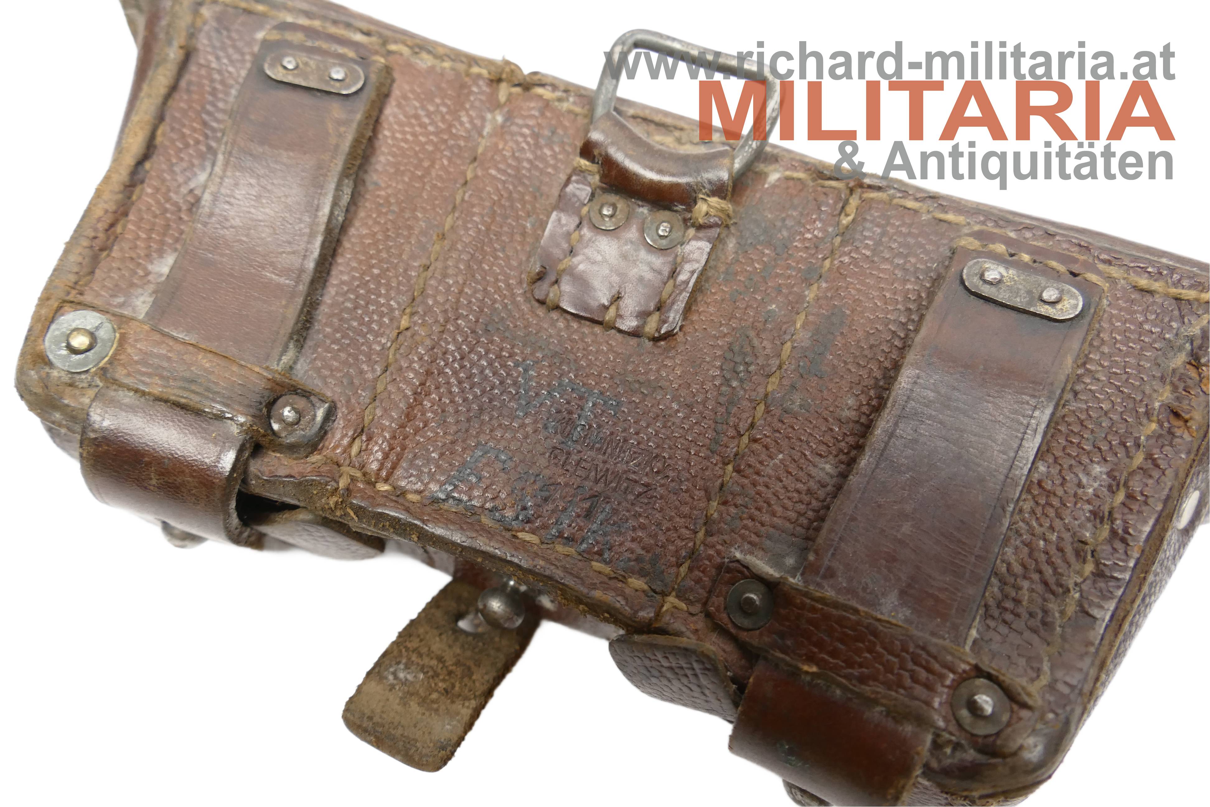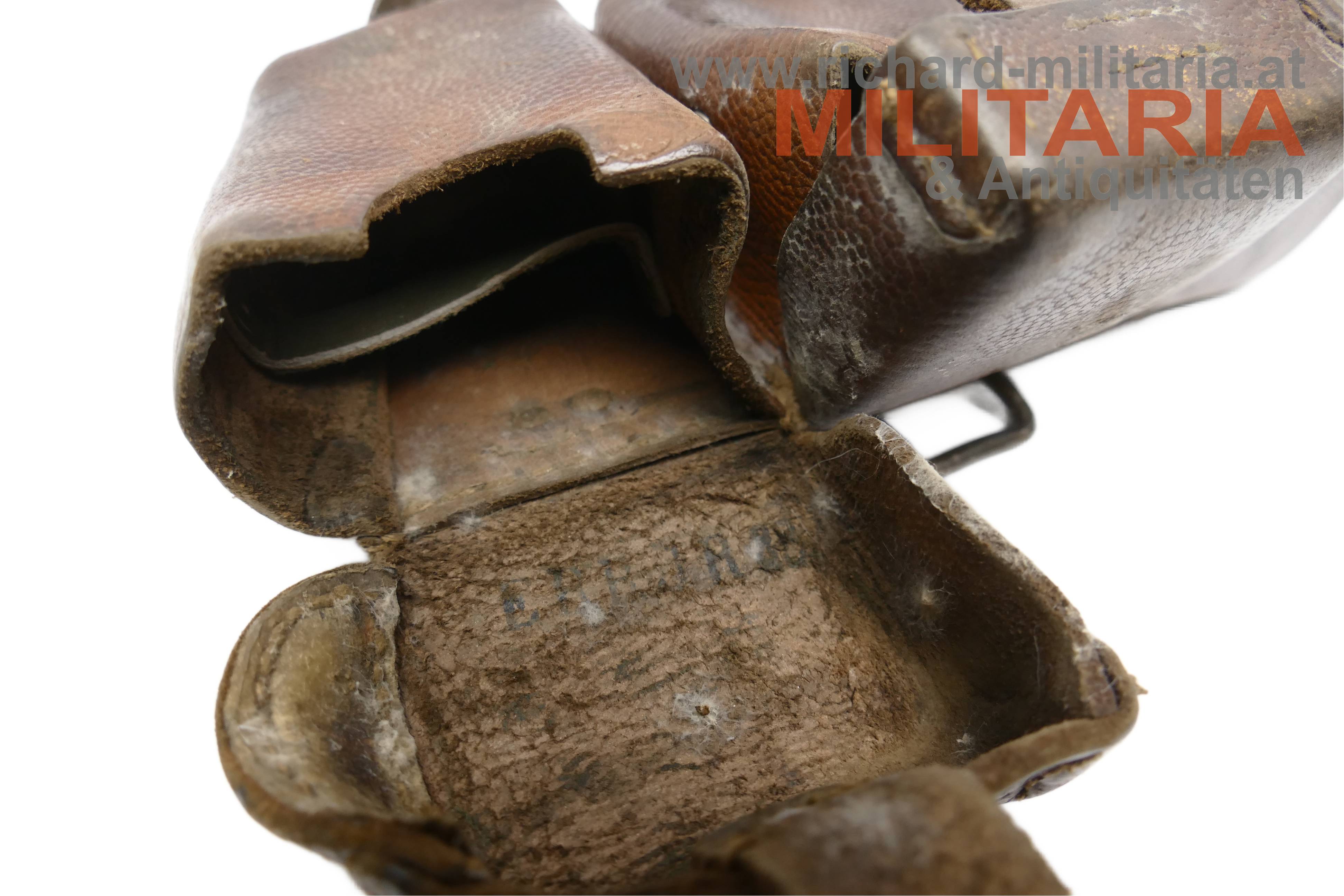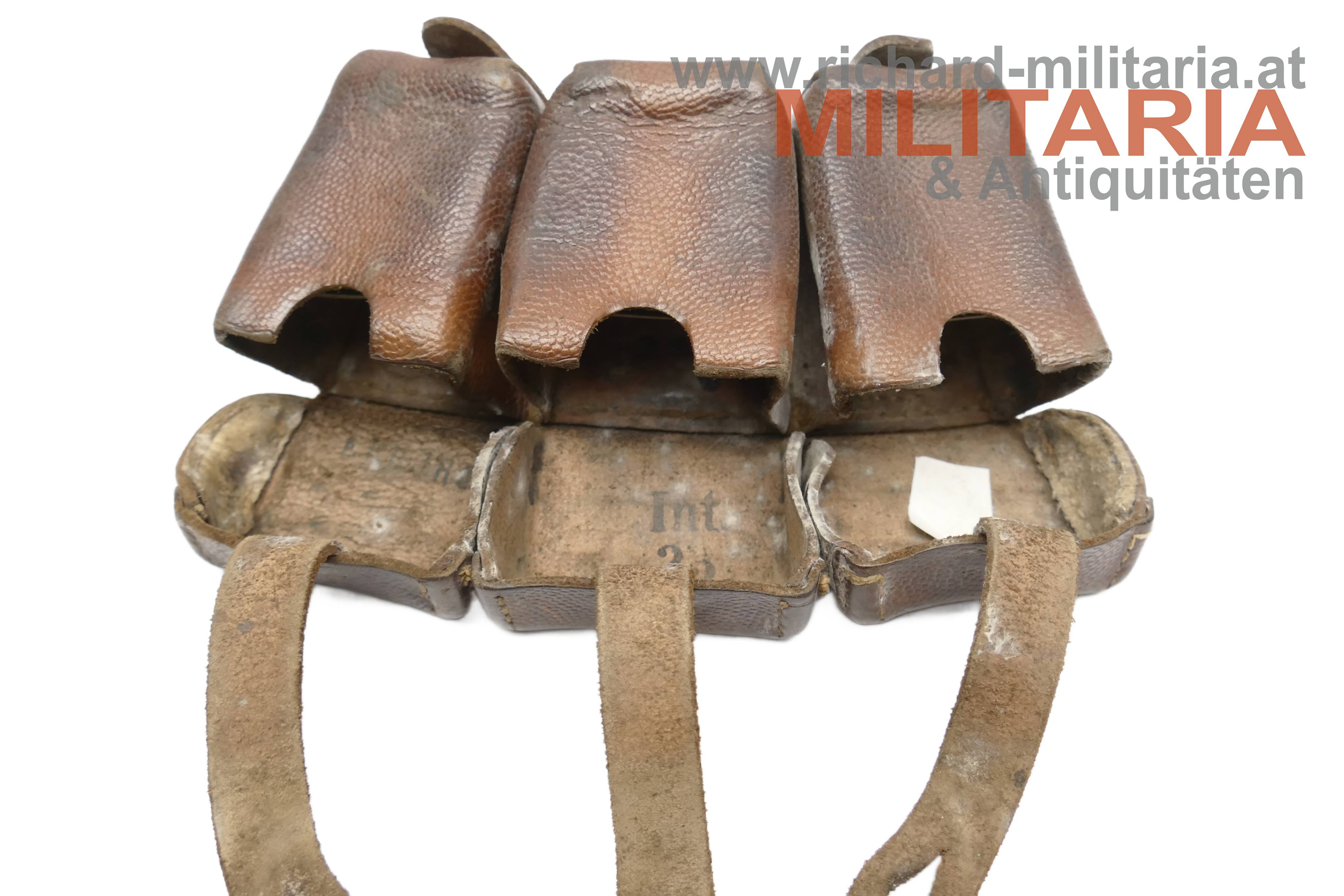 Deutsches Kaiserreich - Patronentasche G98; dunkelbraunes Leder; Deckel der mittleren Tasche mit Herstellerprägestempel "SA"; rückseitiger Prägestempel eines Herstellers und die Jahreszahl "191x" sowie eine händische Beschriftung; die Taschen auf der Deckelinnenseite teilweise mit Stempelungen "ERB IR 38" (vermutlich - nicht eindeutig erkennbar) sowie "Int. 23", etwas angeschmutzt;