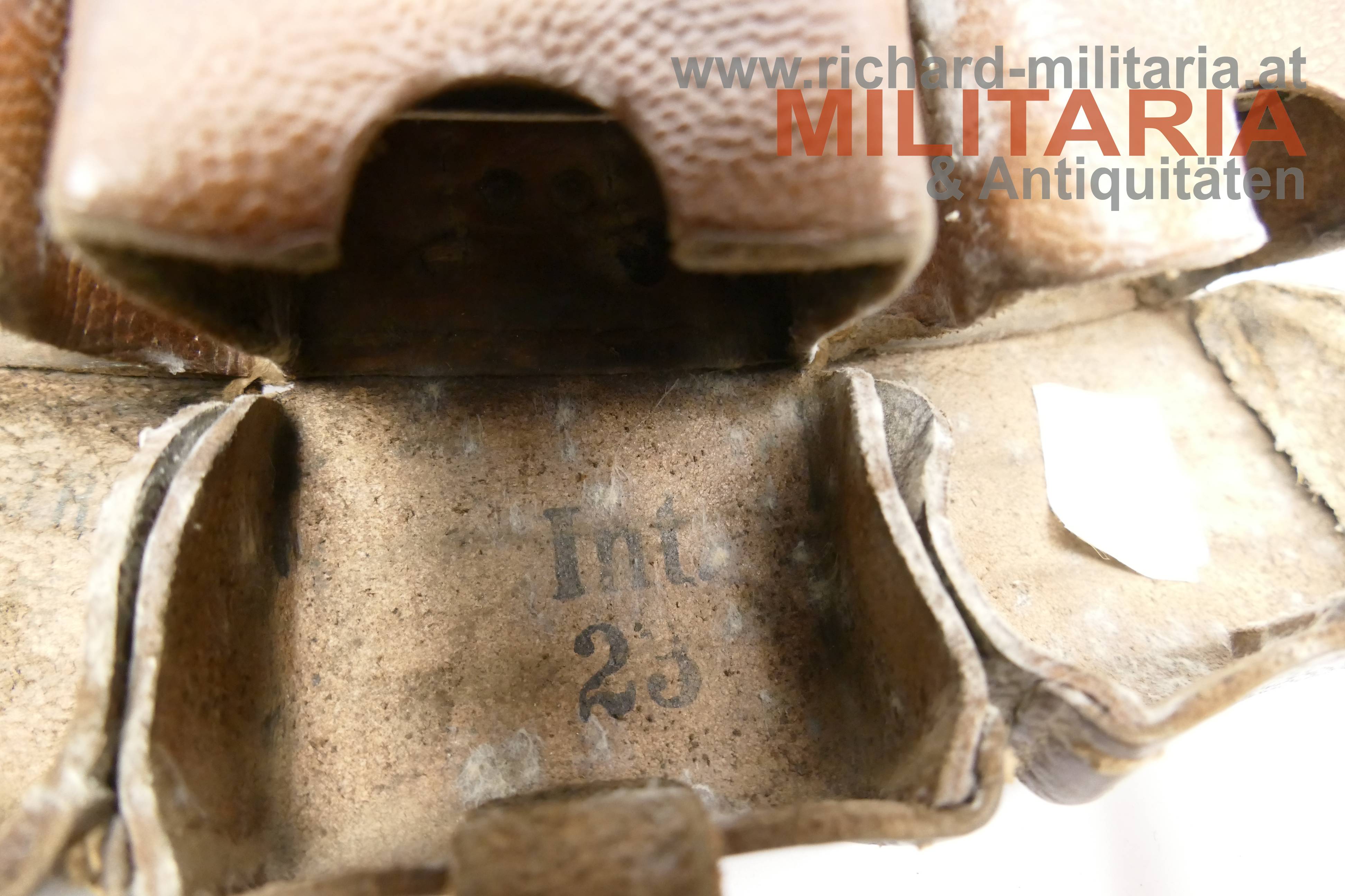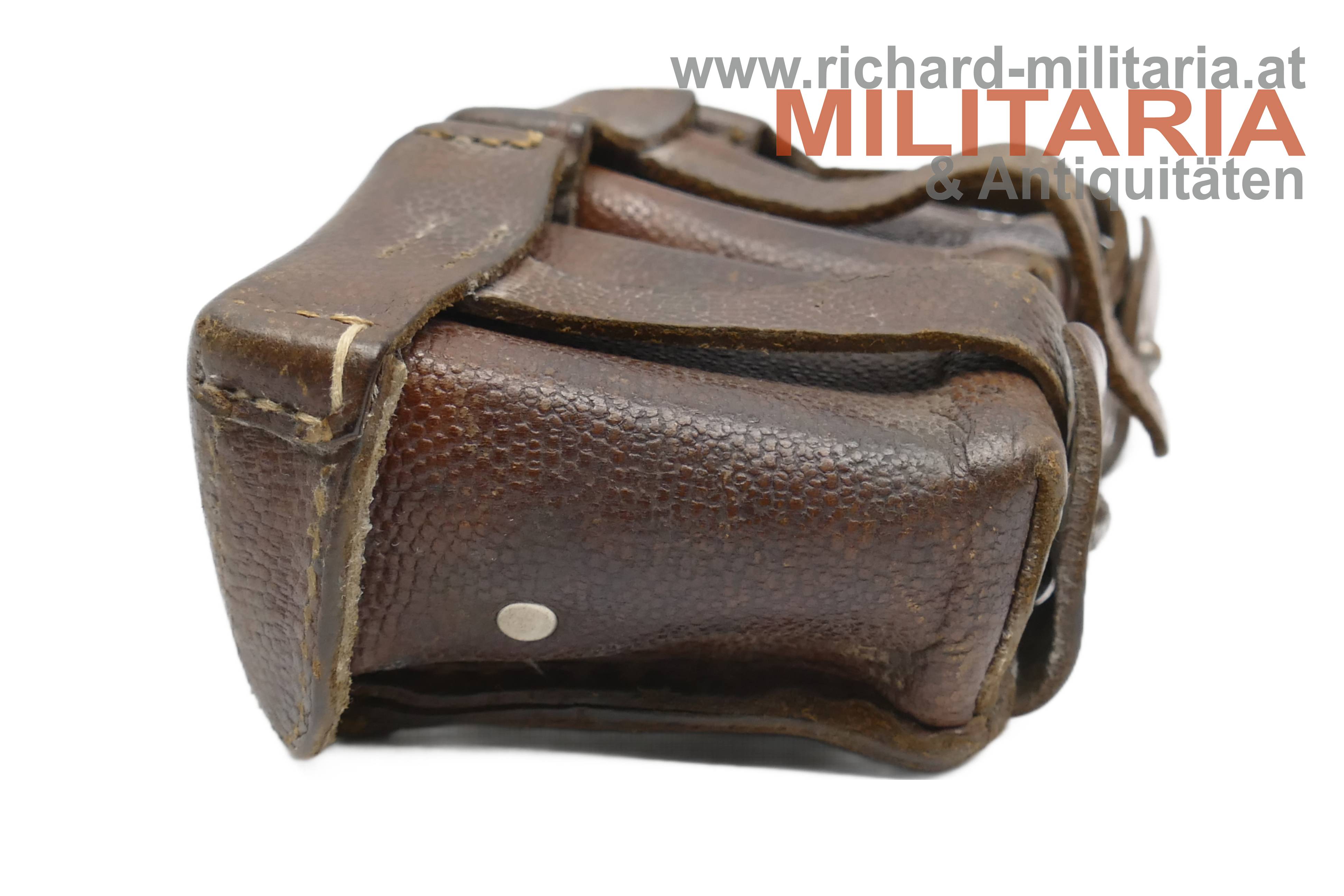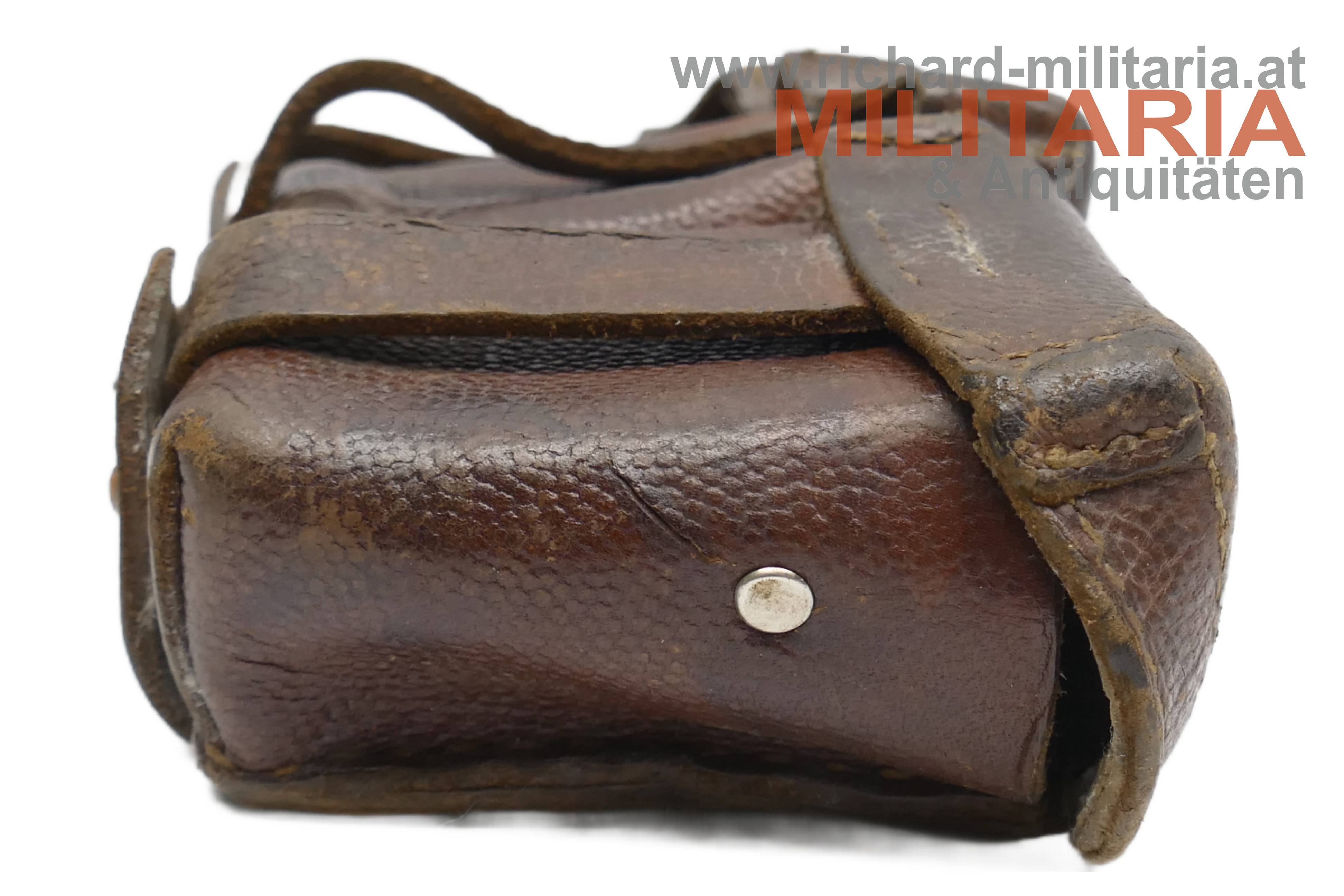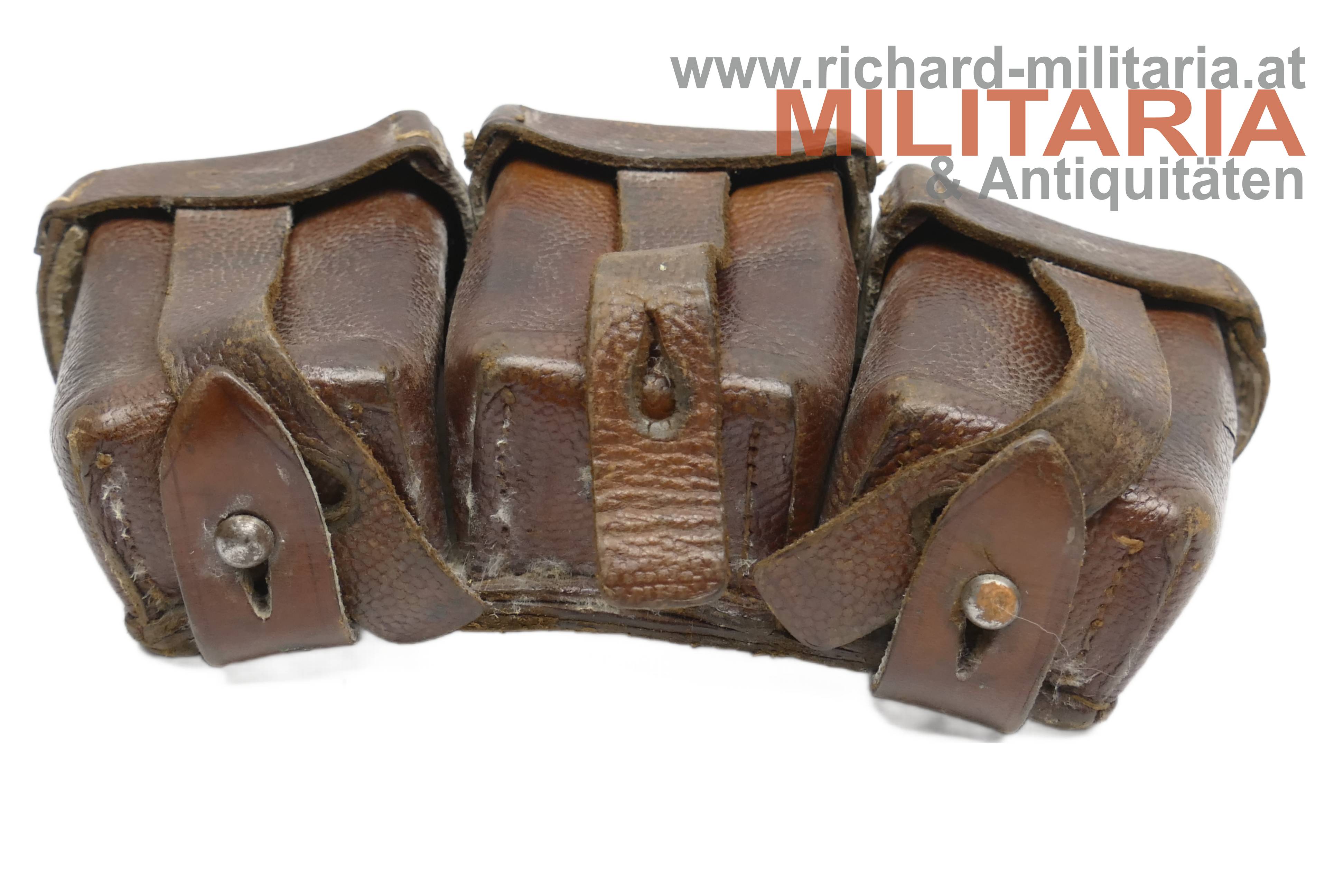 Deutsches Kaiserreich - Patronentasche G98; dunkelbraunes Leder; Deckel der mittleren Tasche mit Herstellerprägestempel "SA"; rückseitiger Prägestempel eines Herstellers und die Jahreszahl "191x" sowie eine händische Beschriftung; die Taschen auf der Deckelinnenseite teilweise mit Stempelungen "ERB IR 38" (vermutlich - nicht eindeutig erkennbar) sowie "Int. 23", etwas angeschmutzt;