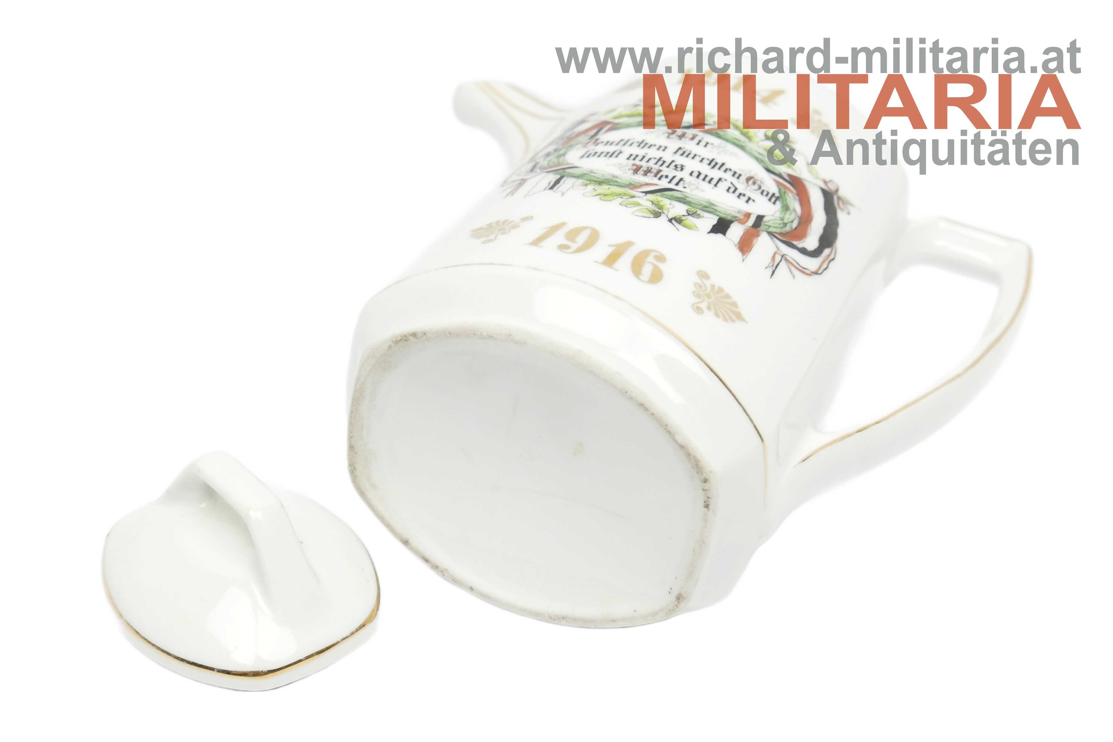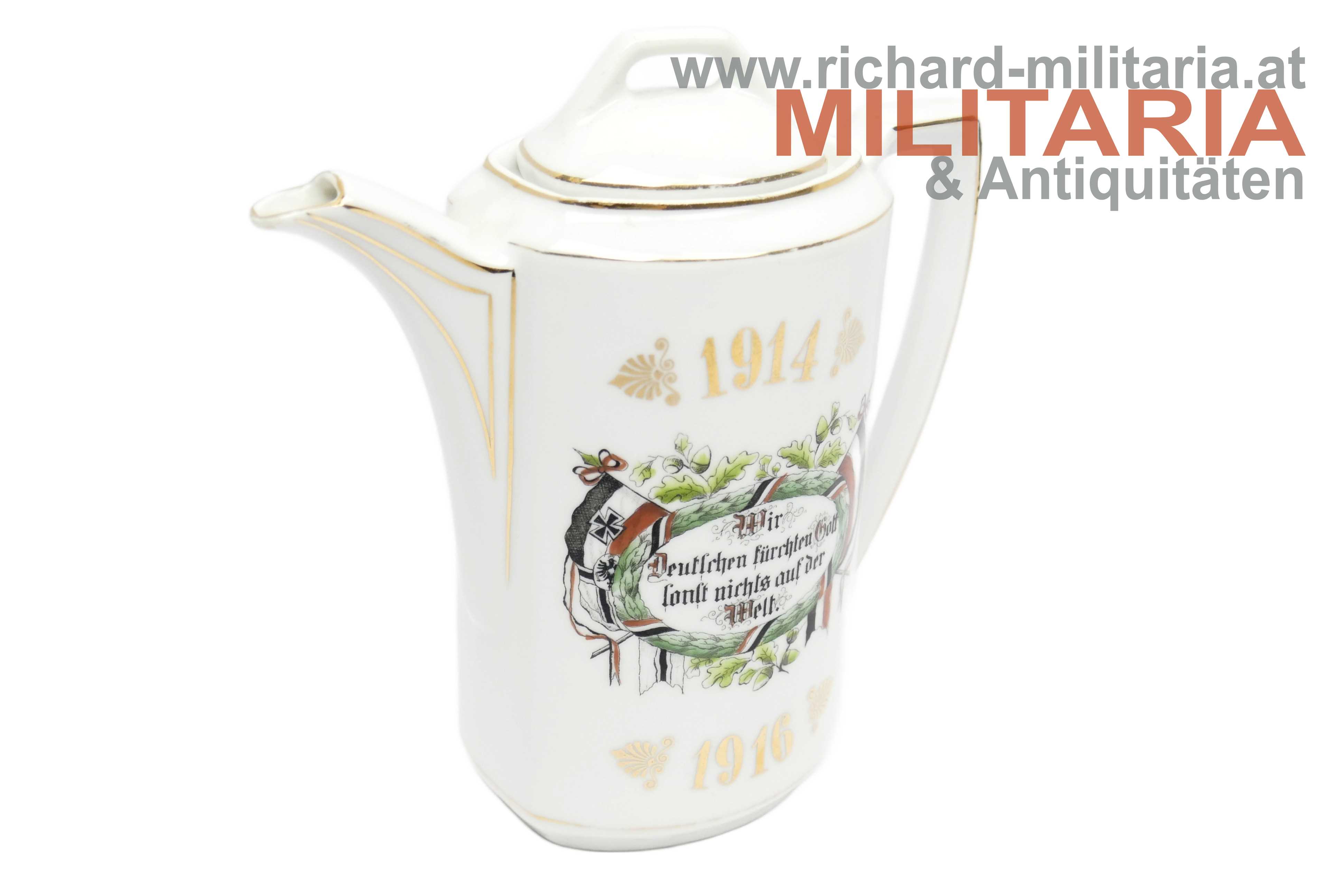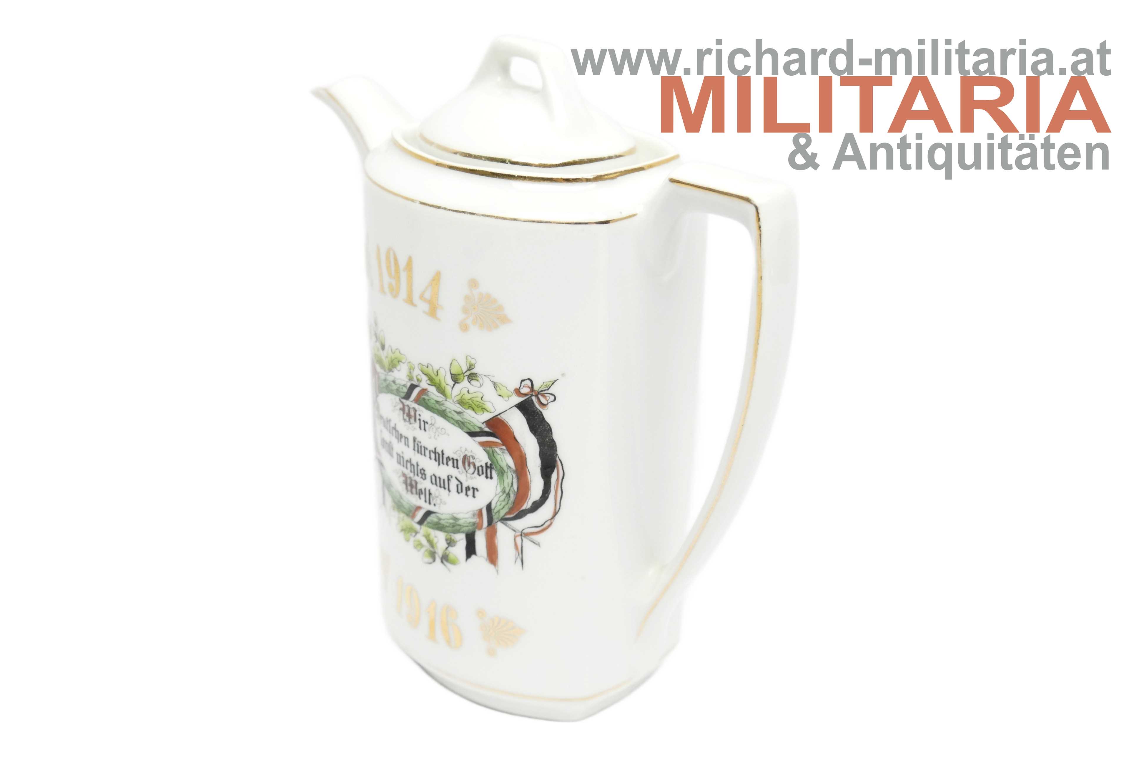 Deutsches Kaiserreich - Porzellankanne - "Wir Deutschen fürchten Gott sonst nichts auf der Welt"; Porzellan mit goldenen Strichverzierungen; mittig der Text "Wir Deutschen fürchten Gott sonst nichts auf der Welt" mit floralen Verzierungen und zwei deutschen Flaggen; oberhalb bzw. unterhalb die Jahreszahlen "1914" und "1916"; einwandfreier Zustand - unbeschädigt (!);