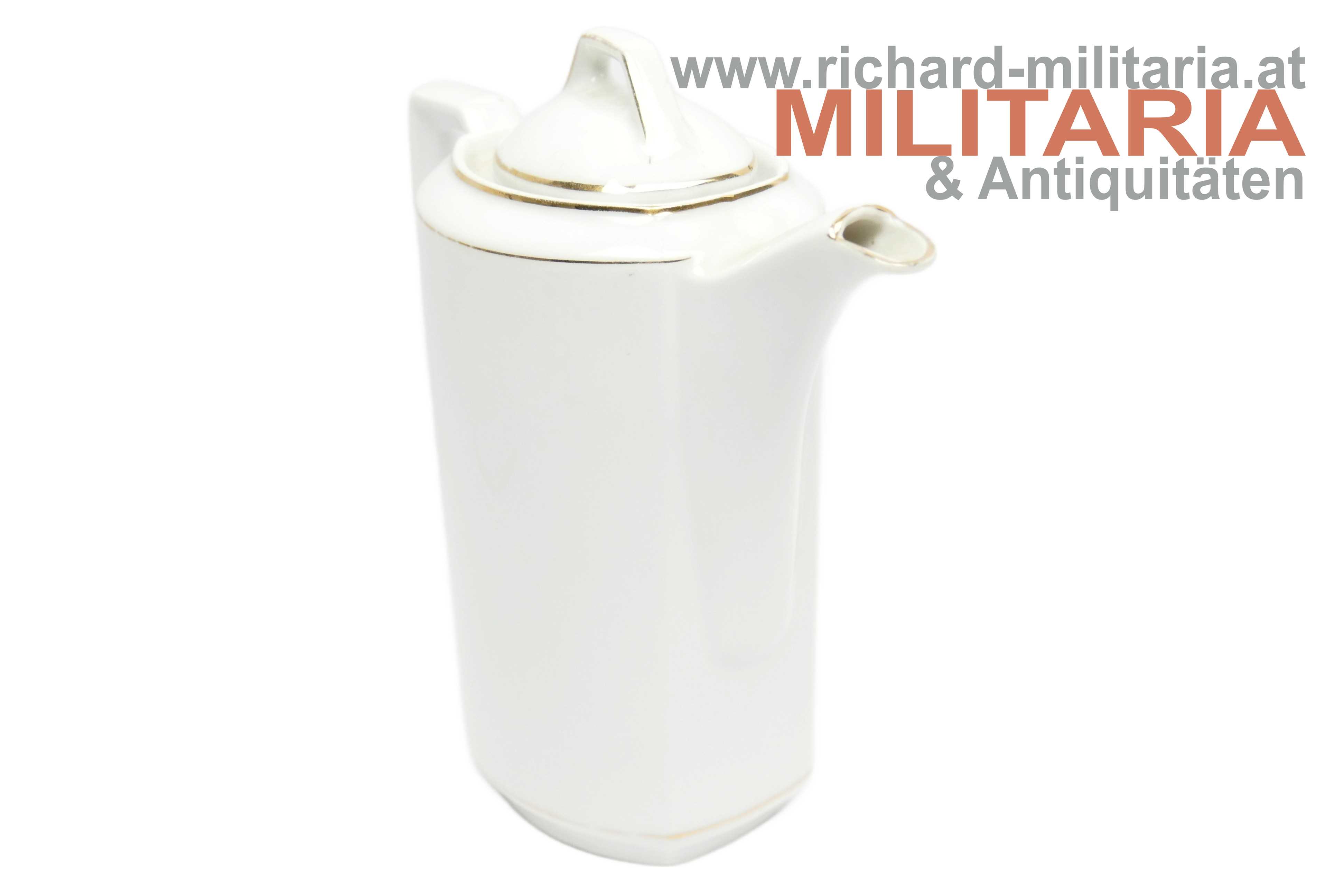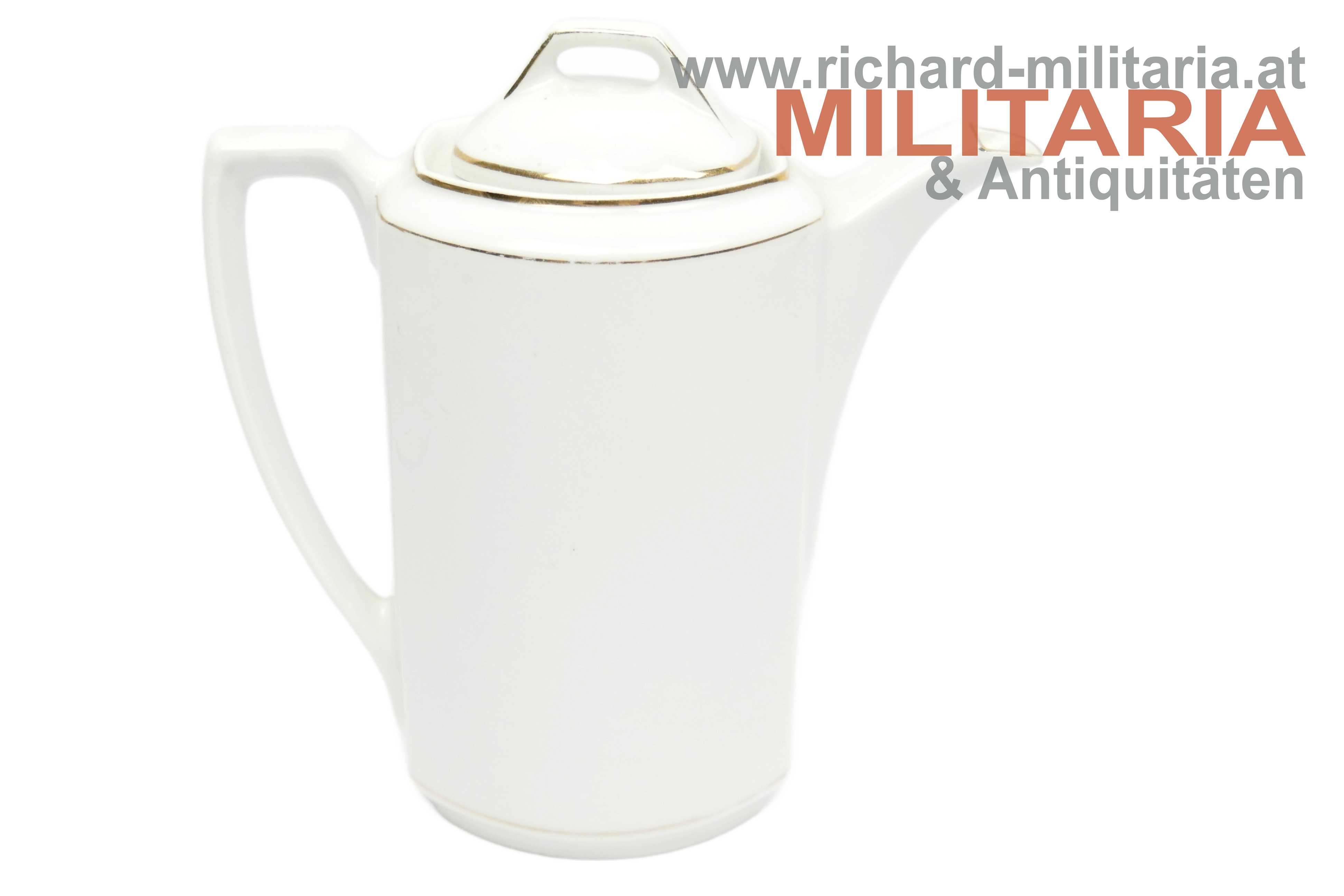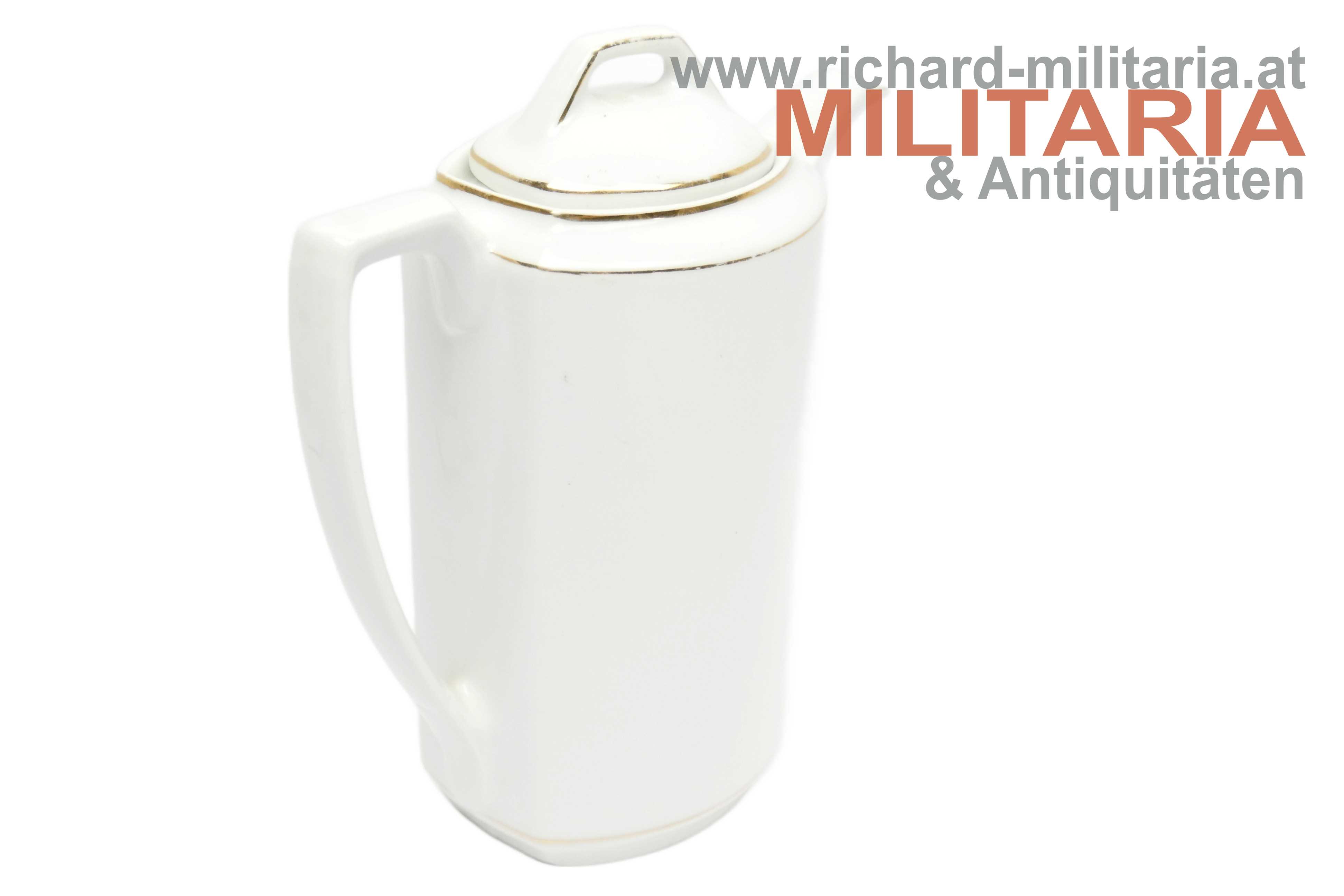 Deutsches Kaiserreich - Porzellankanne - "Wir Deutschen fürchten Gott sonst nichts auf der Welt"; Porzellan mit goldenen Strichverzierungen; mittig der Text "Wir Deutschen fürchten Gott sonst nichts auf der Welt" mit floralen Verzierungen und zwei deutschen Flaggen; oberhalb bzw. unterhalb die Jahreszahlen "1914" und "1916"; einwandfreier Zustand - unbeschädigt (!);