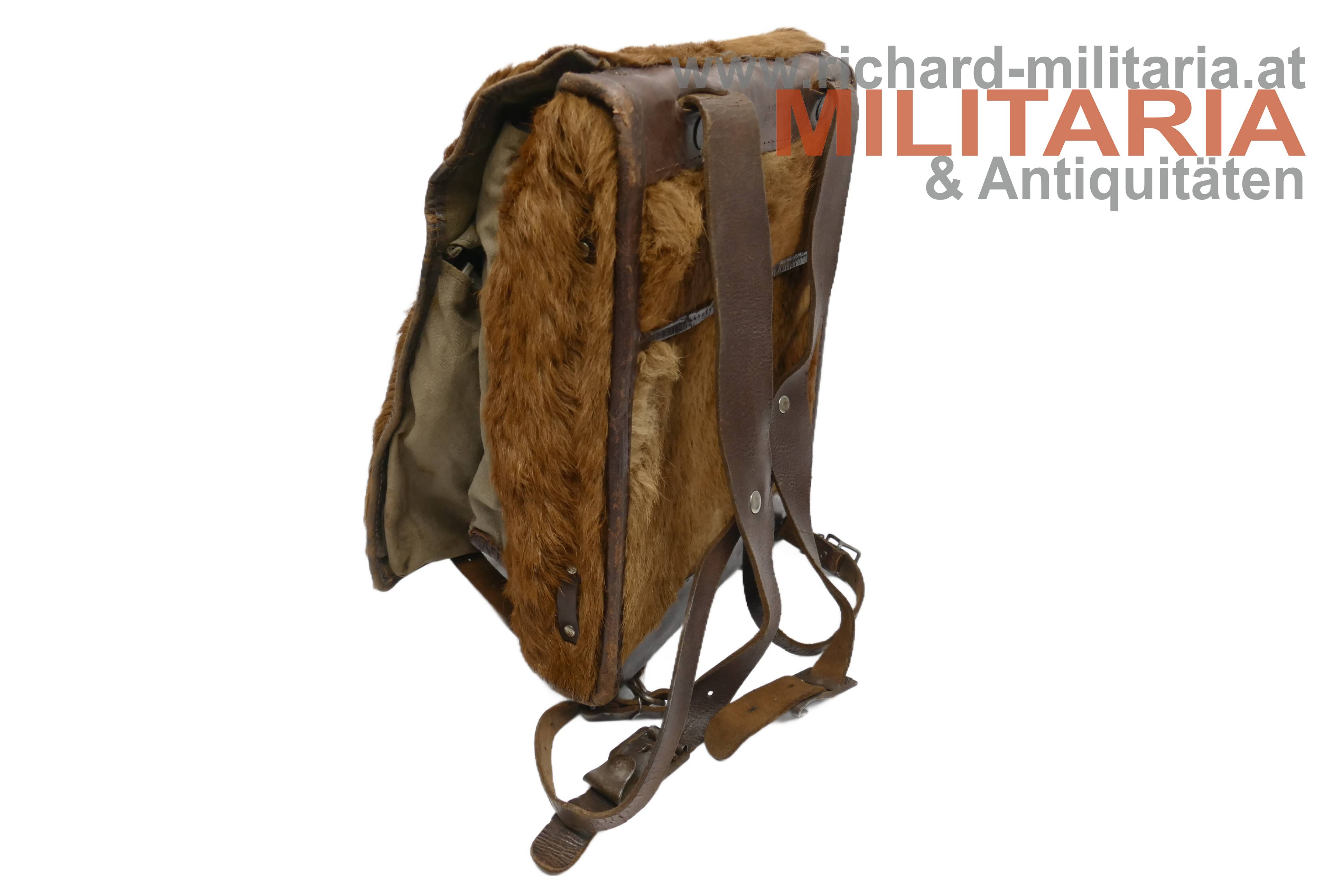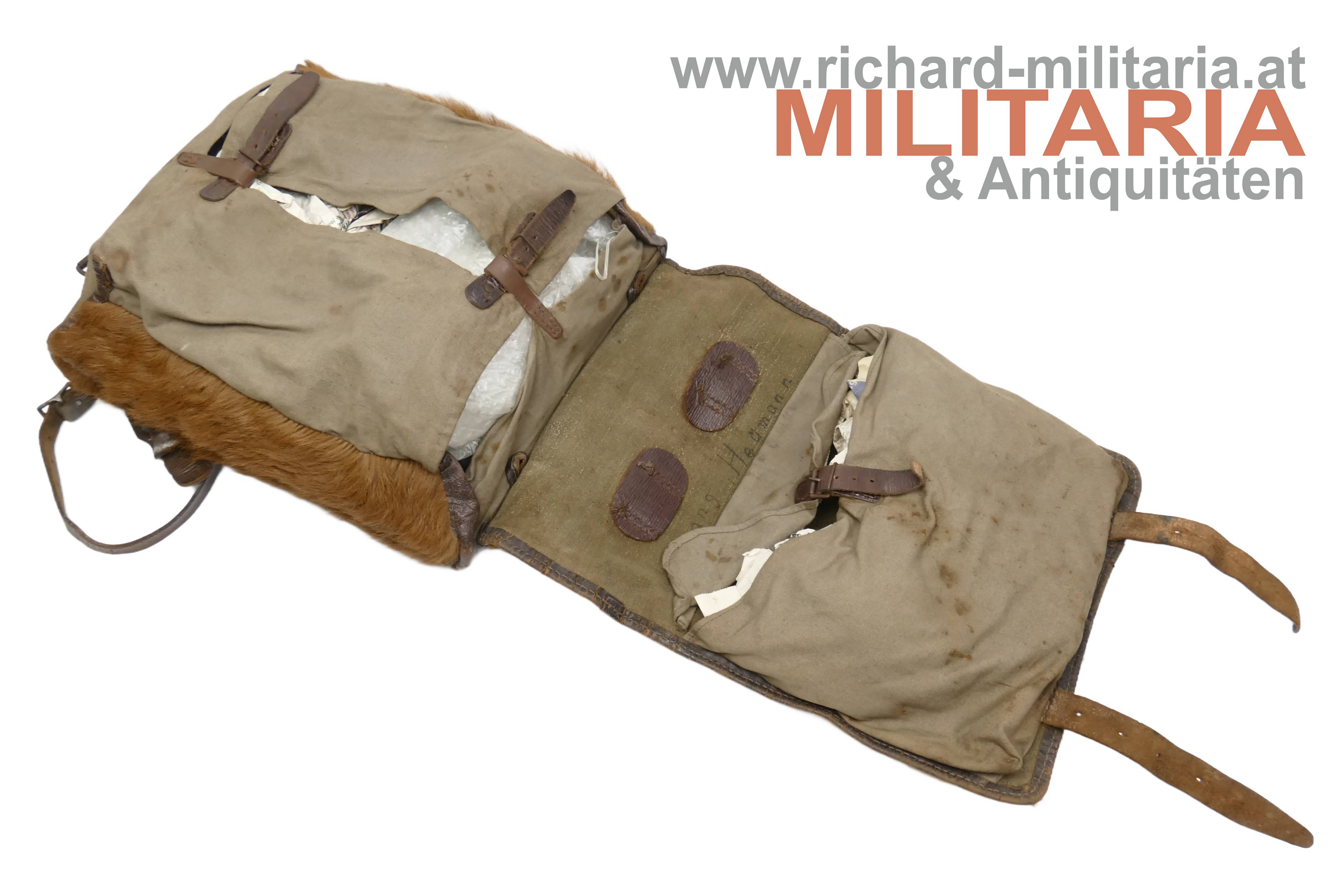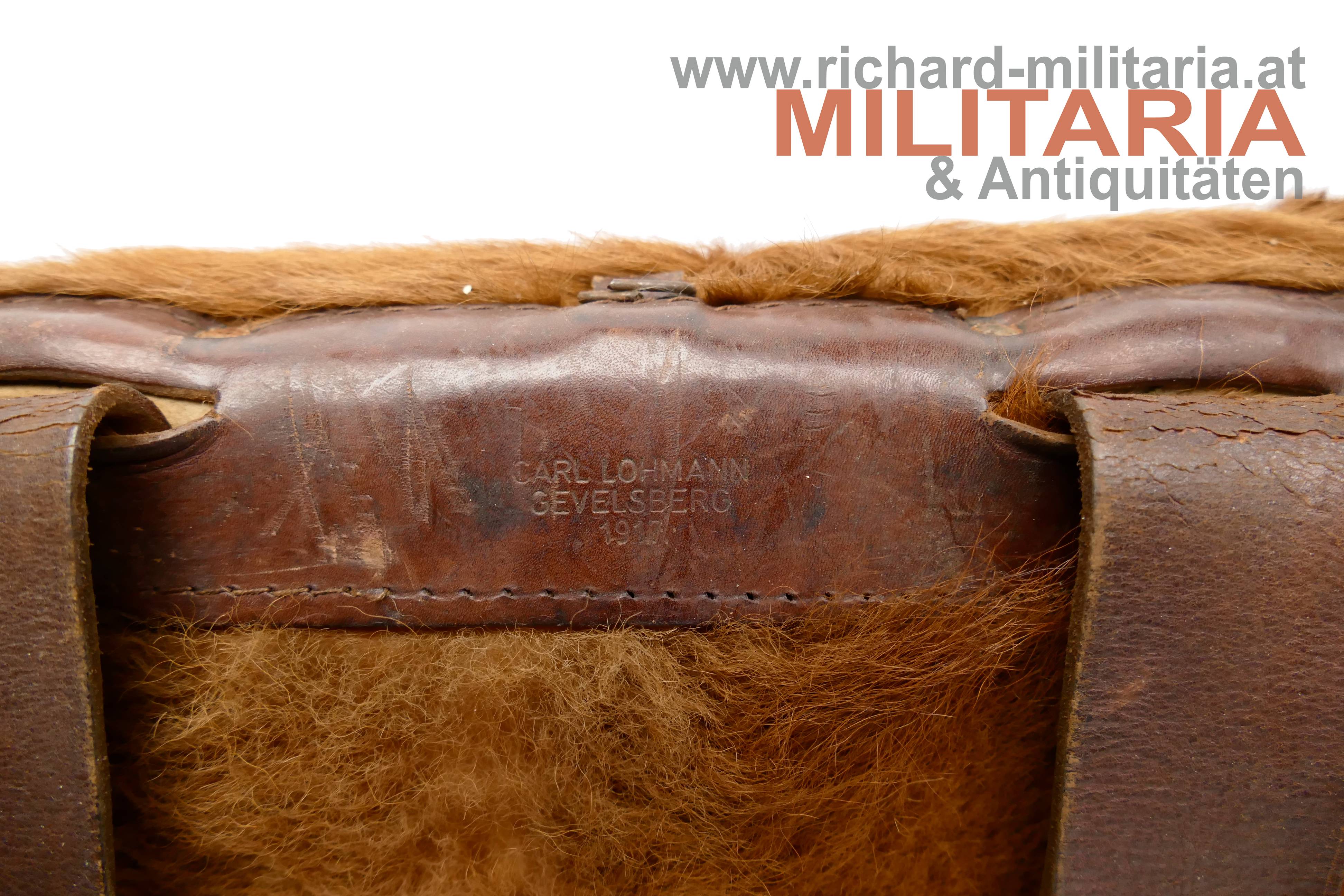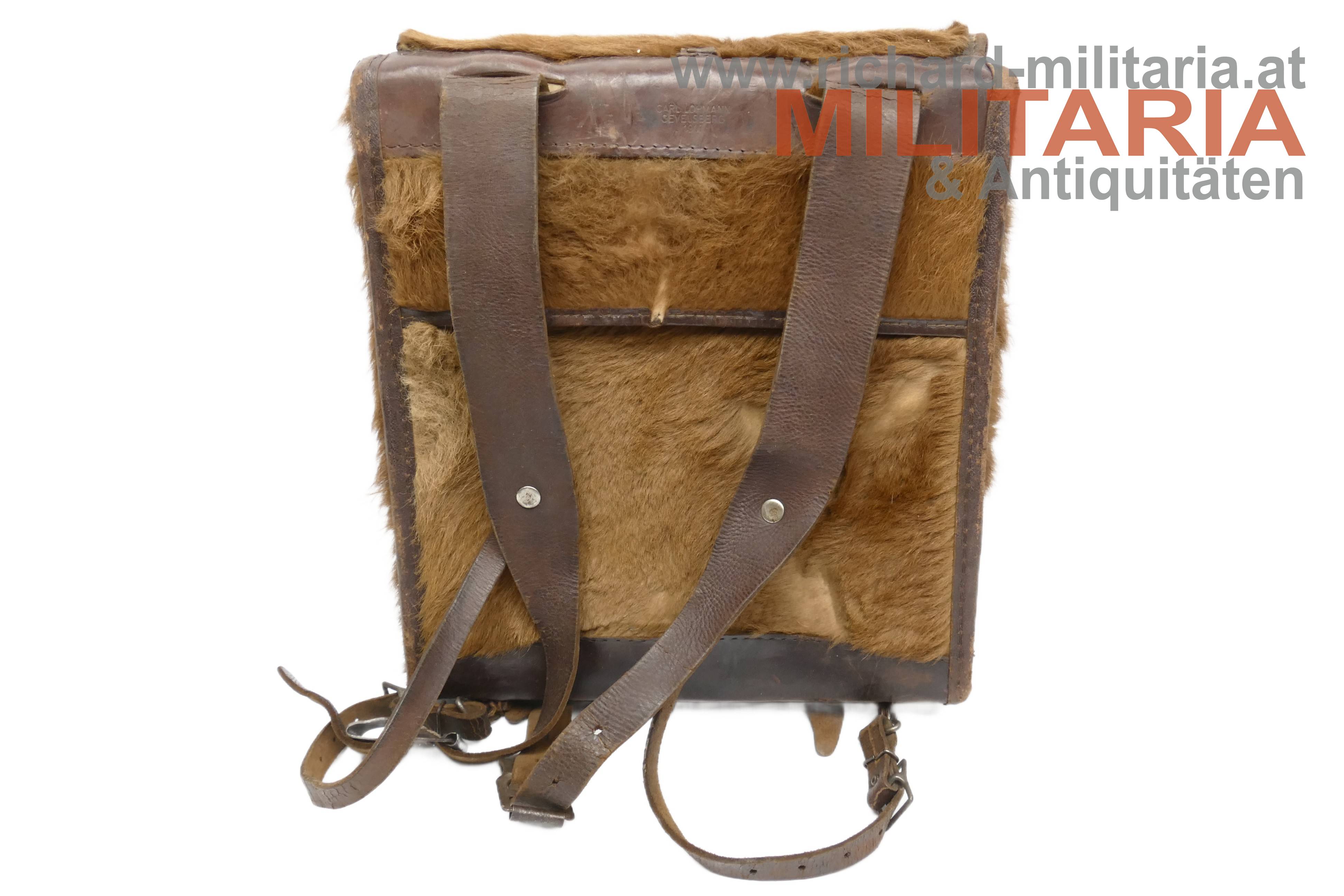 Deutsches Kaiserreich / Preussen; Tornister für Mannschaften; fellbezogener Lederkorpus; vollständig mit Tragenriemen; innen mit öffenbaren olivfarbigen Leinentaschen bzw. Segeltuchtaschen; Lederzungenverschlüsse; innen und auf einem Trageriemen händisch der Trägername "Wolfgang Heymann" vermerkt; am steifen Lederrückenteil Herstellerprägestempel "Carl Lohmann Gevelsberg 1917"; keine nennenswerten Beschädigungen