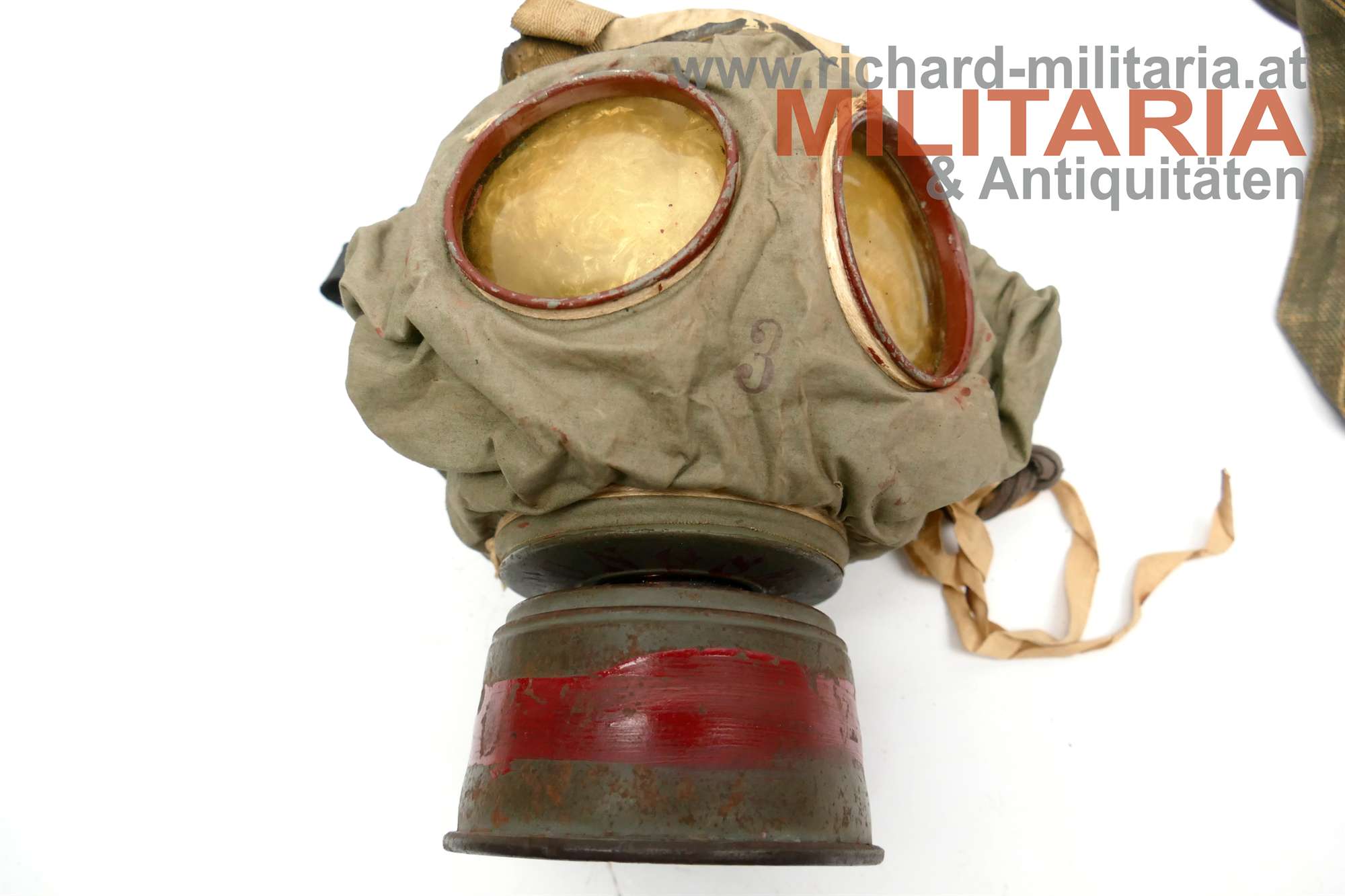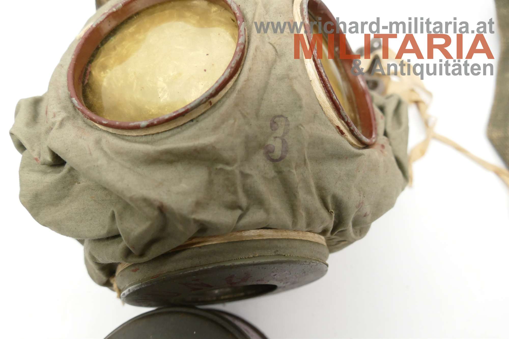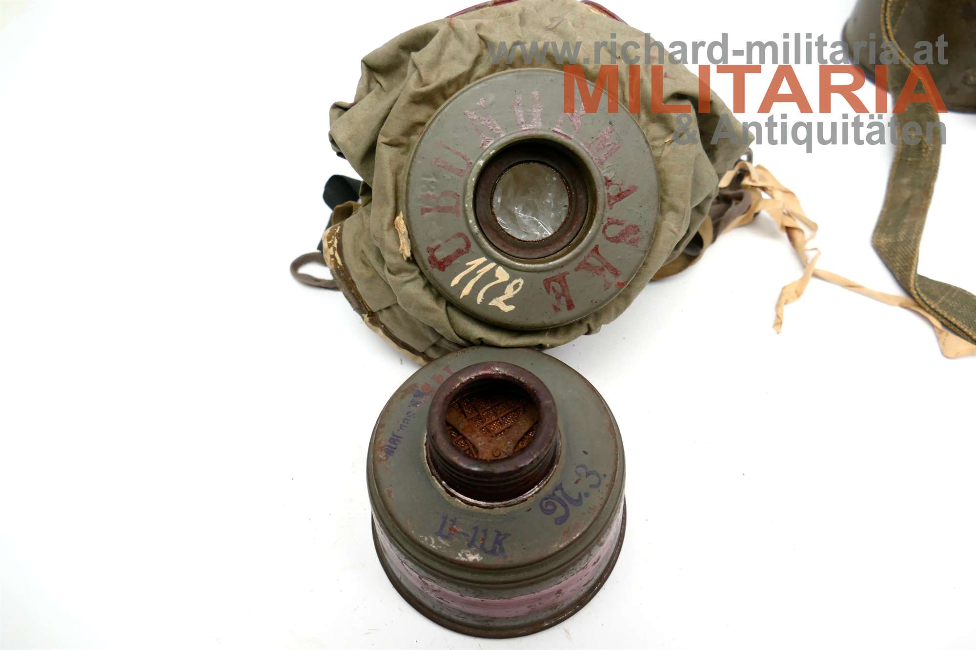 Deutsches Kaiserreich - Rahmenmaske 1916 - 1. Typ; Gasmaske mit Größenstempel "3"; am Rahmen innen mit weiteren Stempelungen; Gummibänder in einwandfreier Erhaltung; Rahmen der Augengläser rot lackiert wie für Übungsmasken vorgesehen; der Filter ebenfalls mit einem roten umlaufenden Streifen und auf dem Mundring in roter Schrift "ÜBUNGSMASKE" geschrieben; Behälter Typ D4; originale Tragebänder mit Verstellmechanismus vorhanden; der Deckel des Behälters ebenfalls mit einer umlaufenden roten Markierung; die Nummer "1172" ident mit der Nummer am Mundring (!);