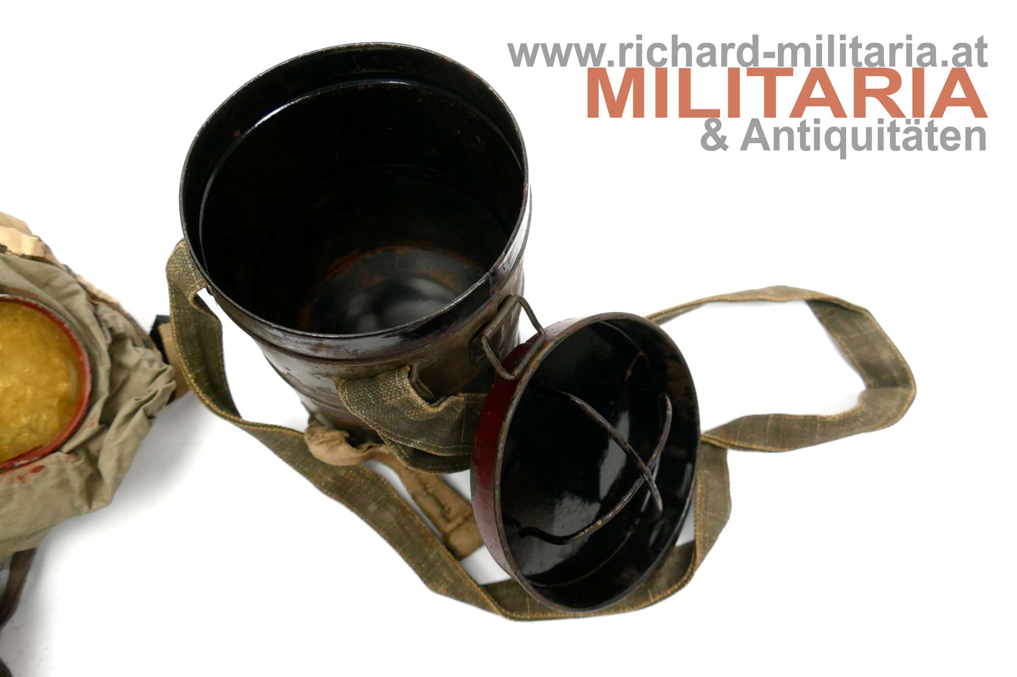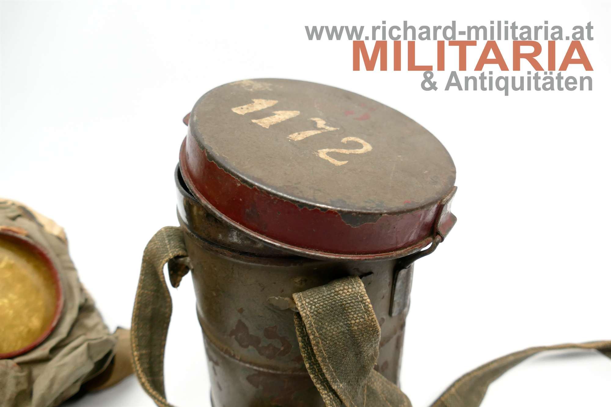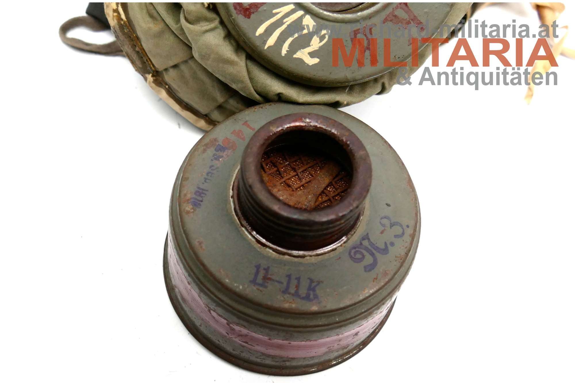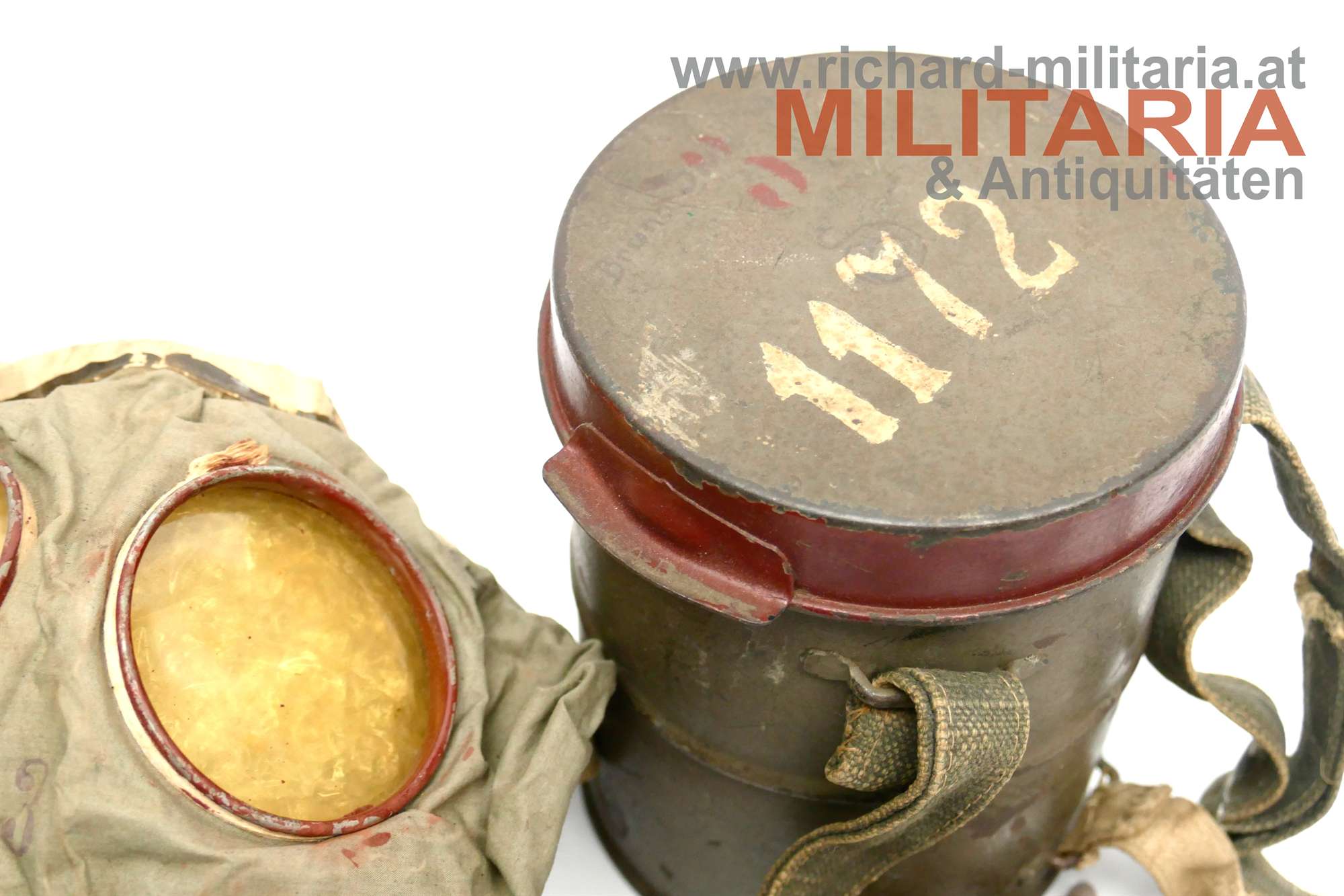 Deutsches Kaiserreich - Rahmenmaske 1916 - 1. Typ; Gasmaske mit Größenstempel "3"; am Rahmen innen mit weiteren Stempelungen; Gummibänder in einwandfreier Erhaltung; Rahmen der Augengläser rot lackiert wie für Übungsmasken vorgesehen; der Filter ebenfalls mit einem roten umlaufenden Streifen und auf dem Mundring in roter Schrift "ÜBUNGSMASKE" geschrieben; Behälter Typ D4; originale Tragebänder mit Verstellmechanismus vorhanden; der Deckel des Behälters ebenfalls mit einer umlaufenden roten Markierung; die Nummer "1172" ident mit der Nummer am Mundring (!);