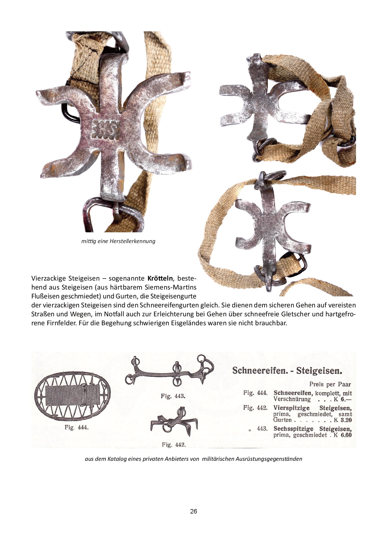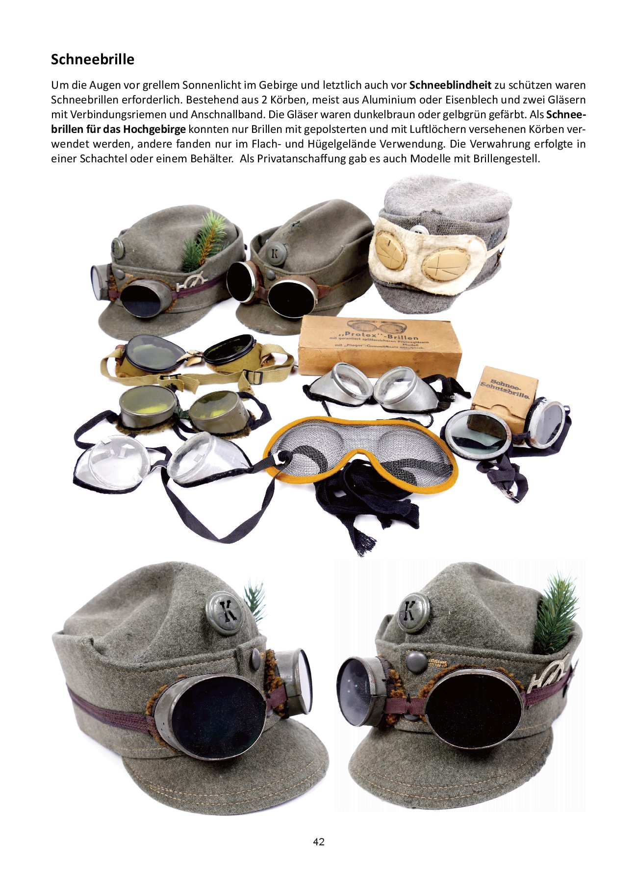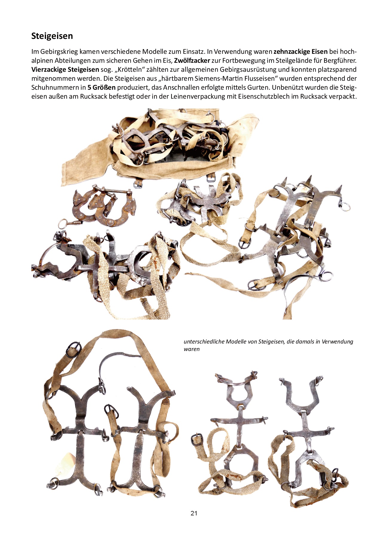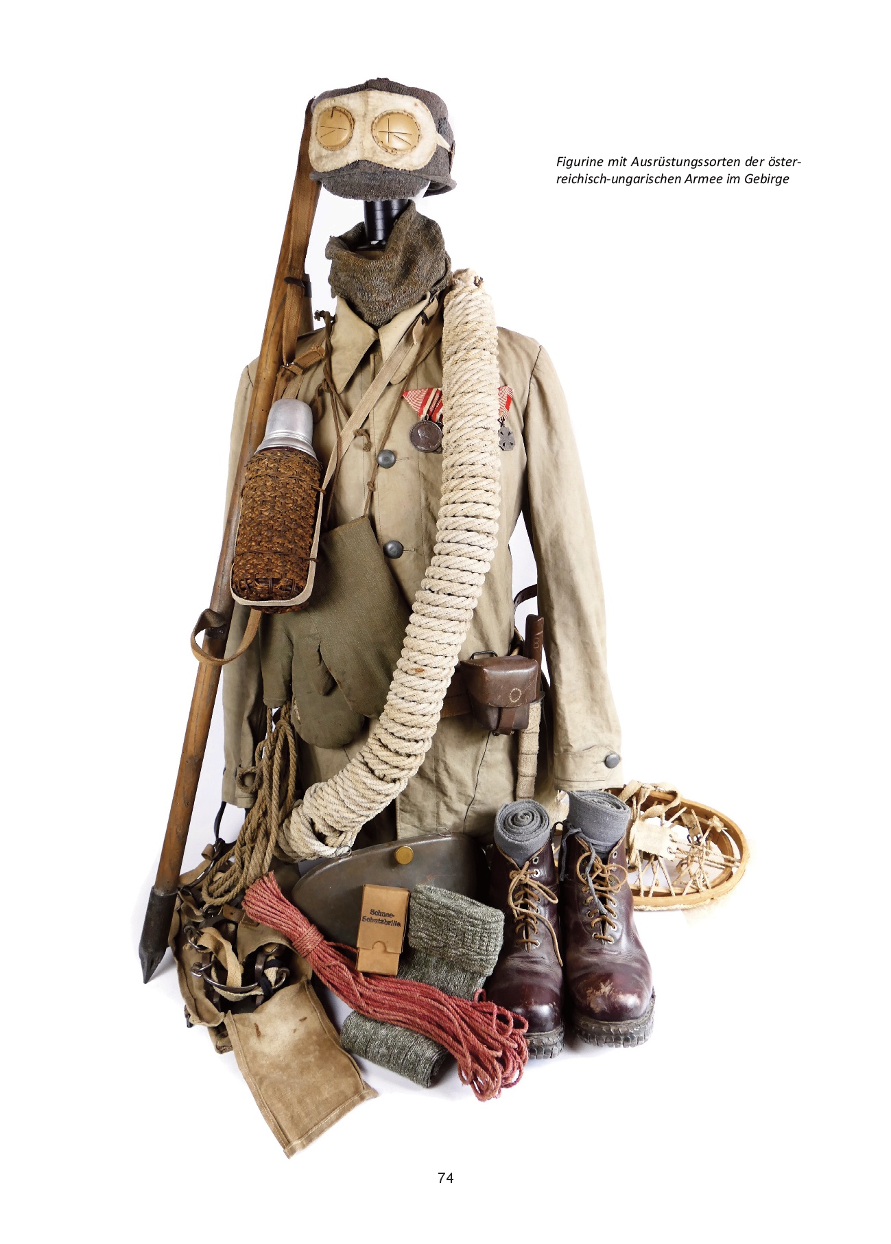 Vollfarbiges gebundenes Heft im Format A4; 103 Seiten zum Thema „Der Krieg im Gebirge – Ausrüstung im Hochgebirge“; mit hunderten Abbildungen von Objekten aus der Sammlung Markus Arnold zum Thema.