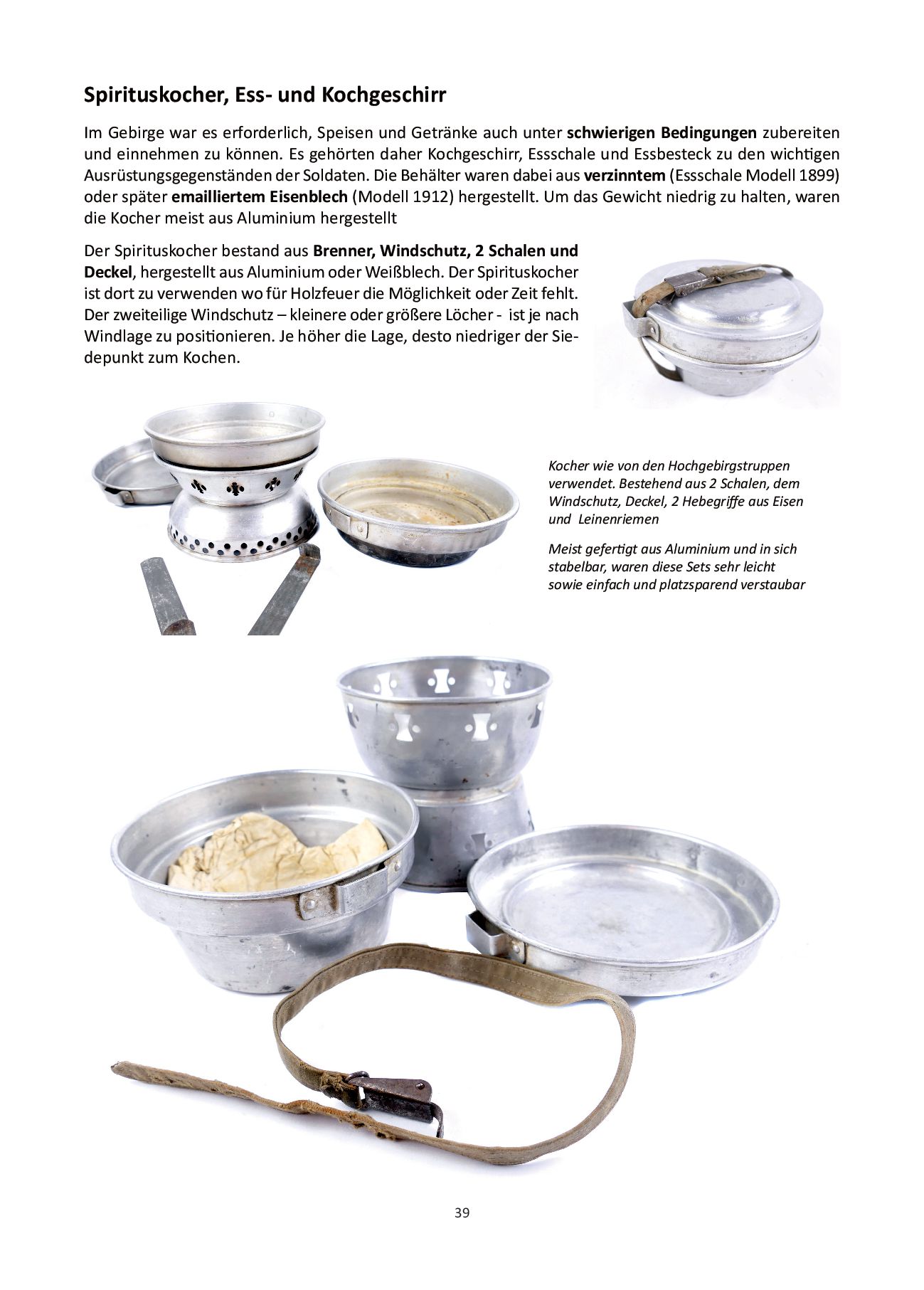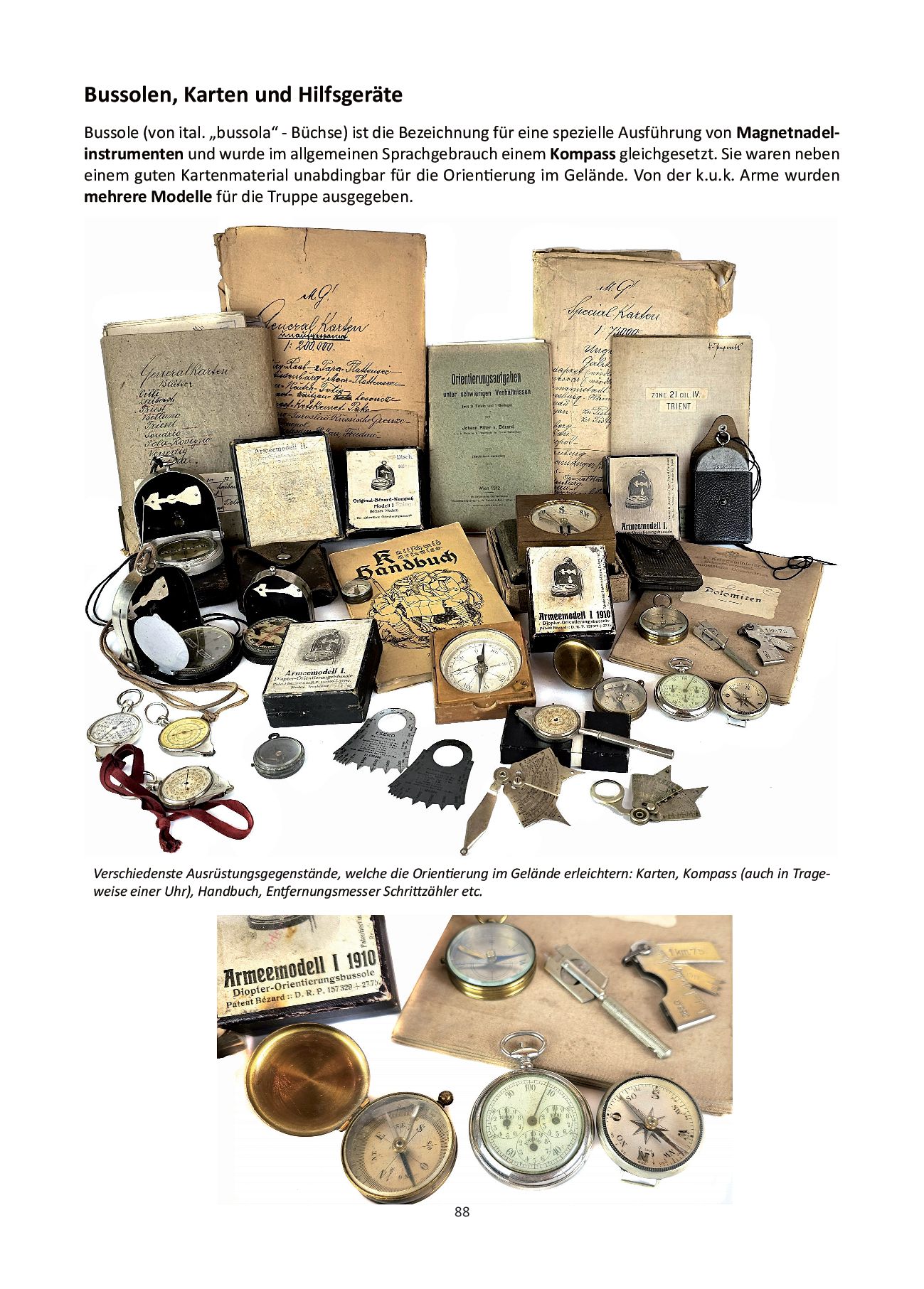 Vollfarbiges gebundenes Heft im Format A4; 100 Seiten zum Thema „Der Krieg im Gebirge – Verpflegung und Orientierung“; mit hunderten Abbildungen von Objekten aus der Sammlung Markus Arnold zum Thema.