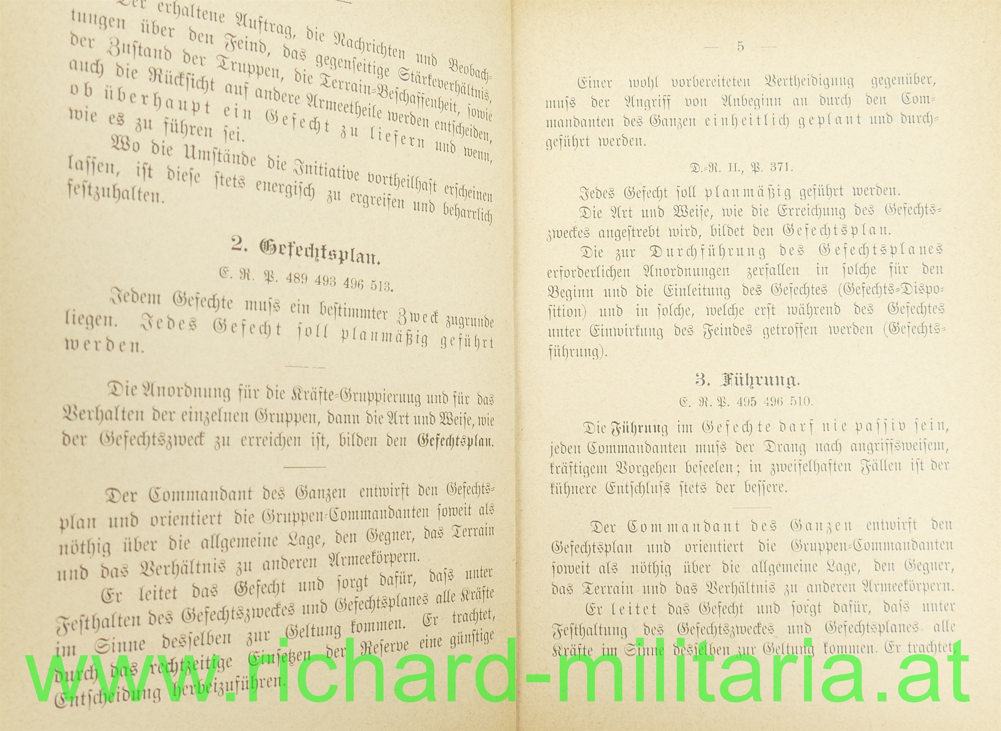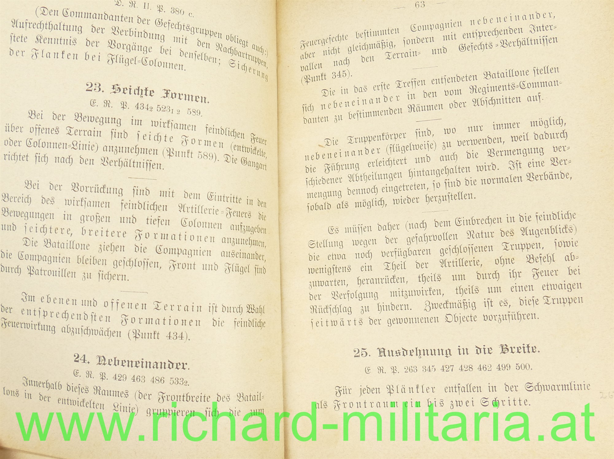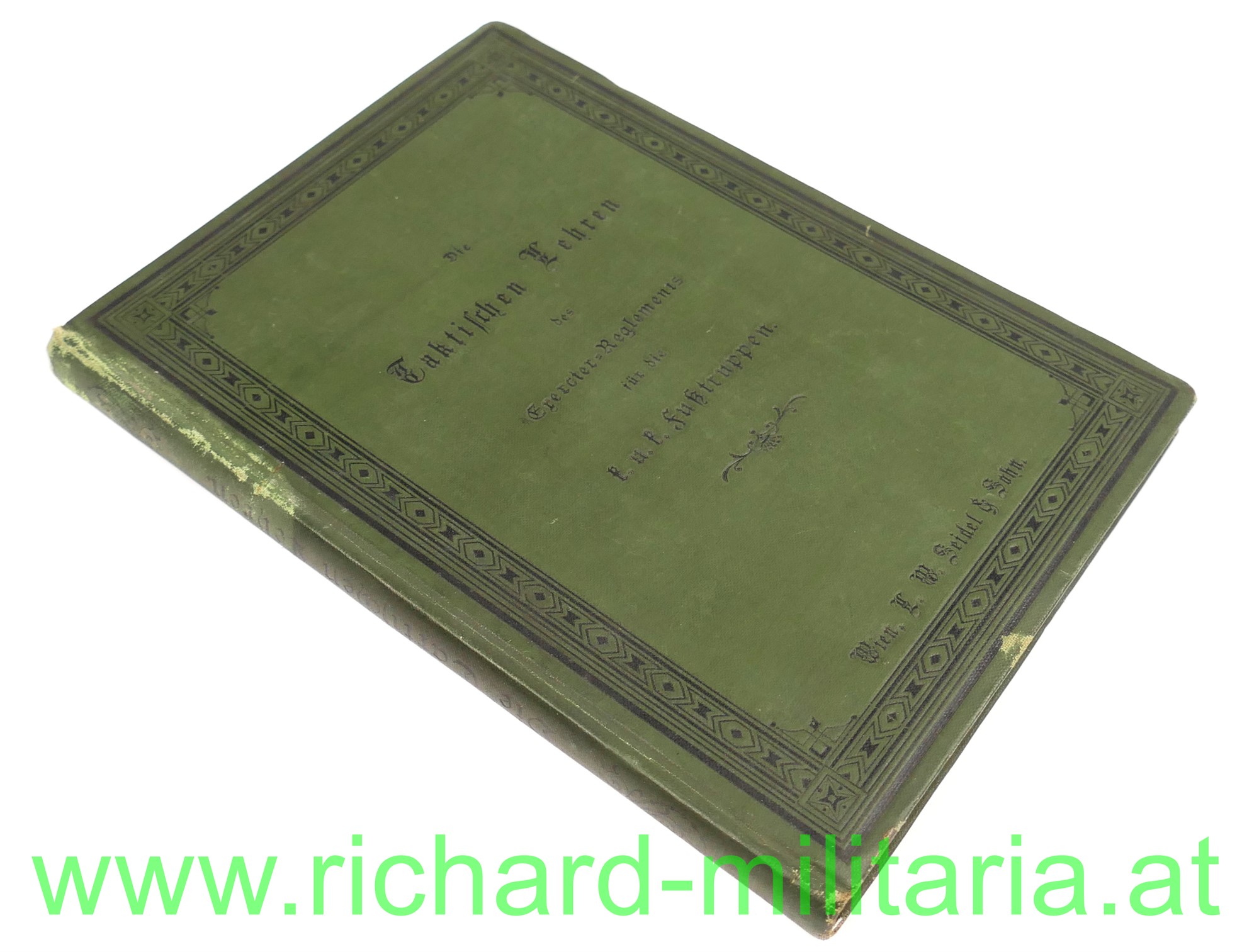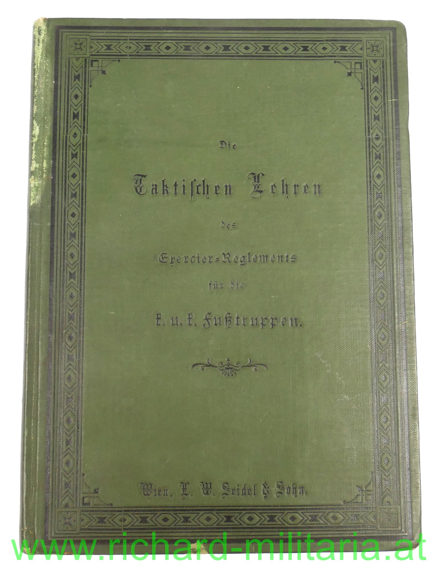 Die taktischen Lehren d. Exercier-Reglements f. d. k.u.k. Fußtruppen 1893, Wien Verlag v. Seidel & Sohn, k.u.k. Hofbuchhändler, 1893, dunkelgrüner Leineneinband - schwarz bedruckt; am oberen Drittel des Buchrückens kleiner Wasserschaden; alle Seiten vorhanden;