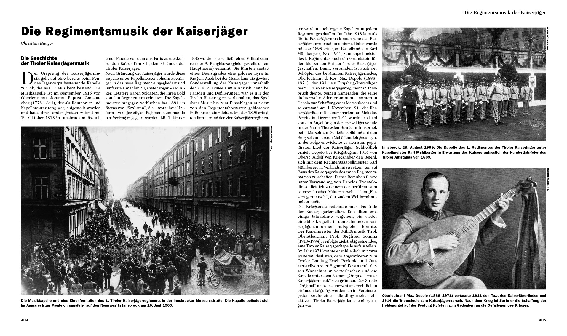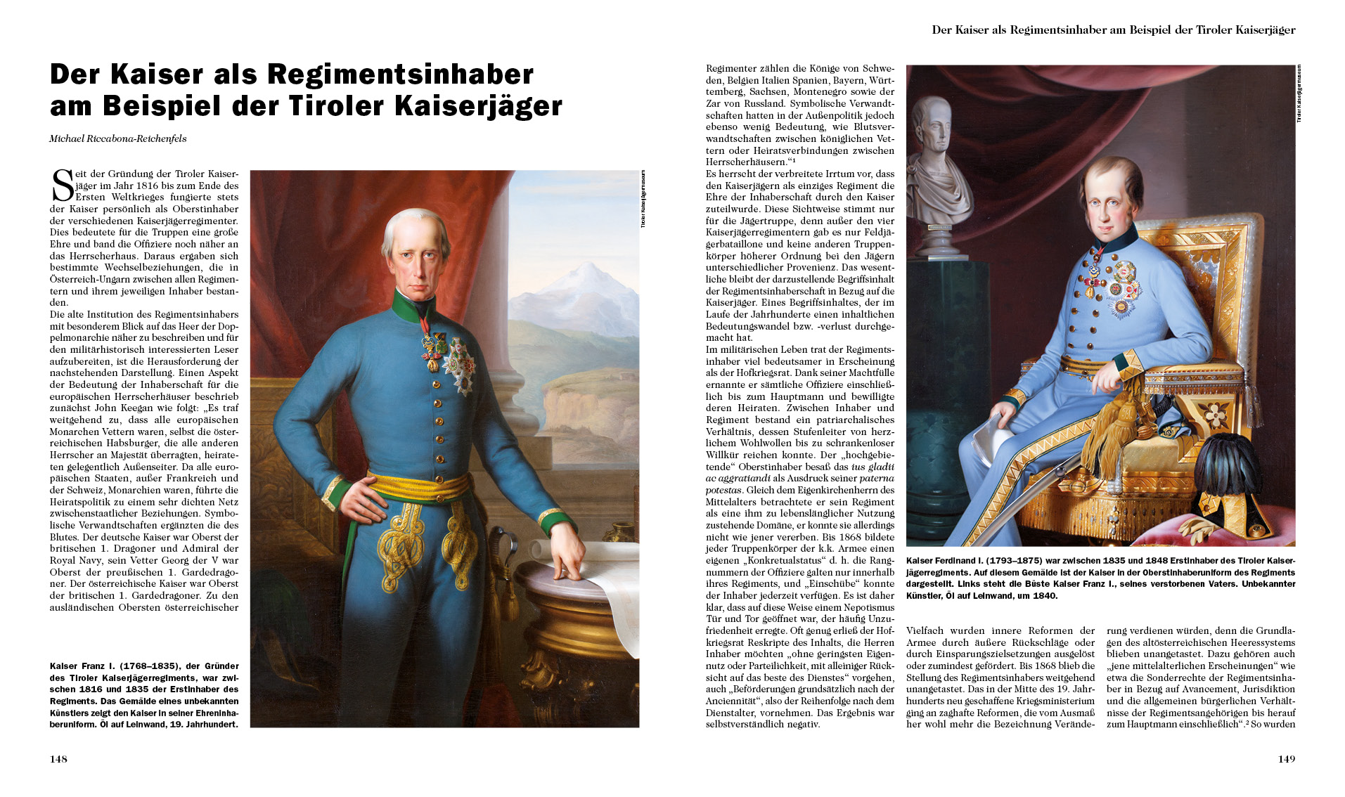 Zuerst aus Veteranen des Tiroler Freiheitskampfes von 1809 rekrutiert, entwickeln sich die Kaiserjäger zu einer Eliteeinheit der k.u.k. Armee. Im Jahr 1816 von Kaiser Franz I. ins Leben gerufen, kämpft das Tiroler Kaiserjägerregiment vor dem Ersten Weltkrieg auf Kriegsschauplätzen in Italien, Ungarn und Bosnien. Novara, Magenta, Solferino oder Custozza sind dabei nur einige jener Schlachten, in denen sich die Kaiserjäger immer wieder bewähren. Auch nachdem 1895 eine Neuformierung in vier Regimenter stattfindet, behalten die Kaiserjäger ihren Elitecharakter und dienen nach wie vor als militärische Ziehschule österreichischer Erzherzöge. Im Ersten Weltkrieg stehen die Kaiserjäger in Galizien, Rumänien und den Dolomiten, wo die stark umkämpften Berge Monte Piano, Col di Lana, Lagazuoi wie auch das Pasubio-Massiv als „Kaiserjägerberge“ in die Geschichte eingehen. Vor allem das Kaiserpaar Karl und Zita lohnen die Treue der Kaiserjäger mit lebenslanger Verbundenheit.