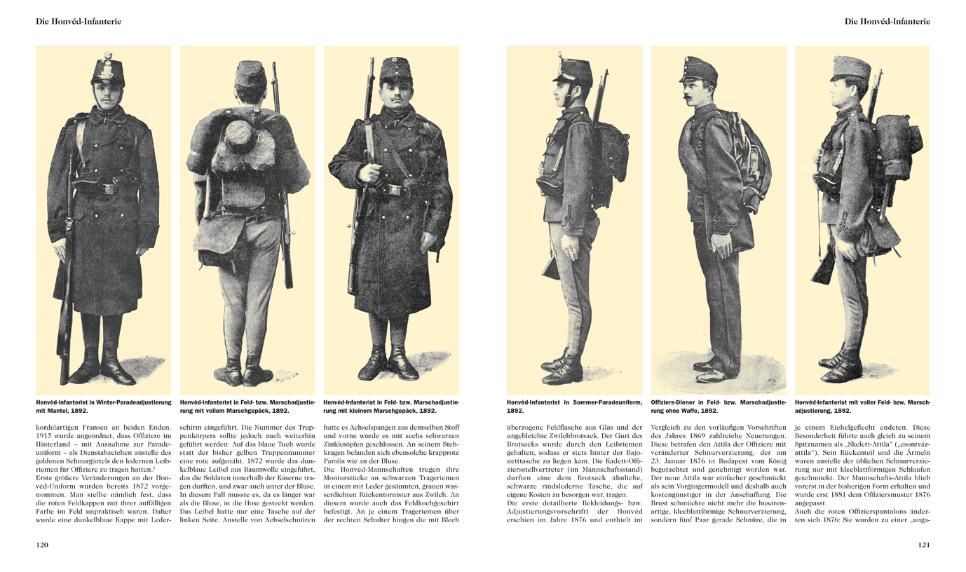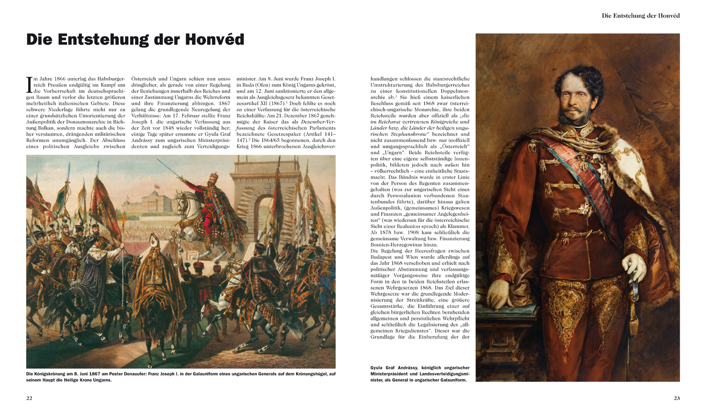Als Folge des österreichisch-ungarischen Ausgleichs bestand die gesamte bewaffnete Macht der Donaumonarchie seit 1868 aus drei Teilen: Neben der gemeinsamen k. u. k. Armee gab es zwei voneinander getrennte Landwehren, die in den jeweiligen Reichshälften – der österreichischen und der ungarischen – aufgestellt wurden. Die königlich ungarische Landwehr, umgangssprachlich auch „Honvéd“ genannt, entwickelte sich bis zum Ausbruch des Ersten Weltkriegs 1914 zu einer in fast allen Waffengattungen detailgetreuen magyarischen Version „en miniature“ der gemeinsamen Armee. Unter dem Motto „Für König und Vaterland“ fanden in ihr Traditionen ungarischen Soldatentums Eingang, die sich aus dem Revolutionsjahr 1848, aber auch aus den Napoleonischen Kriegen und den ruhmreichen Husarenmythen herleiteten. Diese kleine ungarische Armee der „zweiten Linie“, ihr historischer Hintergrund und ihre politische Bedeutung sowie die Gliederung, UniformierungundAusrüstung werden in diesem Bildband von ihrer Entstehung bis zum Zusammenbruch Österreich-Ungarns im Jahr 1918 vorgestellt. Die feinen Unterschiede und Nuancen der Uniformierung gegenüber der gemeinsamen k. u. k. Armee werden an einer Vielzahl von Kopfbedeckungen, Uniform- und Bekleidungsstücken im Detail aufgezeigt. Anhand zahlreicher bisher unveröffentlichter Originalbilder und Farbfotos aus den Beständen des Museums für Militärgeschichte in Budapest sowie aus Privatsammlungen wird ein lebendiger und farbiger Einblick in das Leben und Wirken der „Honvéd“ vermittelt.