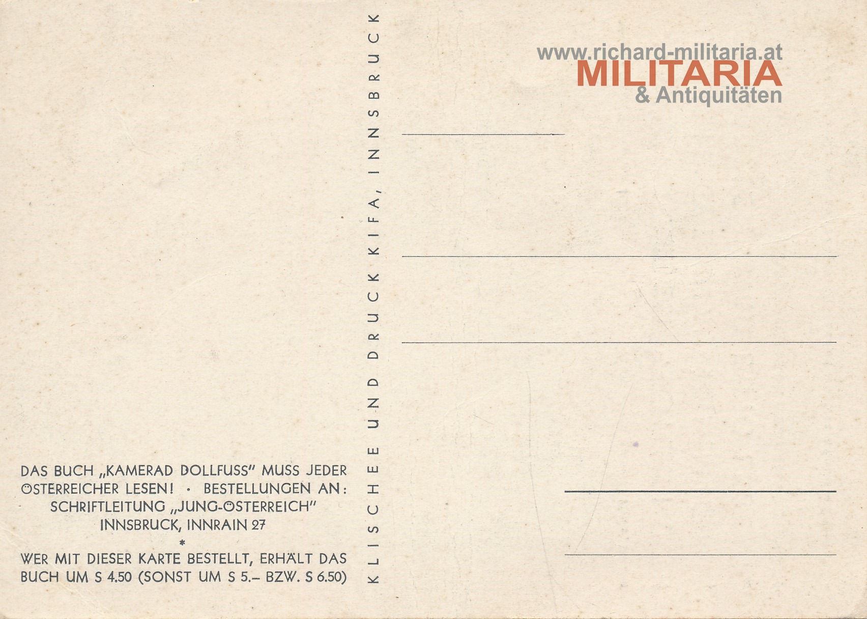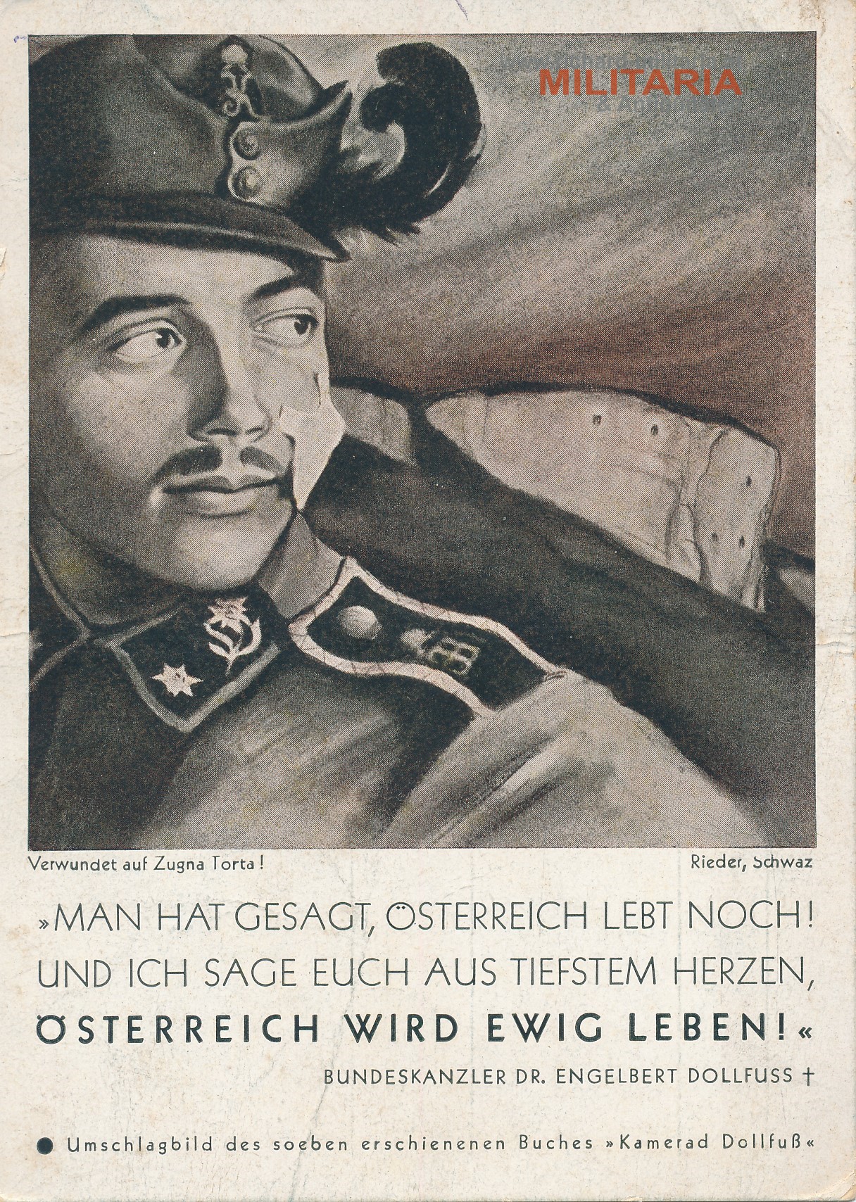 Propagandapostkarte "Man hat gesagt, Österreich lebt noch! und ich sage euch aus tiefstem Herzen, ÖSTERREICH WIRD EWIG LEBEN!"- Bundeskanzler Dr. Engelbert Dollfuss; Umschlagbild des Buches "Kamerad Dollfuß"; leichte Knickspuren