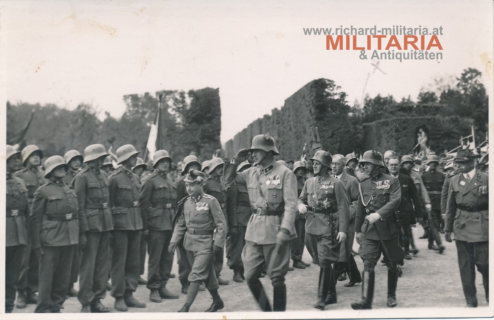 Foto - Dollfuss, Starhemberg (mit KAVALLERIEHELM!!!), Fey und weitere Persönlichkeiten beim Heimwehraufmarsch in Schönbrunn vor 40.000 Mitgliedern (!);