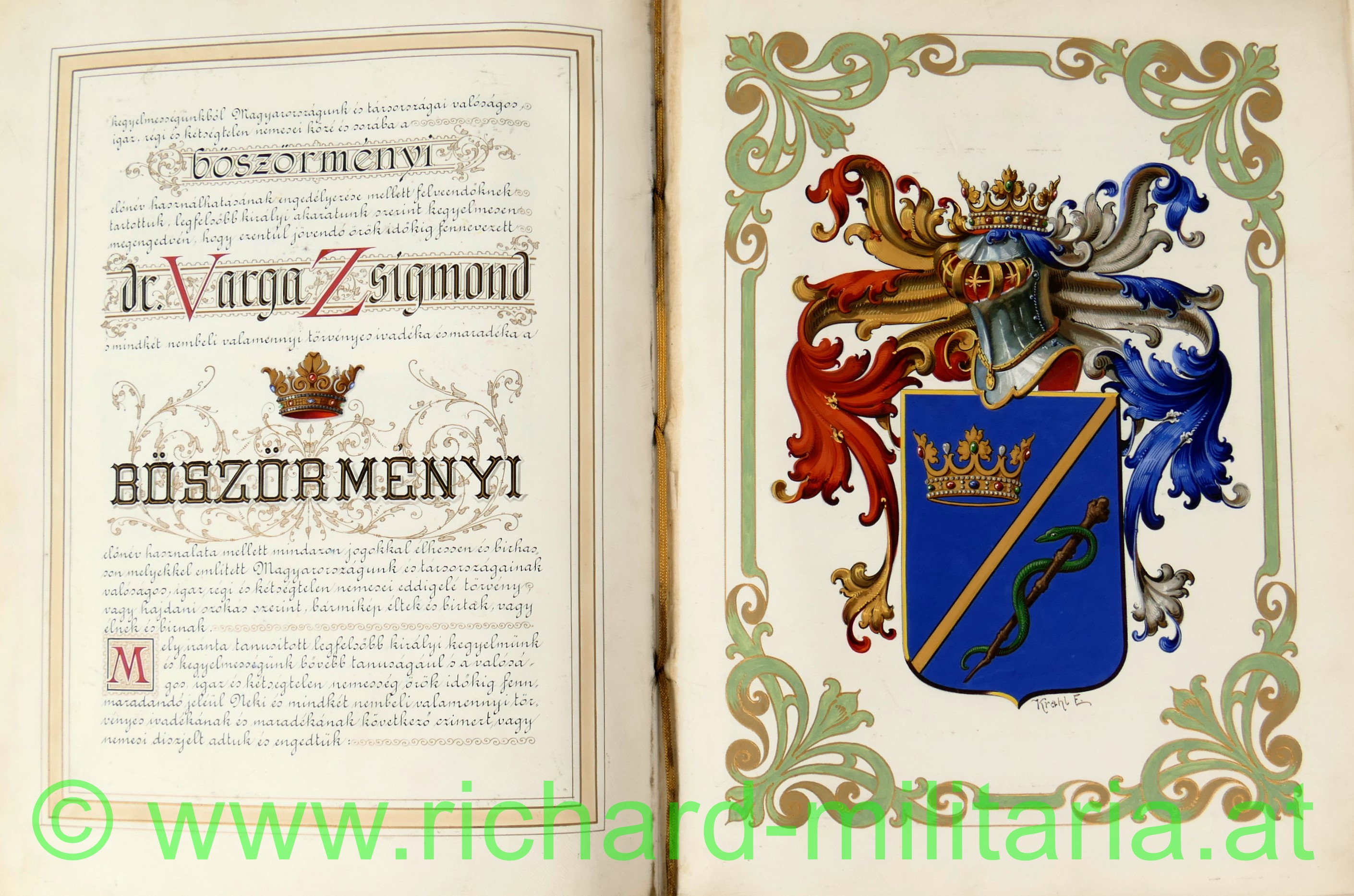 Adeldiplom für den Arzt Dr. Sigmond VARGA, ausgestellt am 28. Februar 1903 in Budapest mit OU von Kaiser Franz Joseph als König von Ungarn (!); ungarische Sprache; rot belederte Verleihungsmappe mit Blindprägung des königlich-ungarischen Wappens - diese mit Gold ausgeführt - mit anhängendem Siegel in Messingkapsel; Pergamentlibell, 7 Seiten (Format 30 x 38 cm) in ungarischer Sprache; aufwändige Malereien und Verzierungen - teilweise goldüberhöht und gedruckte Bordüren; feinste farbige Wappenmalerei - signiert von ERNST KRAHL; aufwändige Kalligraphiearbeit, anhängiges Siegel sehr gut erhalten, Rand der Mappe teilweise bestoßen