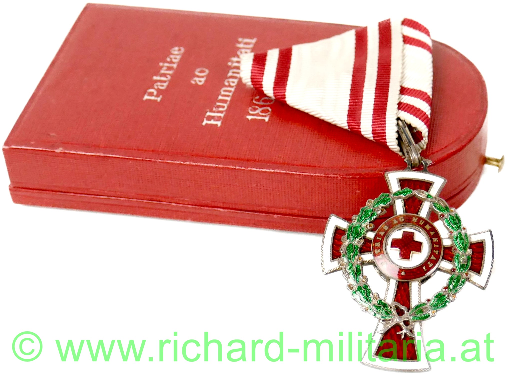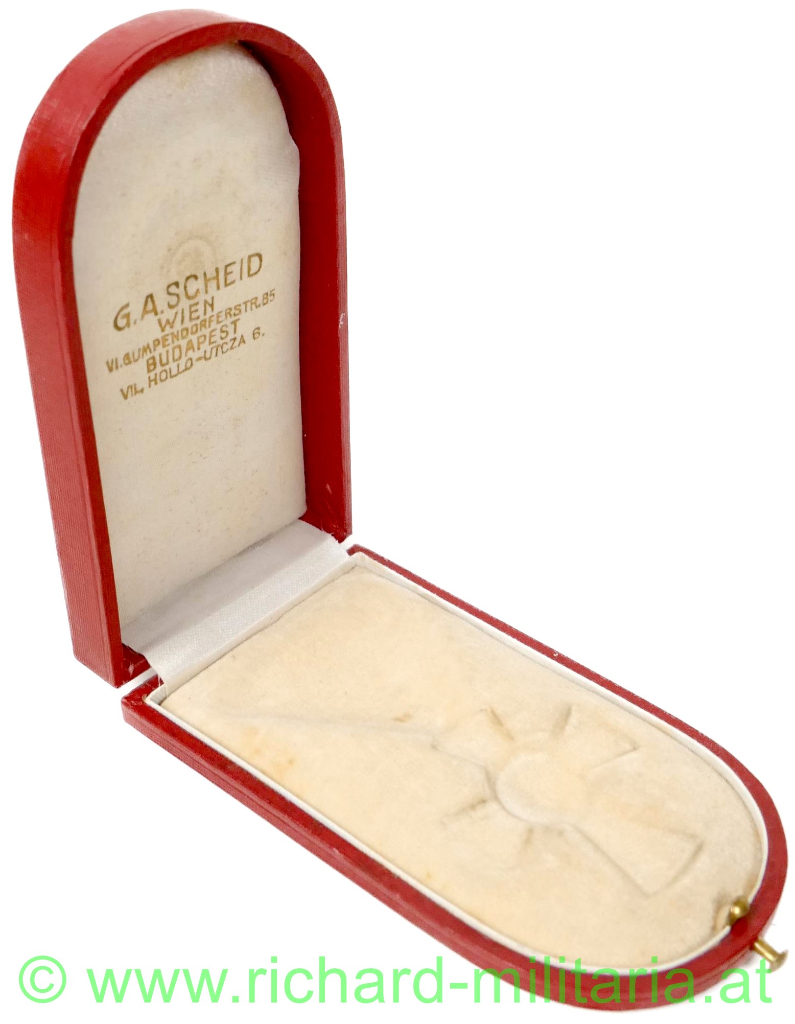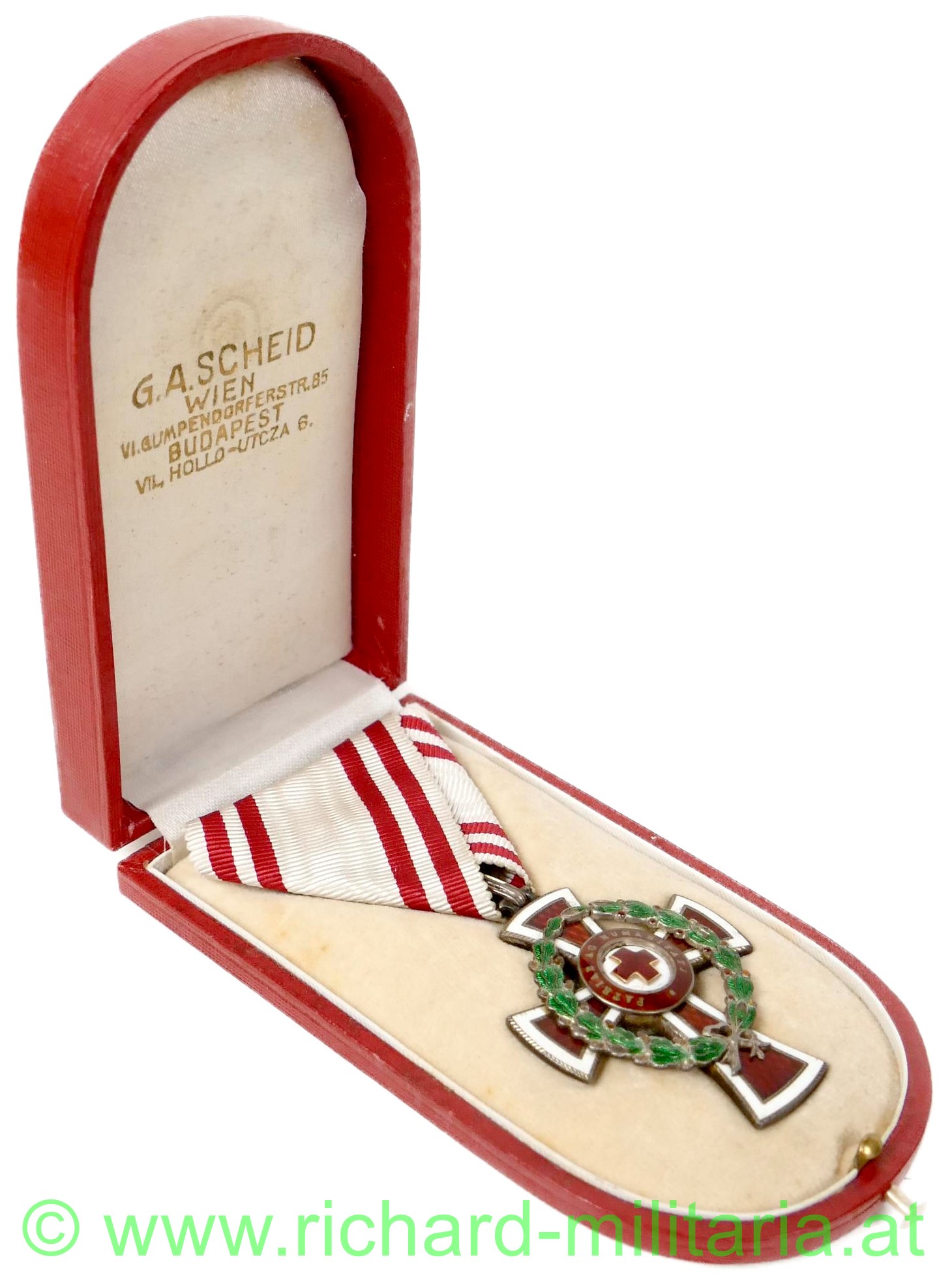 Ehrenzeichen vom Roten Kreuz 2. Klasse mit Kriegsdekoration im originalen Etui; mit Herstellerpunzierung "G.A.S." (G.A.Scheid); mehrere kleine Emaillausbrüche im rechten Teil des Lorbeerkranzes; minimalste Emaillbeschädigung am linken Kreuzarm revers; am originalen Band; rotes zugehöriges Lederetui von G.A.Scheid Wien;