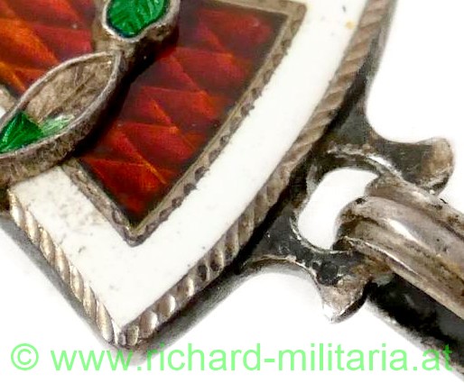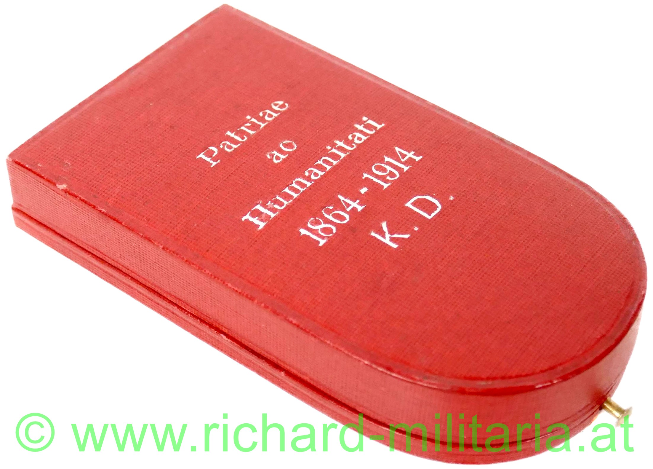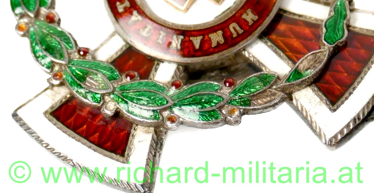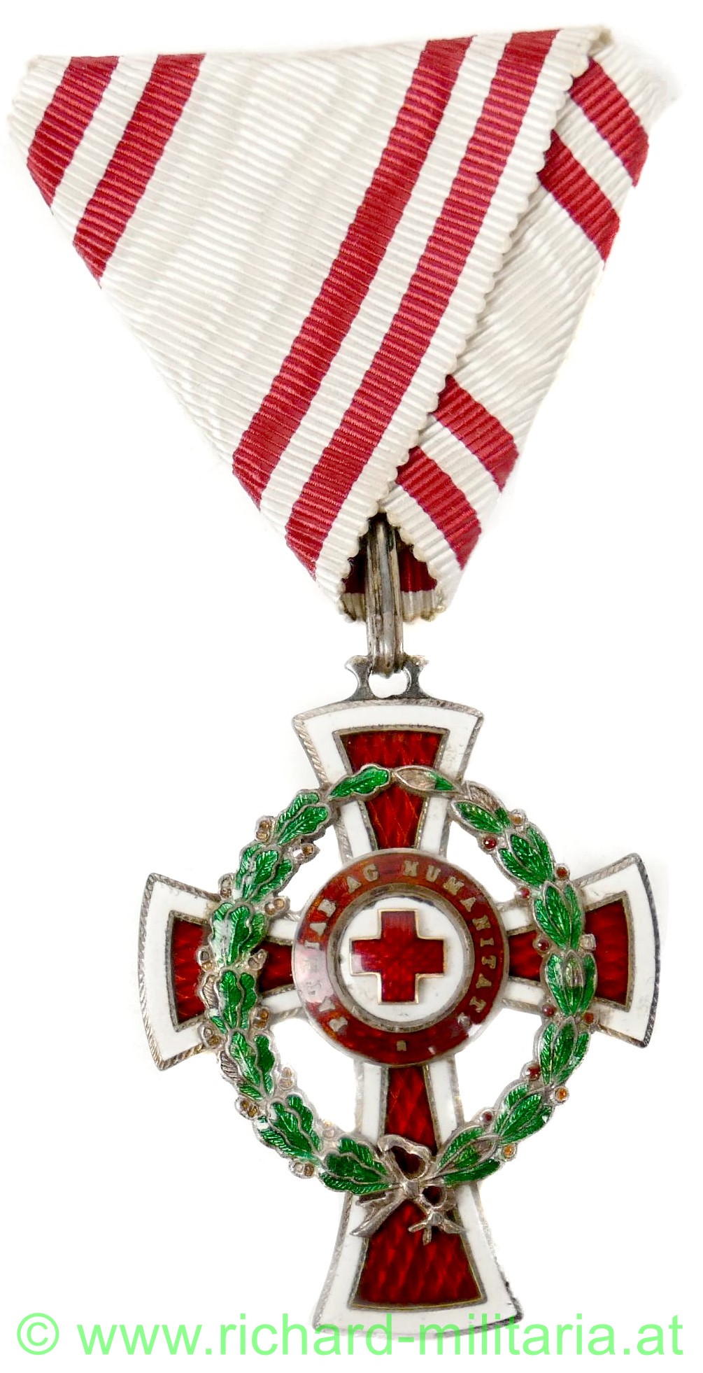 Ehrenzeichen vom Roten Kreuz 2. Klasse mit Kriegsdekoration im originalen Etui; mit Herstellerpunzierung "G.A.S." (G.A.Scheid); mehrere kleine Emaillausbrüche im rechten Teil des Lorbeerkranzes; minimalste Emaillbeschädigung am linken Kreuzarm revers; am originalen Band; rotes zugehöriges Lederetui von G.A.Scheid Wien;
