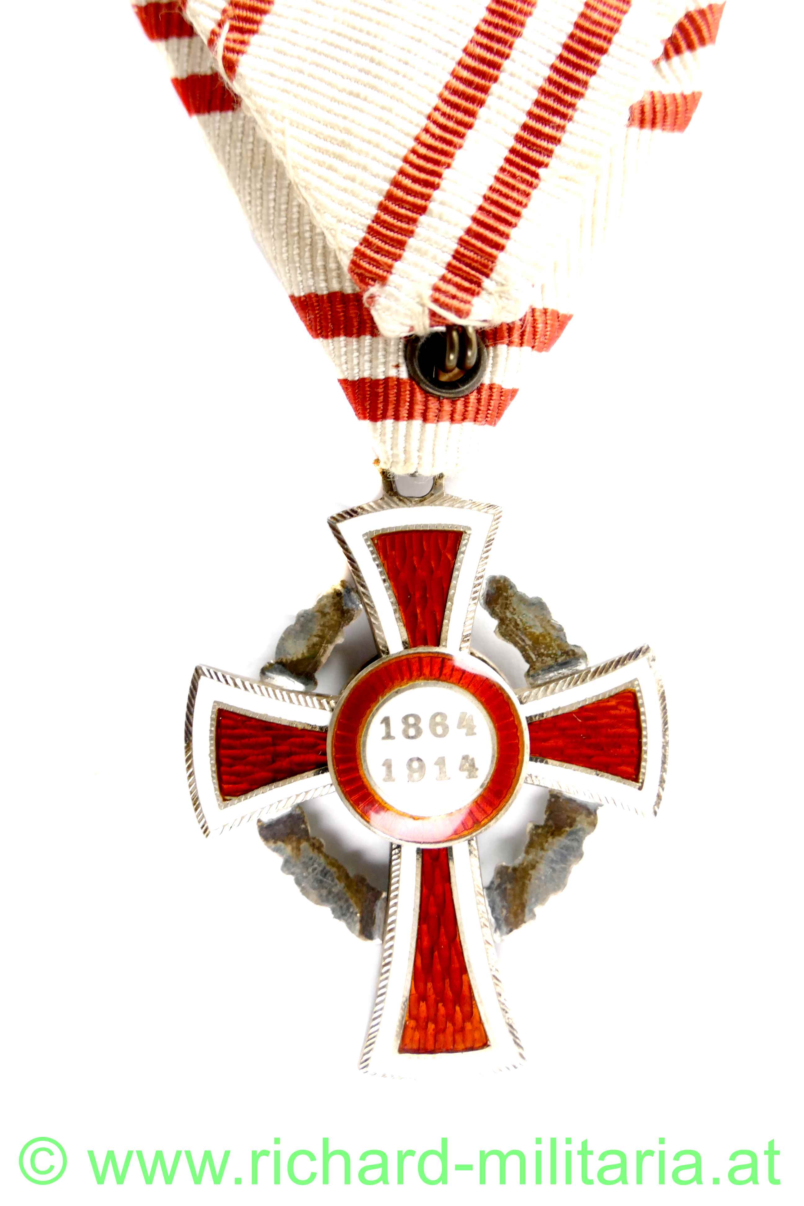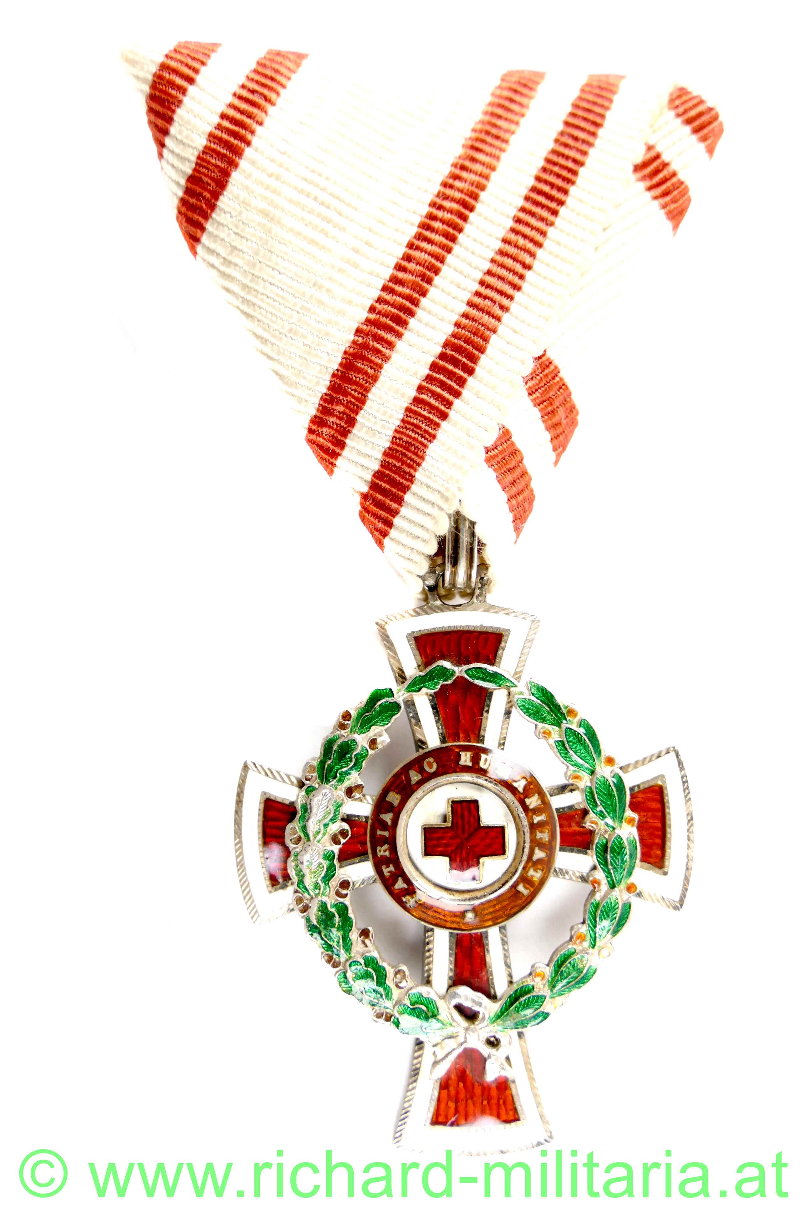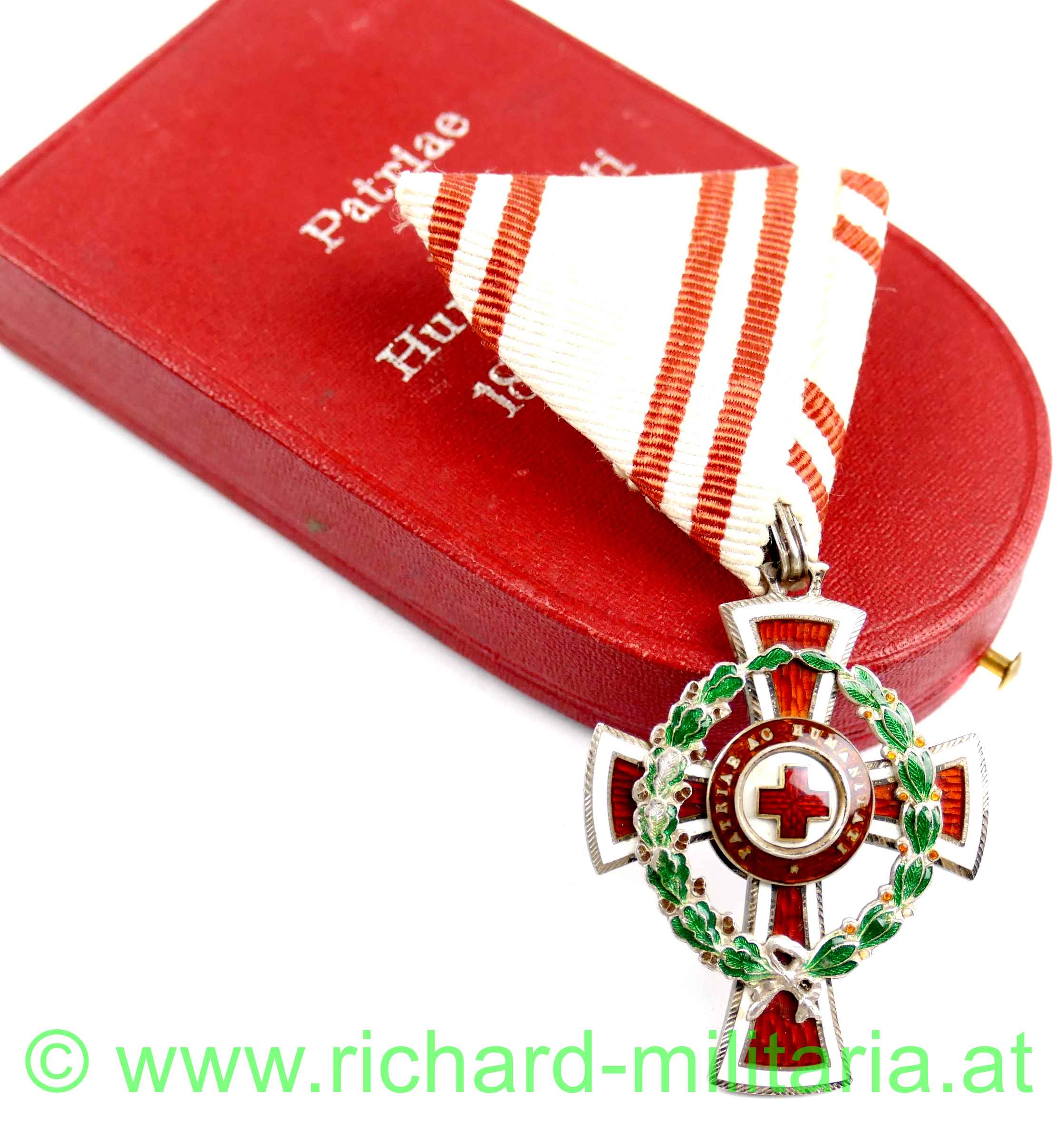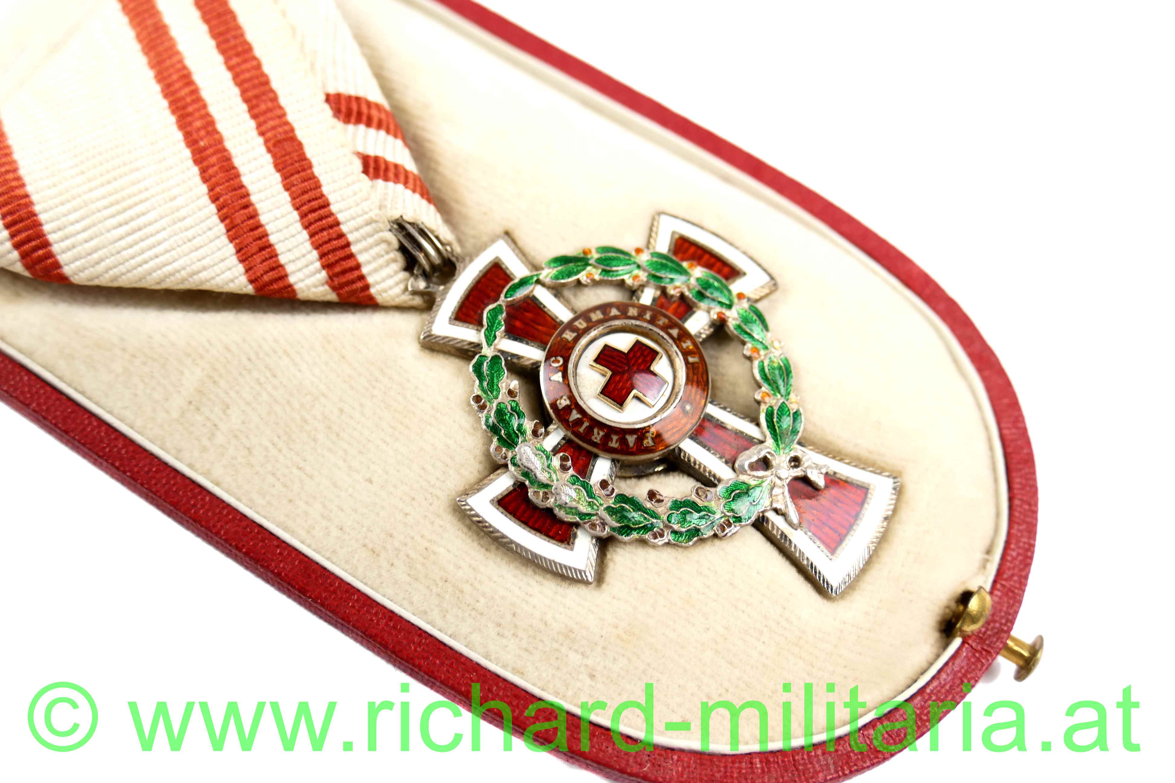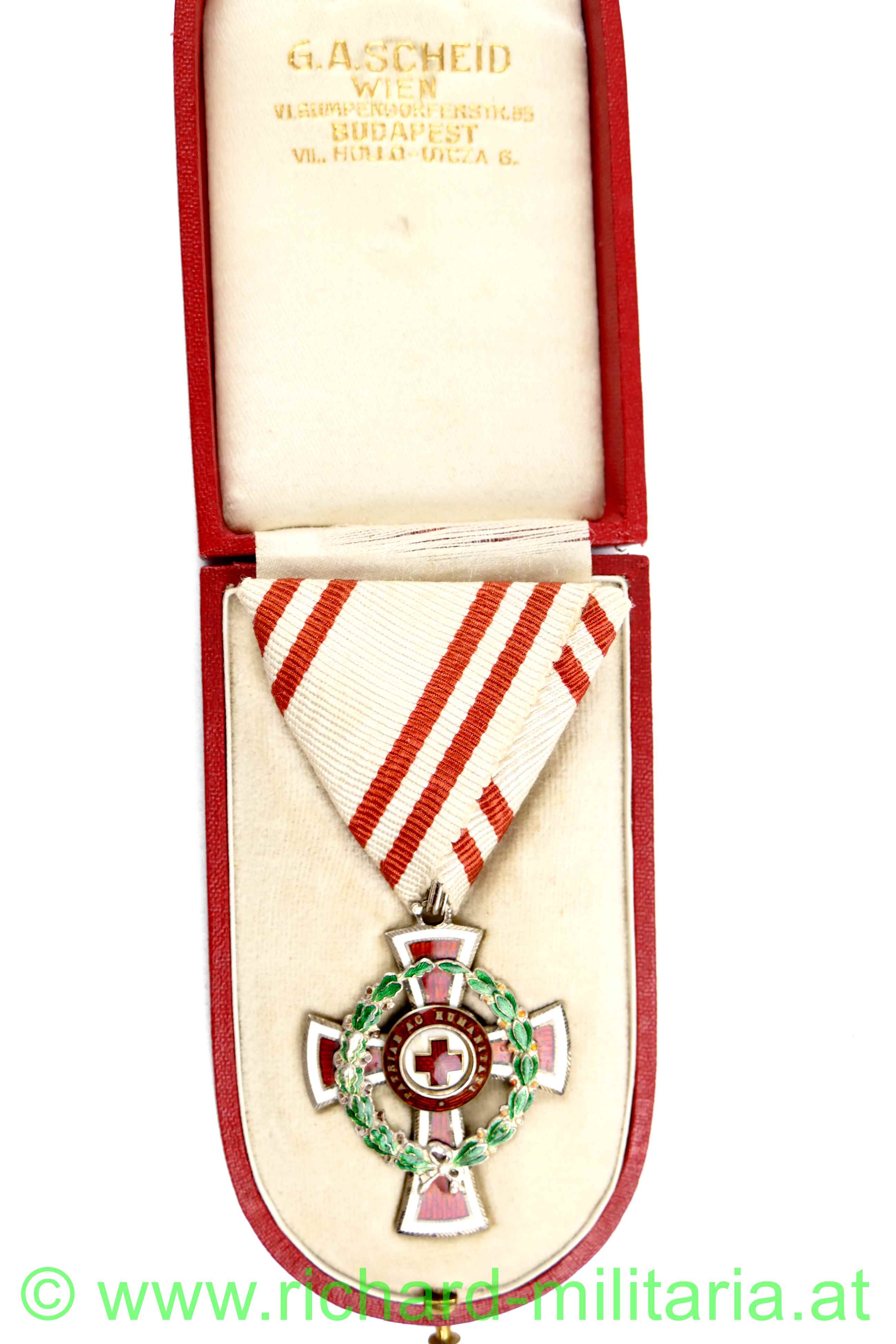Ehrenzeichen vom Roten Kreuz II. Klasse mit Kriegsdekoration im originalen Etui; Silber punziert und emailliert; 2 kleine Fehler in der grünen KD - sonst perfekt! Am originalen Band und im originalen sehr schönen Etui mit Hersteller: "G.A.SCHEID"