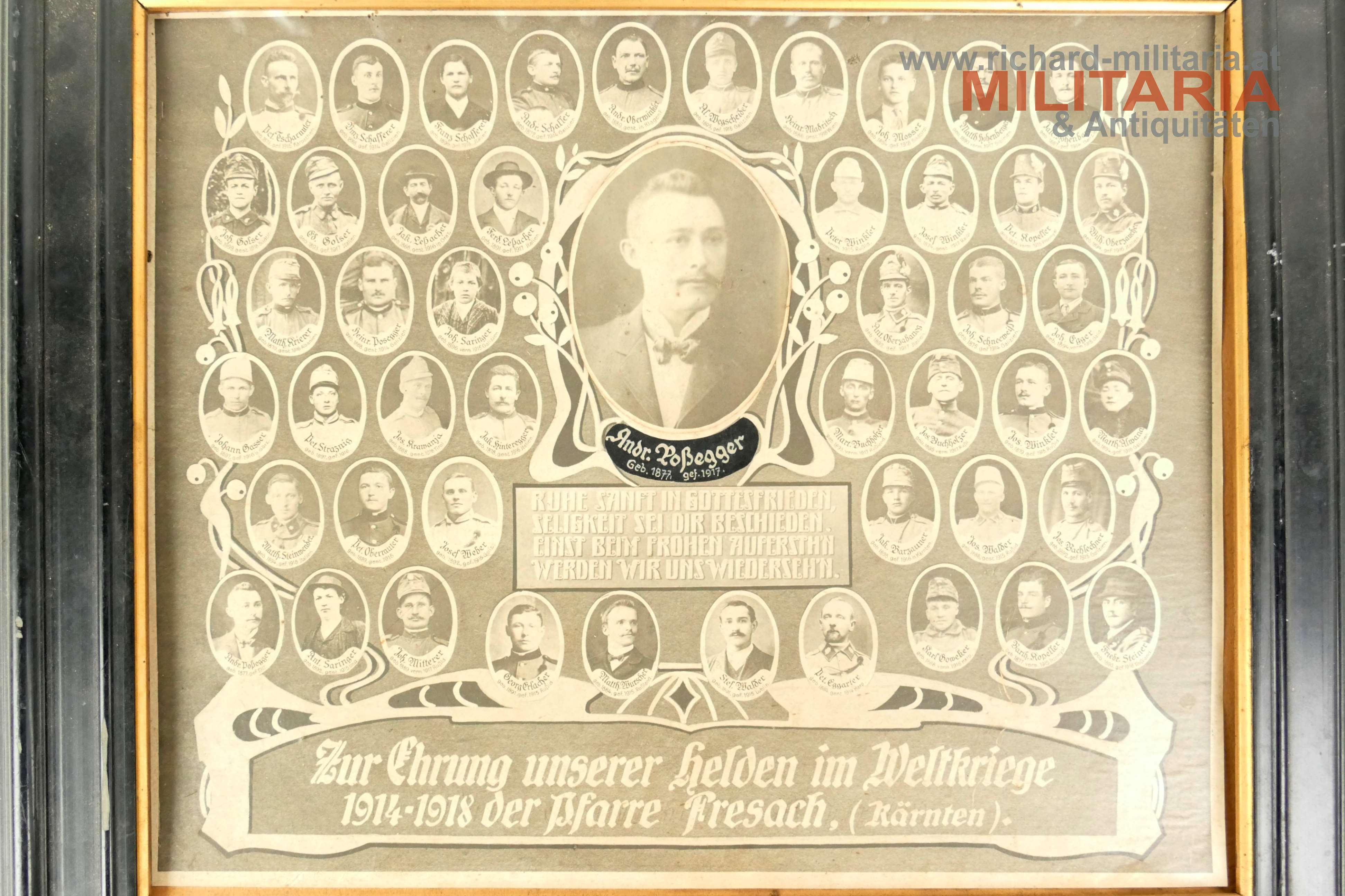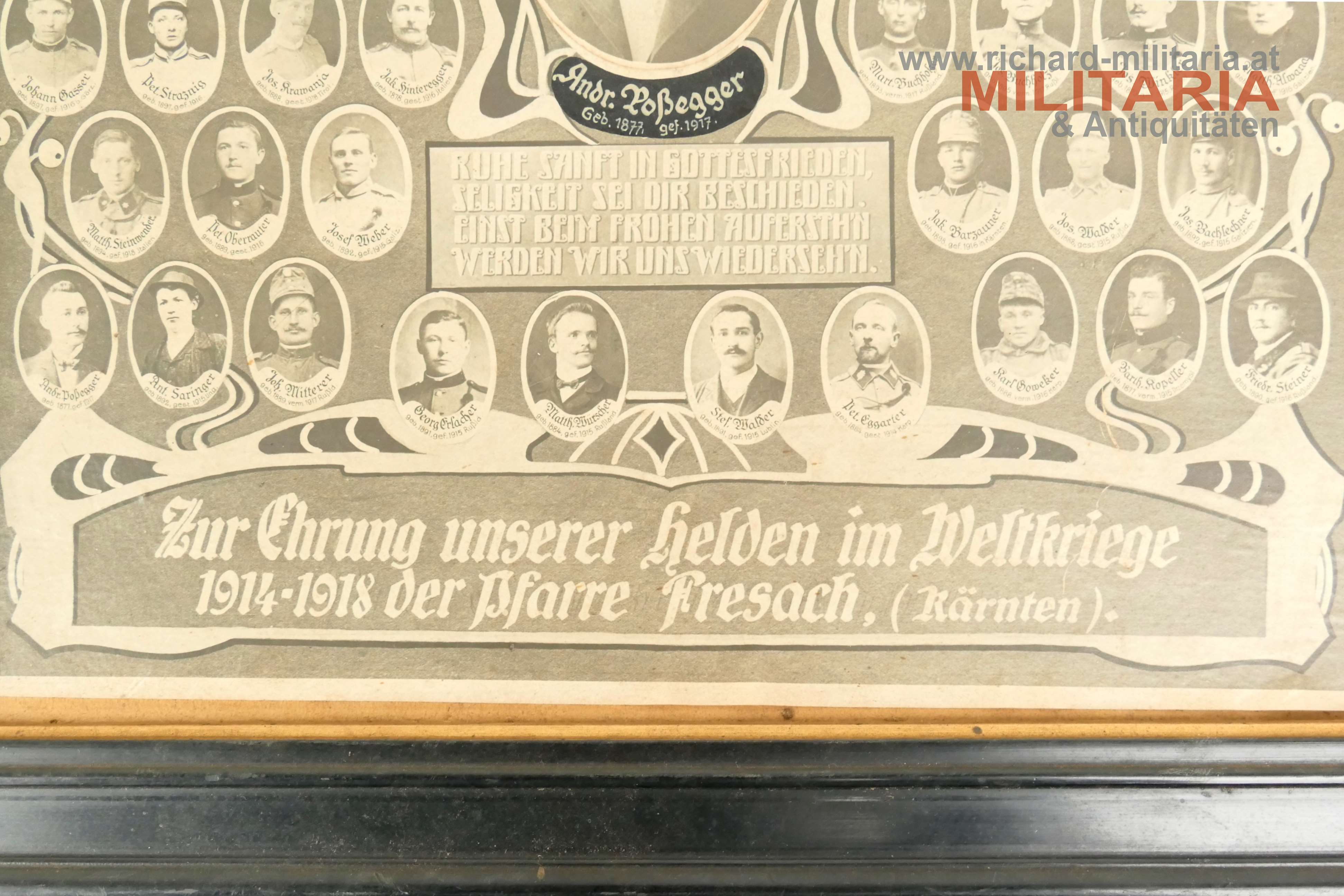 Zur Ehrung unserer Helden im Weltkriege 1914-1918 der Pfarre Fresach - Kärnten; Blatt auf Hartkarton aufgeklebt; in schwarzem Holzrahmen;
