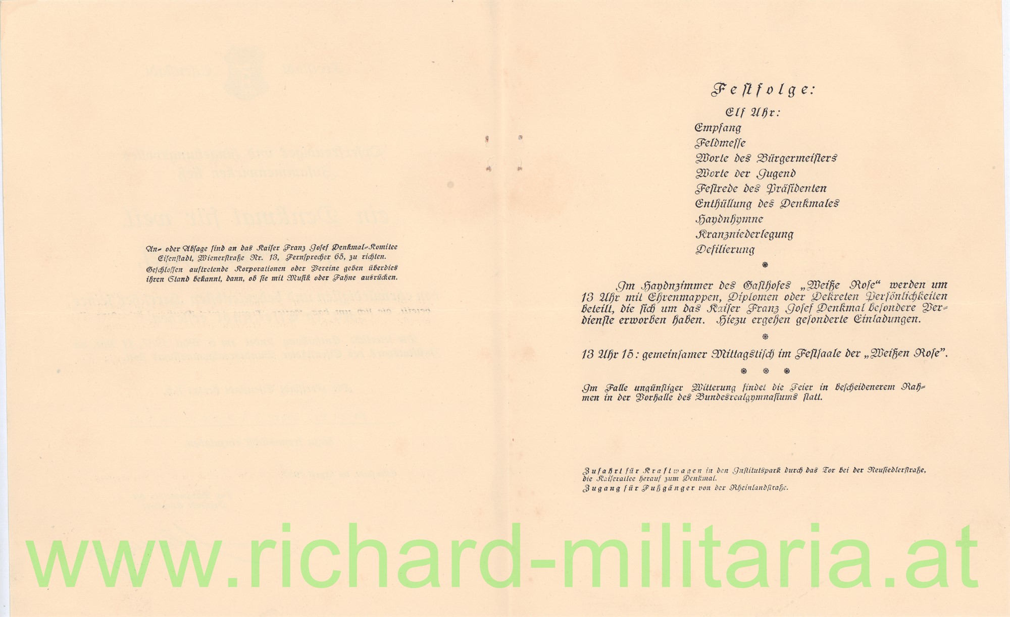 Produktinformationen "Einladung zur Enthüllung eines Denkmals für Kaiser Franz Josef 1937 - Freistadt Eisenstadt"