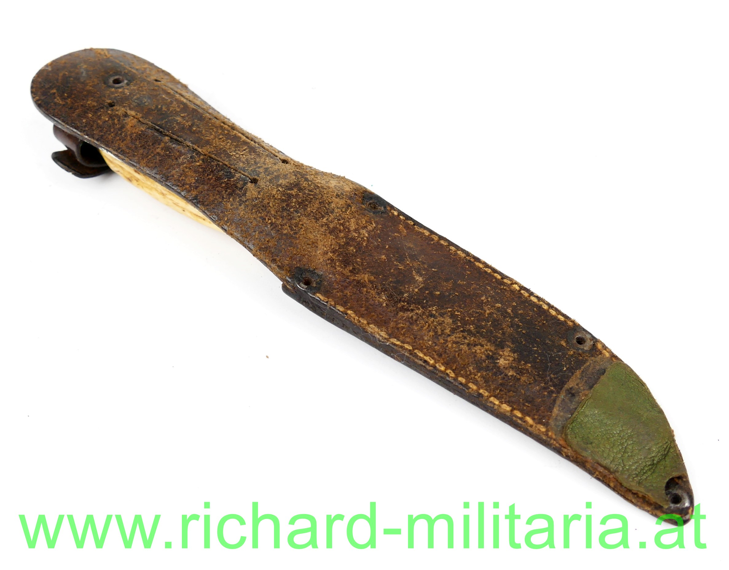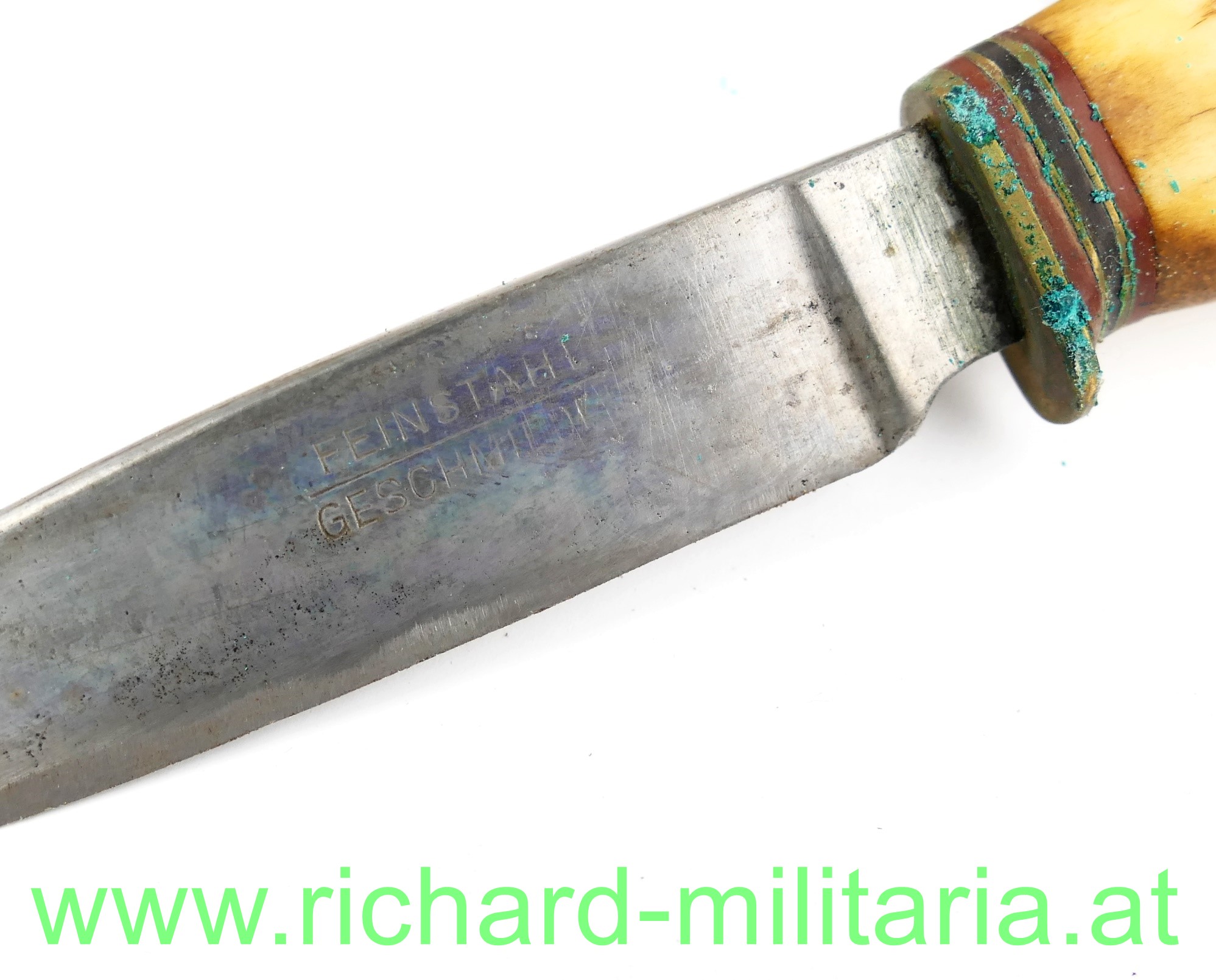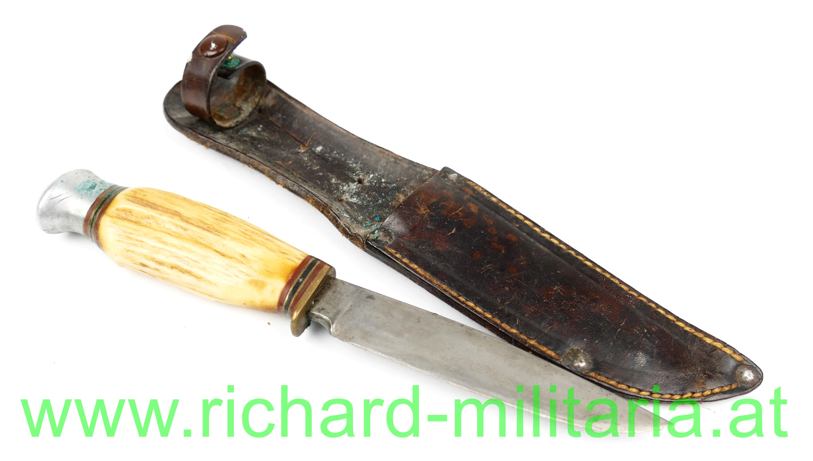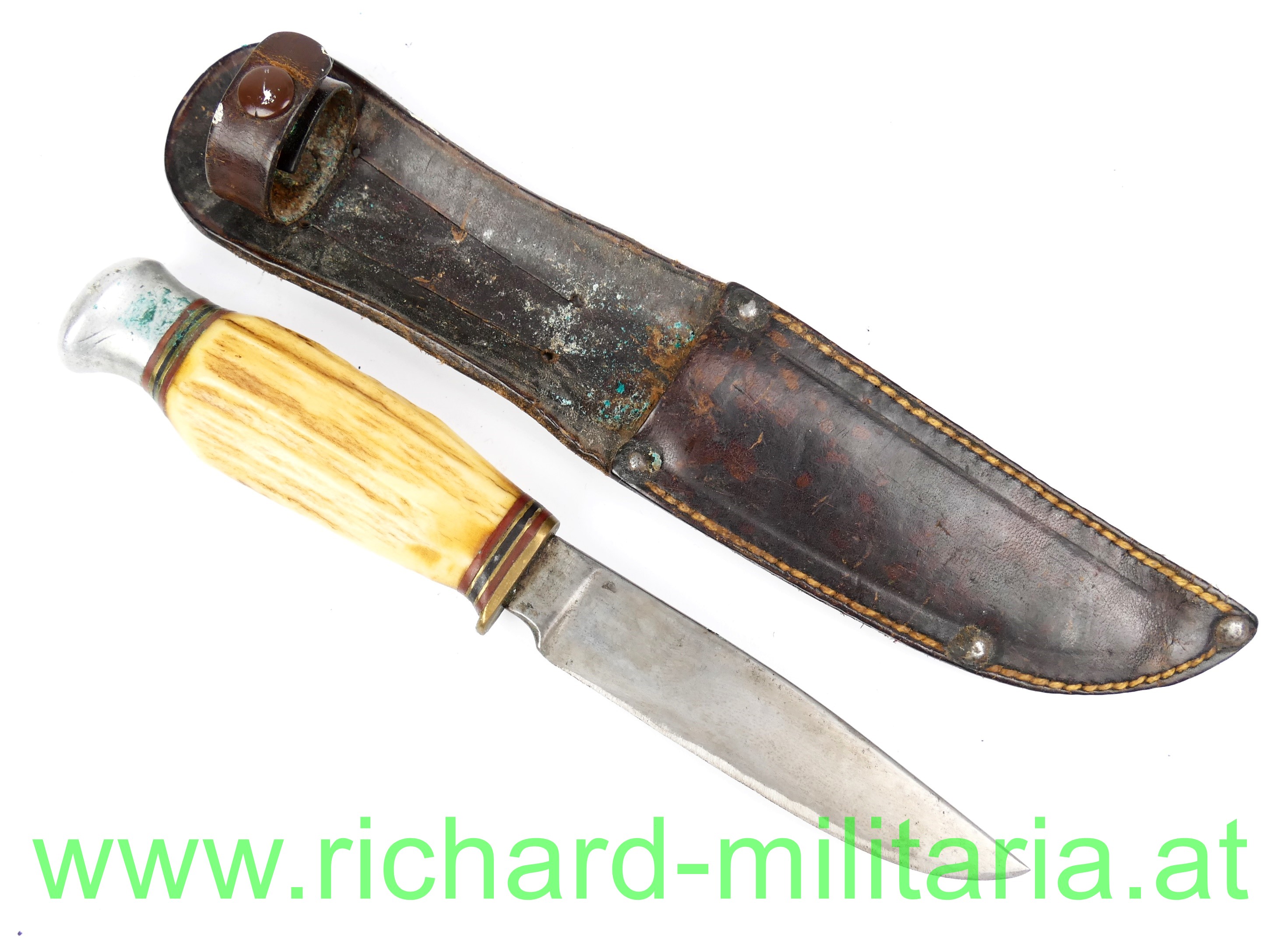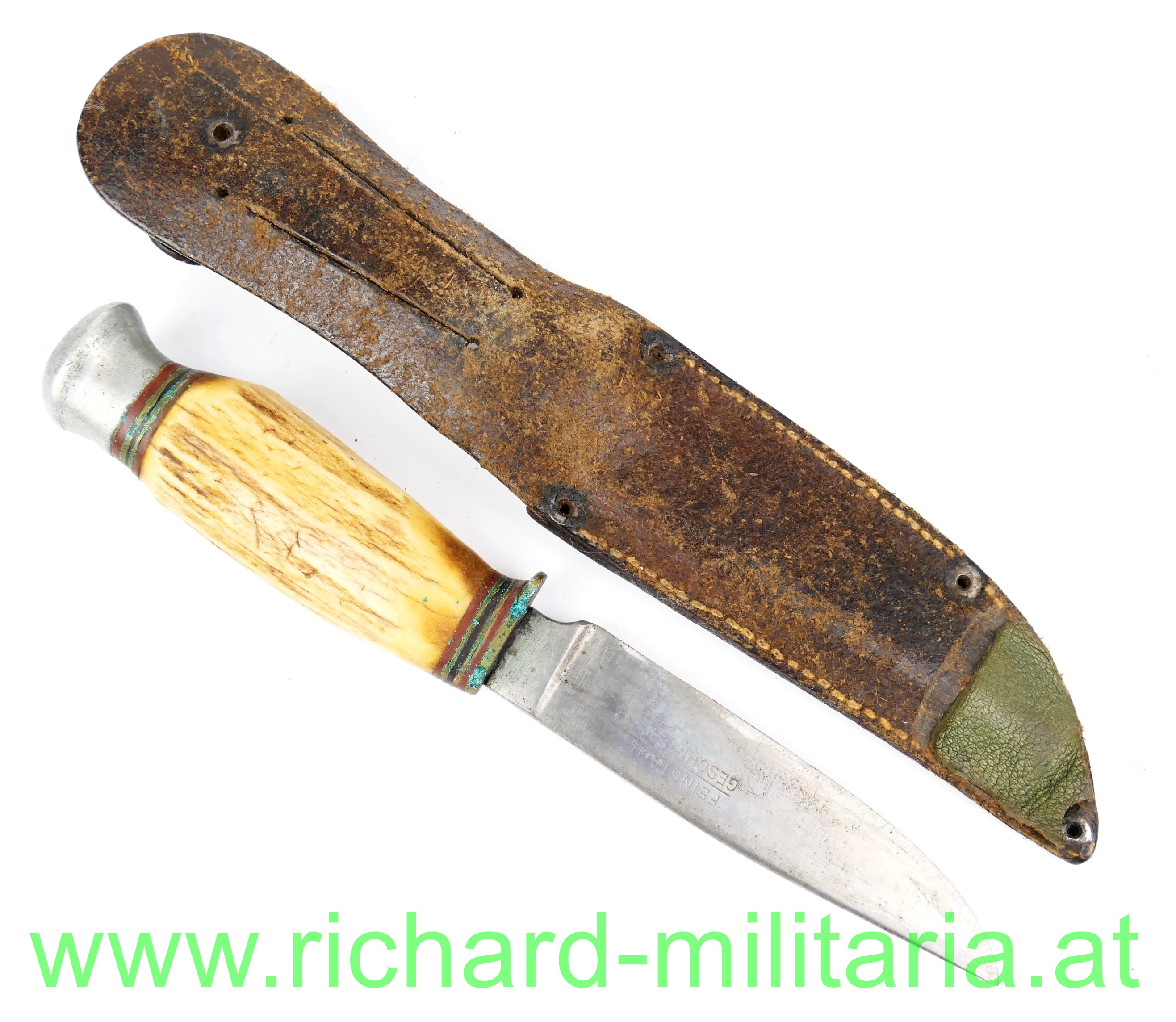 Fahrtenmesser - Feinstahl geschmiedet, Griff aus Hirschhorn mit Aluminiumabschluss, Klinge mit Bezeichnung: "Feinstahl geschmiedet" ohne ersichtlichen Hersteller, - Klinge geschärft etwas fleckig, dazu passende Lederscheide fürs Tragen am Gürtel; Gesamtlänge 19 cm
