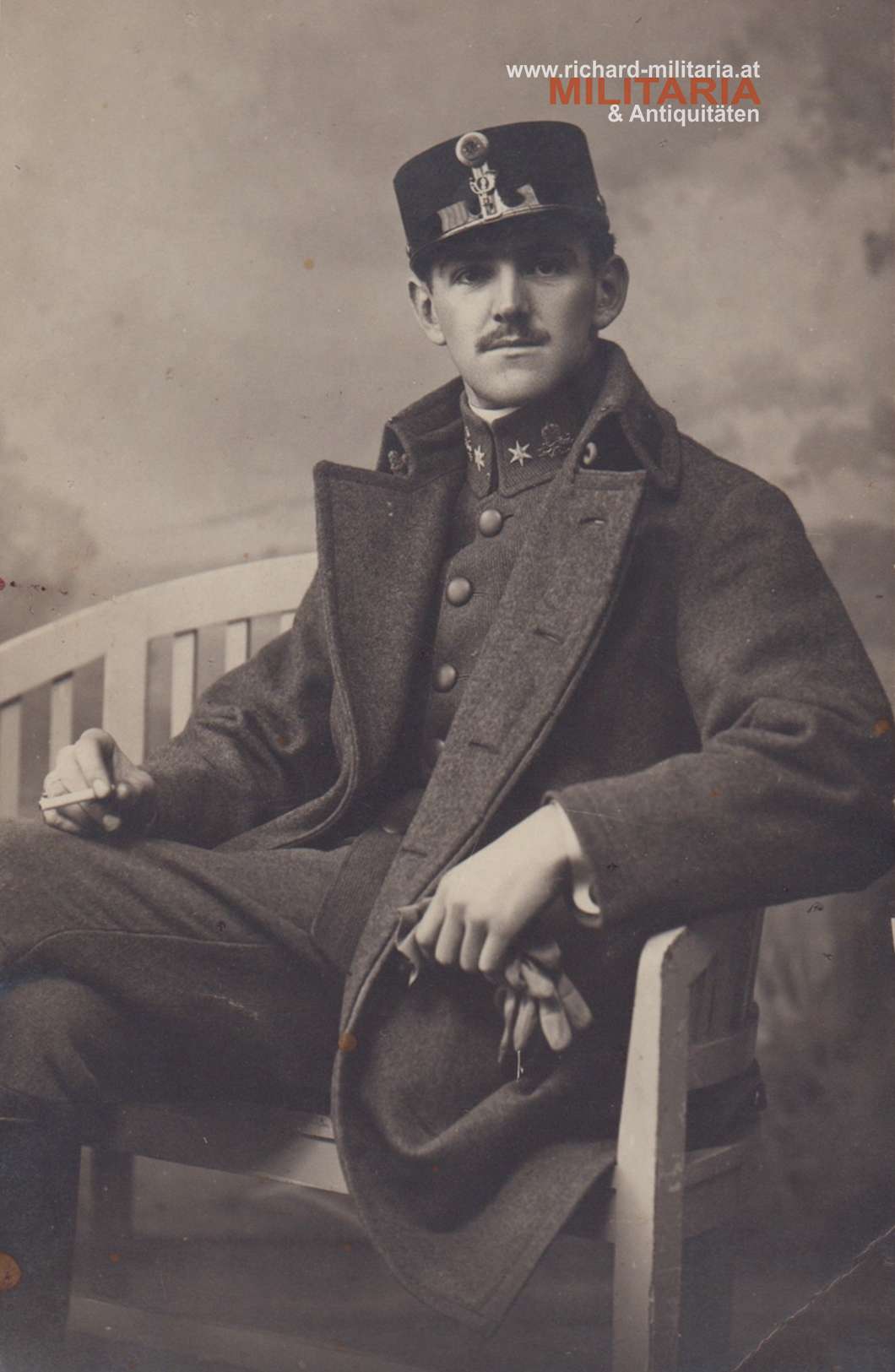 Leutnant des MG-Zuges mit dem Jägerhorn des Feldjäger-Baons Nr. 2 auf der Kappe; er trägt eine Karl-Feldbluse aus Cordstoff; originales Foto in Postkartenformat;