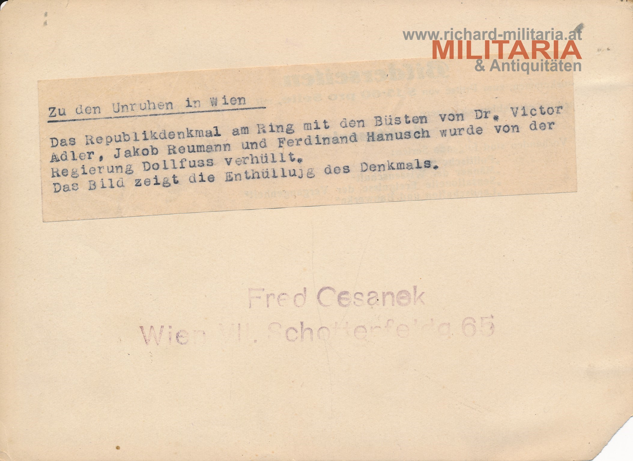 Foto "Republikdenkmal" Enthüllung, Pressefoto im Format A5 mit Klebezettel auf der Rückseite; Fred Cesanek; Wien VII.; Eckschaden