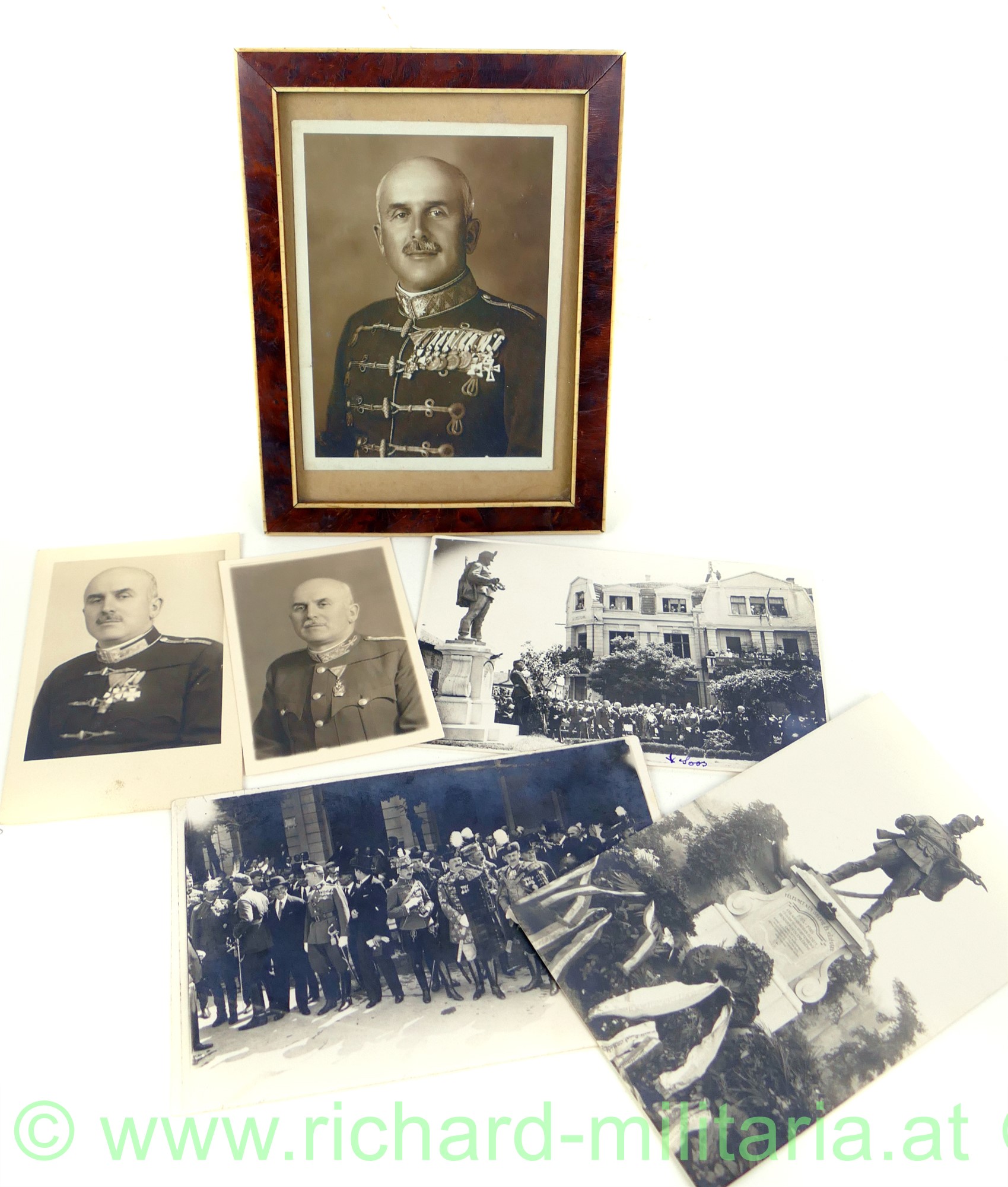Fotokonvolut eines Offiziers aus der k.u.k. Armee bzw. in der Weiterverwendung bei der ungarischen Armee in der Zwischenkriegszeit; schönes Portraitfoto in ungarischer Uniform mit zahlreichen Orden und Auszeichnungen (Orden der Eisernen Krone abwärts - dabei auch ungarische Auszeichnungen aus der Zwischenkriegszeit!); - wenig kleiner als Postkartenformat in schönes Holzrahmen; dazu 5 weitere Fotos
