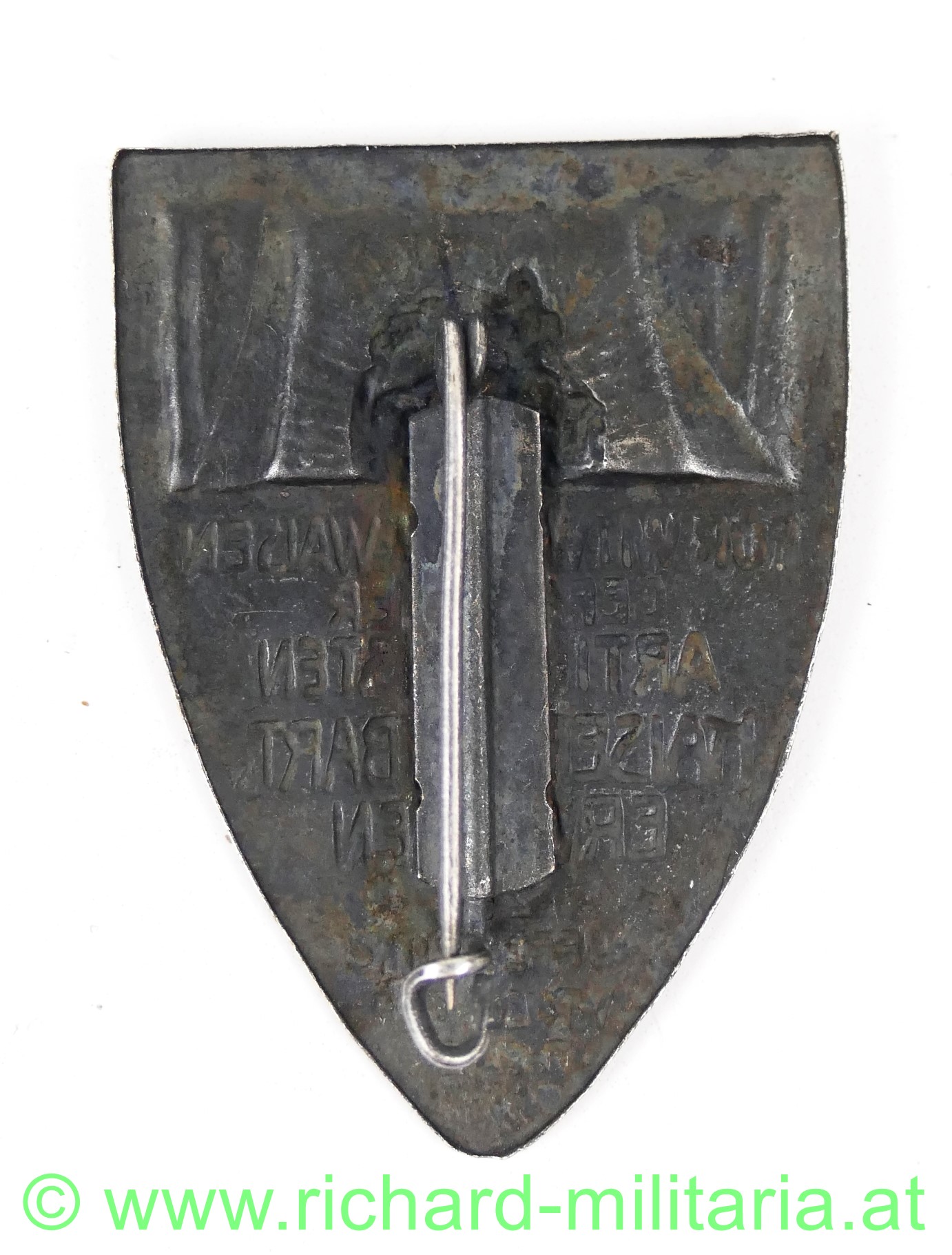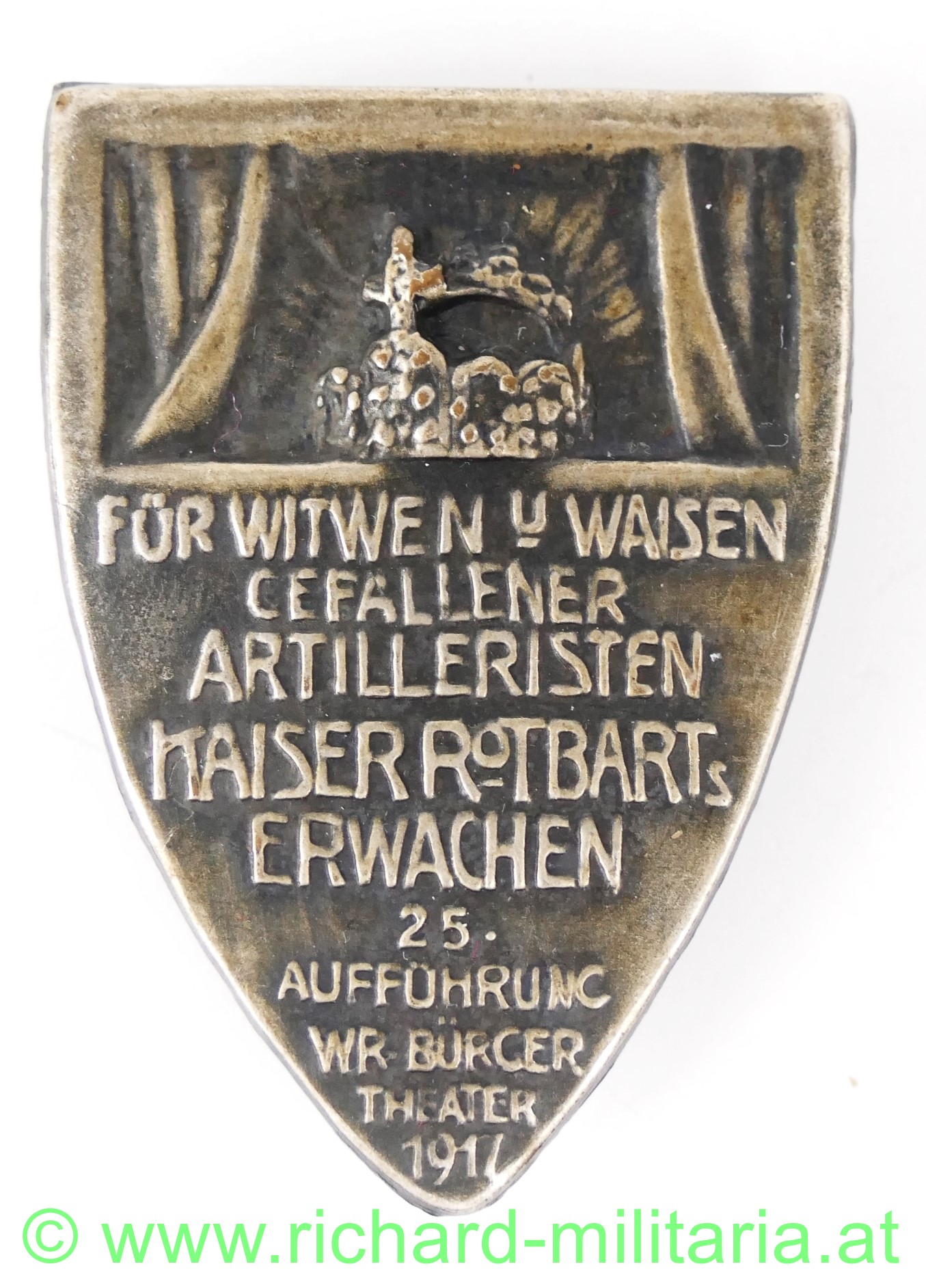 Abzeichen zur 25. Aufführung Wr. Bürgertheater "Kaiser Rotbart`s Erwachen" zu Gunsten der Witwen und Waisen gefallener Artilleristen im 1. Weltkrieg, datiert 1917, Weißblech, originale Nadel