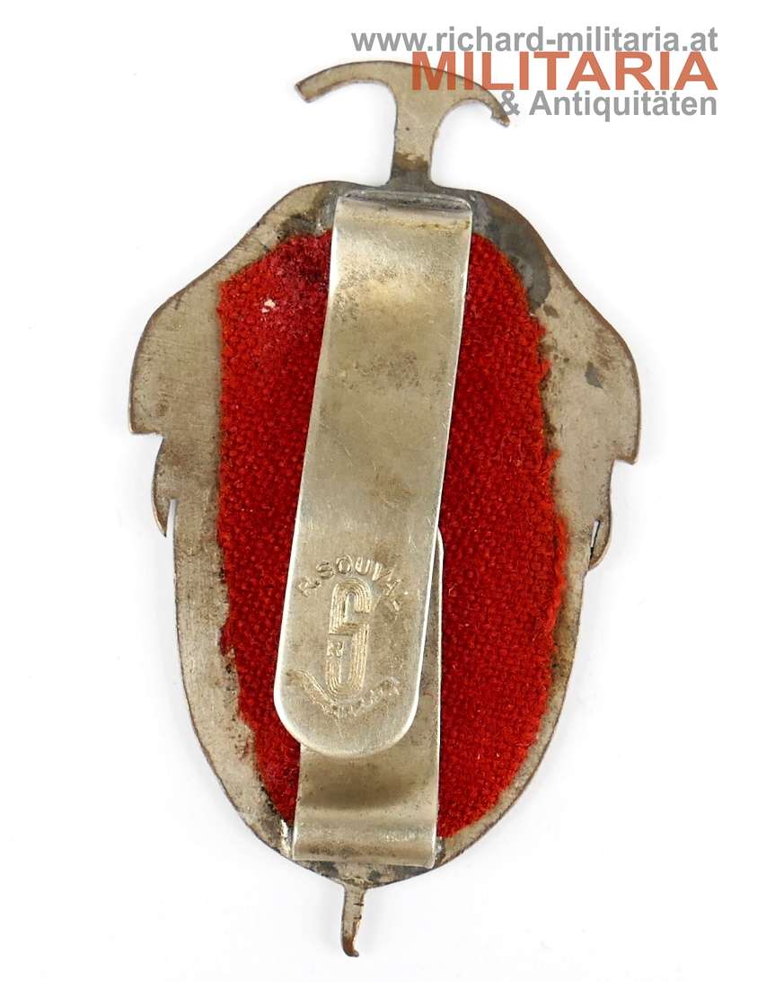 Österreich Gendarmerie - Abzeichen für Alpinisten, 1. Typ aus der 2. Republik in sehr früher Fertigung (!); hochovales Abzeichen aus Tombak versilbert, grün emaillierter (!) Schriftzug "Gendarmerie Alpinist" (kleiner Emailchip oben mittig), Abzeichen mit rotem Tuch hinterfüttert; magnetische Tragelasche mit Hersteller Souval, Wien