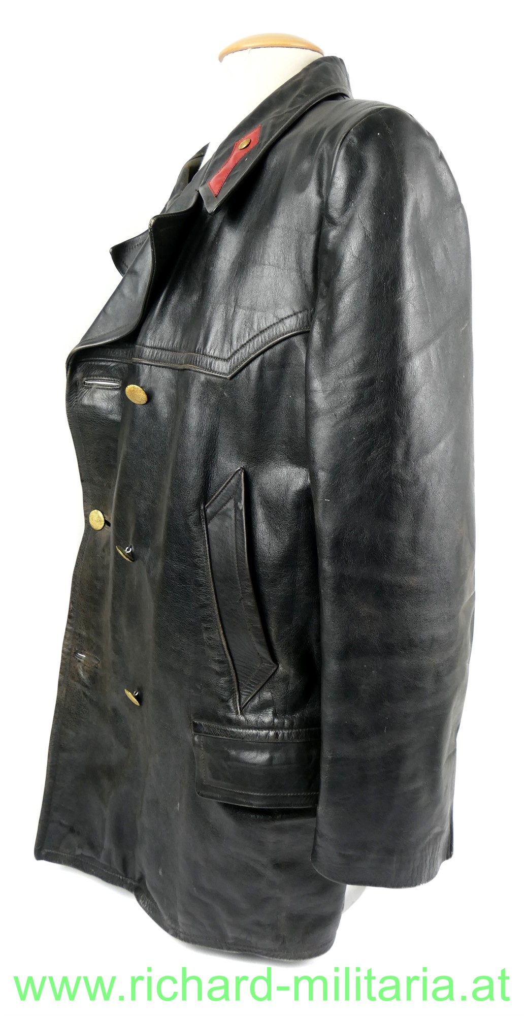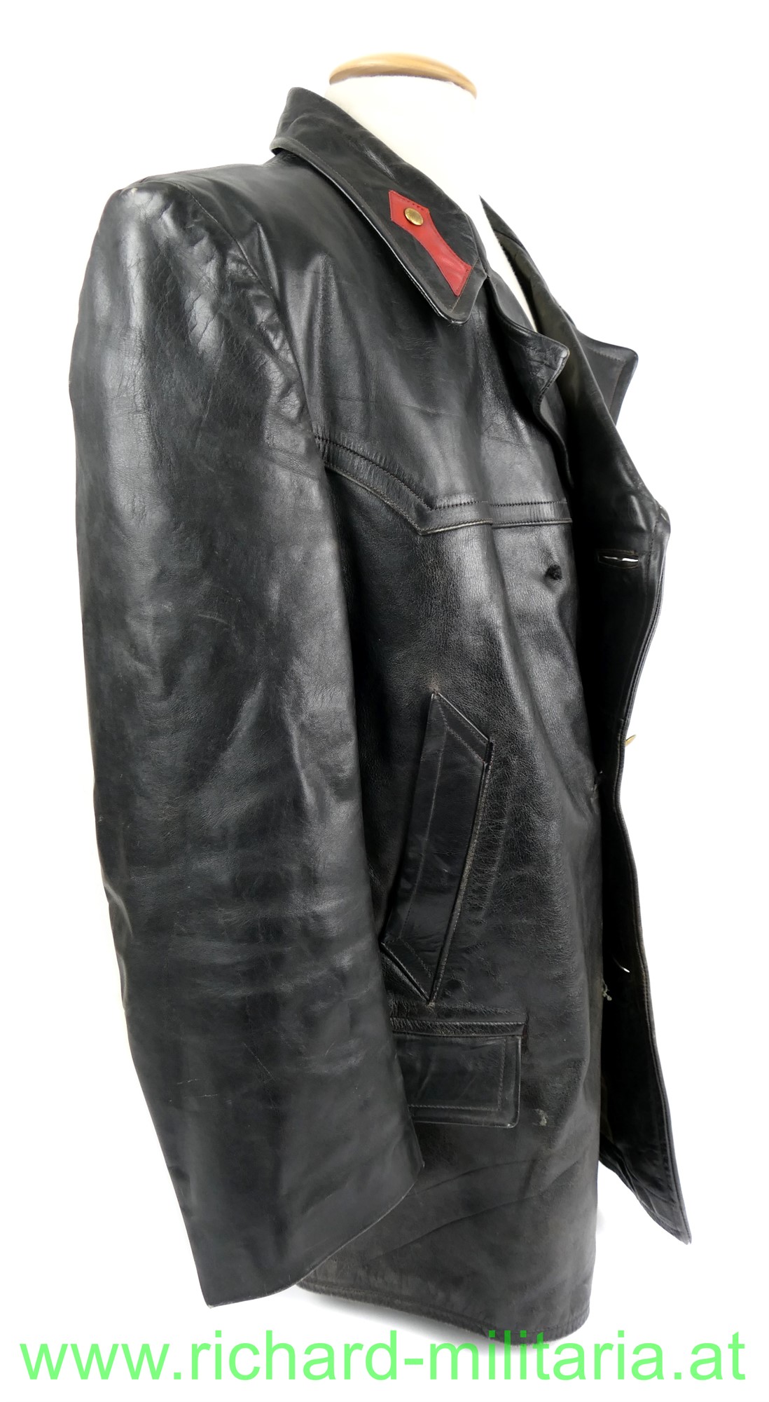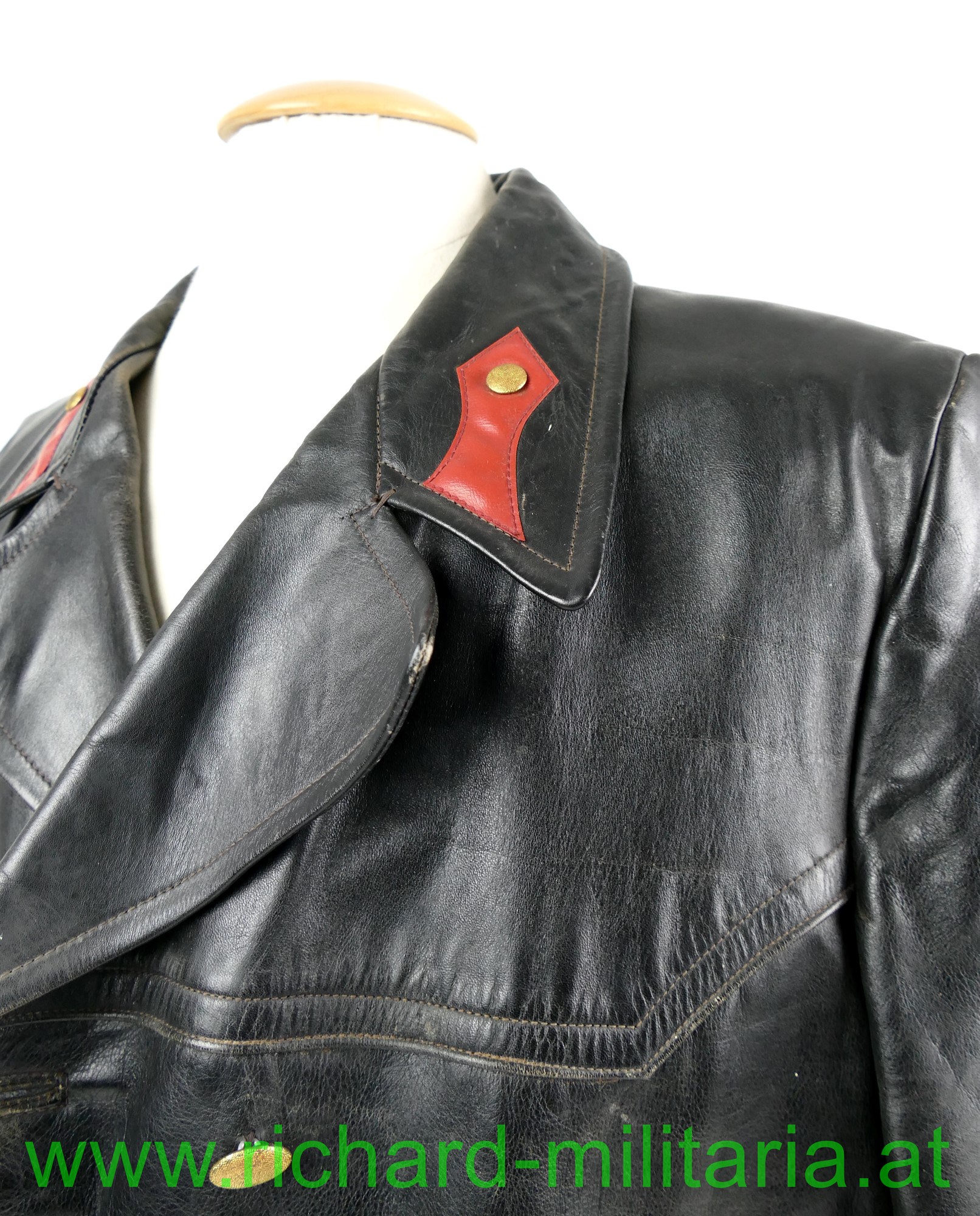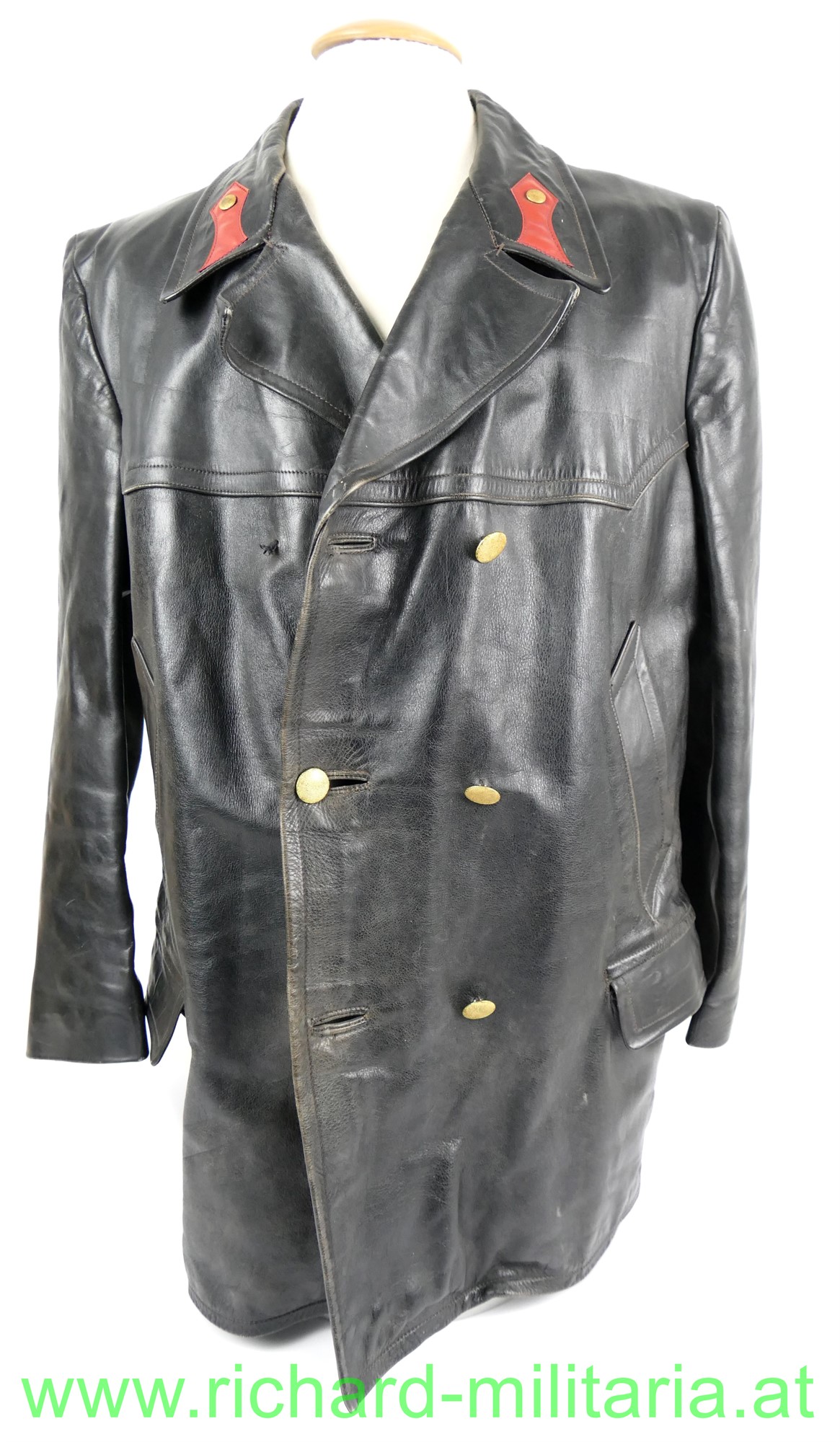 Österreich Gendarmerie - Lederjacke; Dienstjacke, schwarzes Leder, doppelreihig mit je 3 goldenen Knöpfen, am Kragen die roten Dienstlitzen; 2 seitliche Einschubtaschen und darunter 2 eingesetzte Taschen; Größe 54; innen mit braunem feinen Stoff gefüttert; 2 Brusttaschen innen. 1 Knopf fehlt;