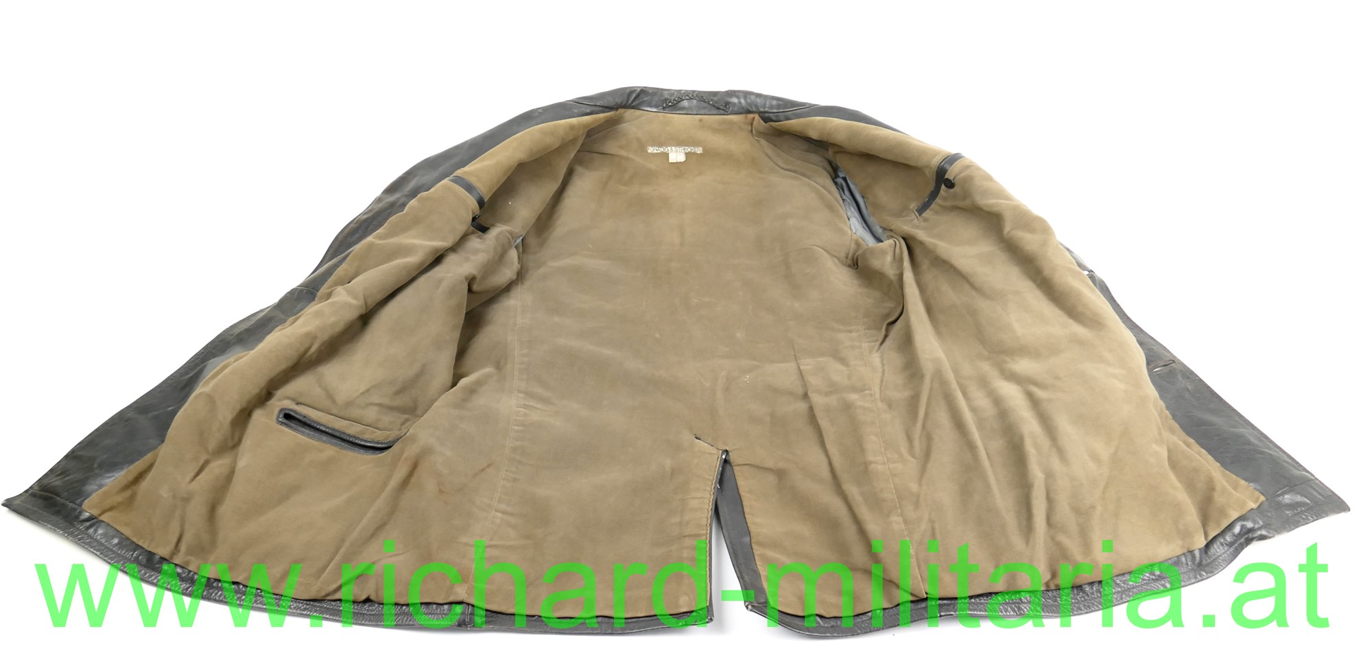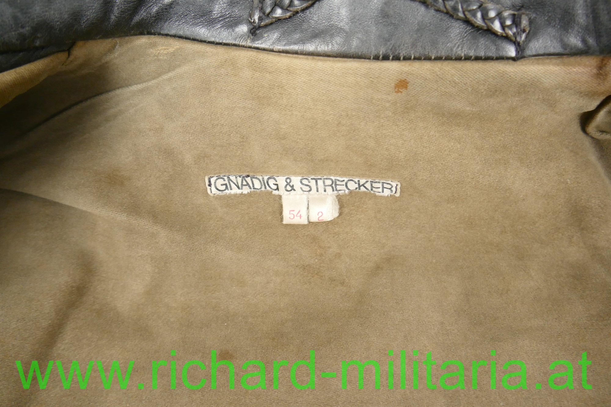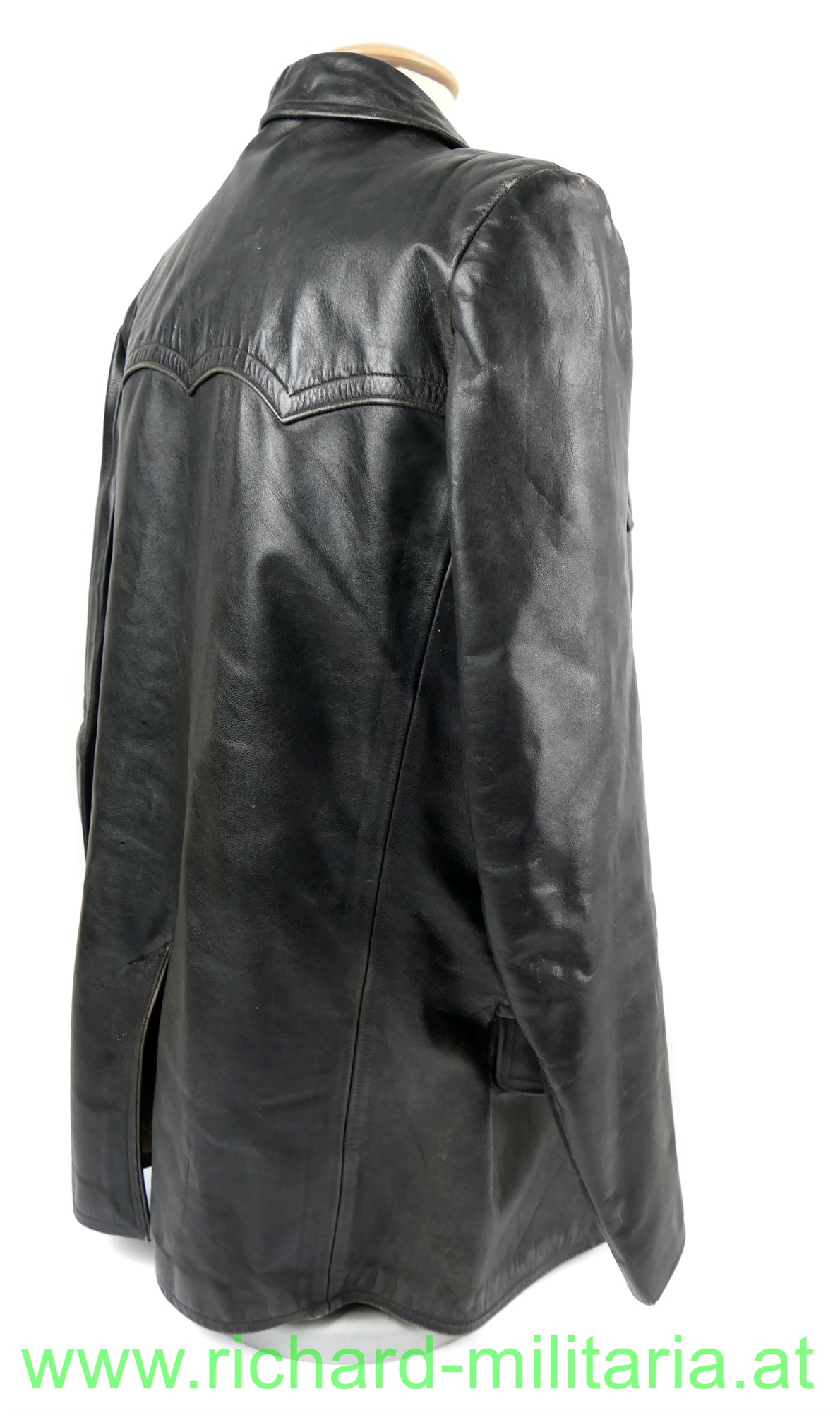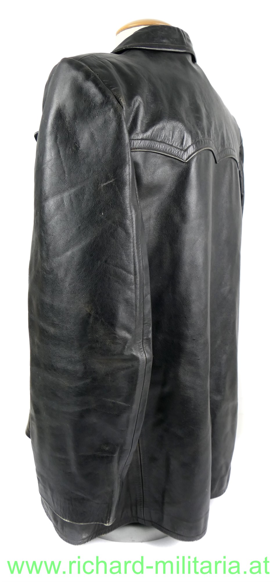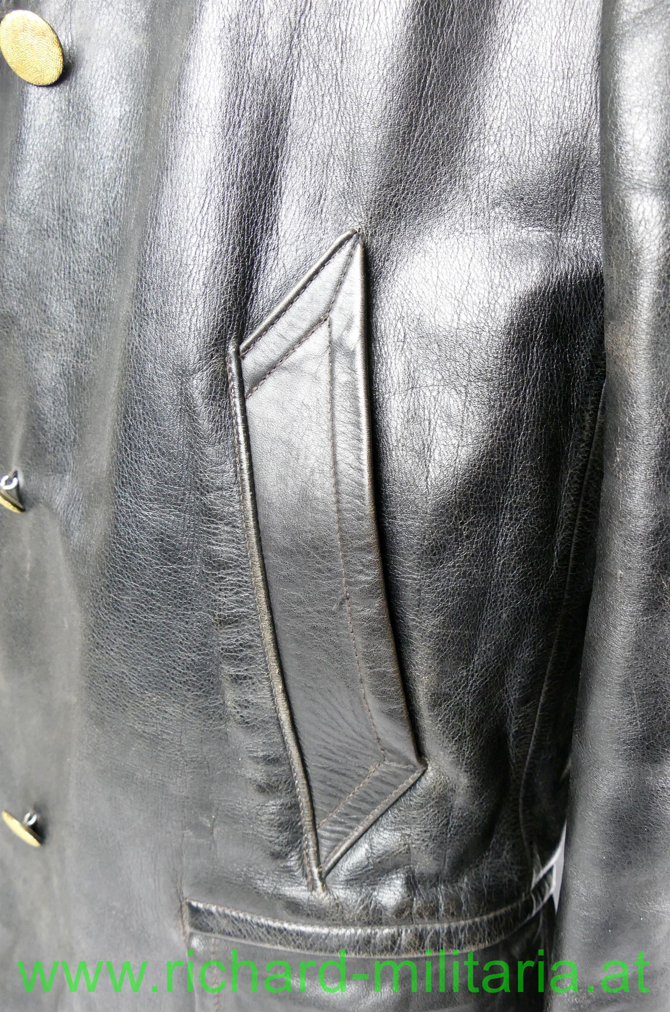 Österreich Gendarmerie - Lederjacke; Dienstjacke, schwarzes Leder, doppelreihig mit je 3 goldenen Knöpfen, am Kragen die roten Dienstlitzen; 2 seitliche Einschubtaschen und darunter 2 eingesetzte Taschen; Größe 54; innen mit braunem feinen Stoff gefüttert; 2 Brusttaschen innen. 1 Knopf fehlt;
