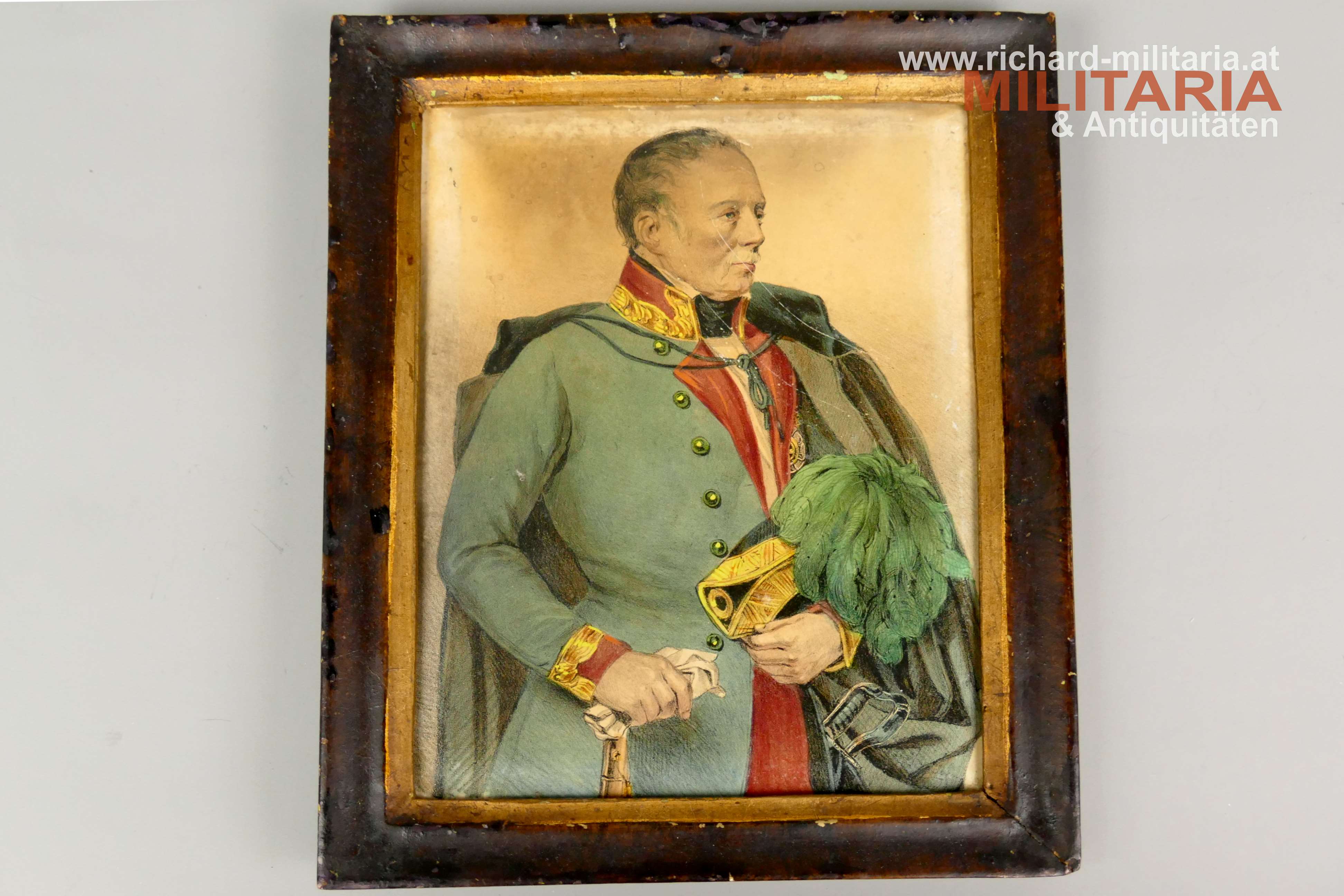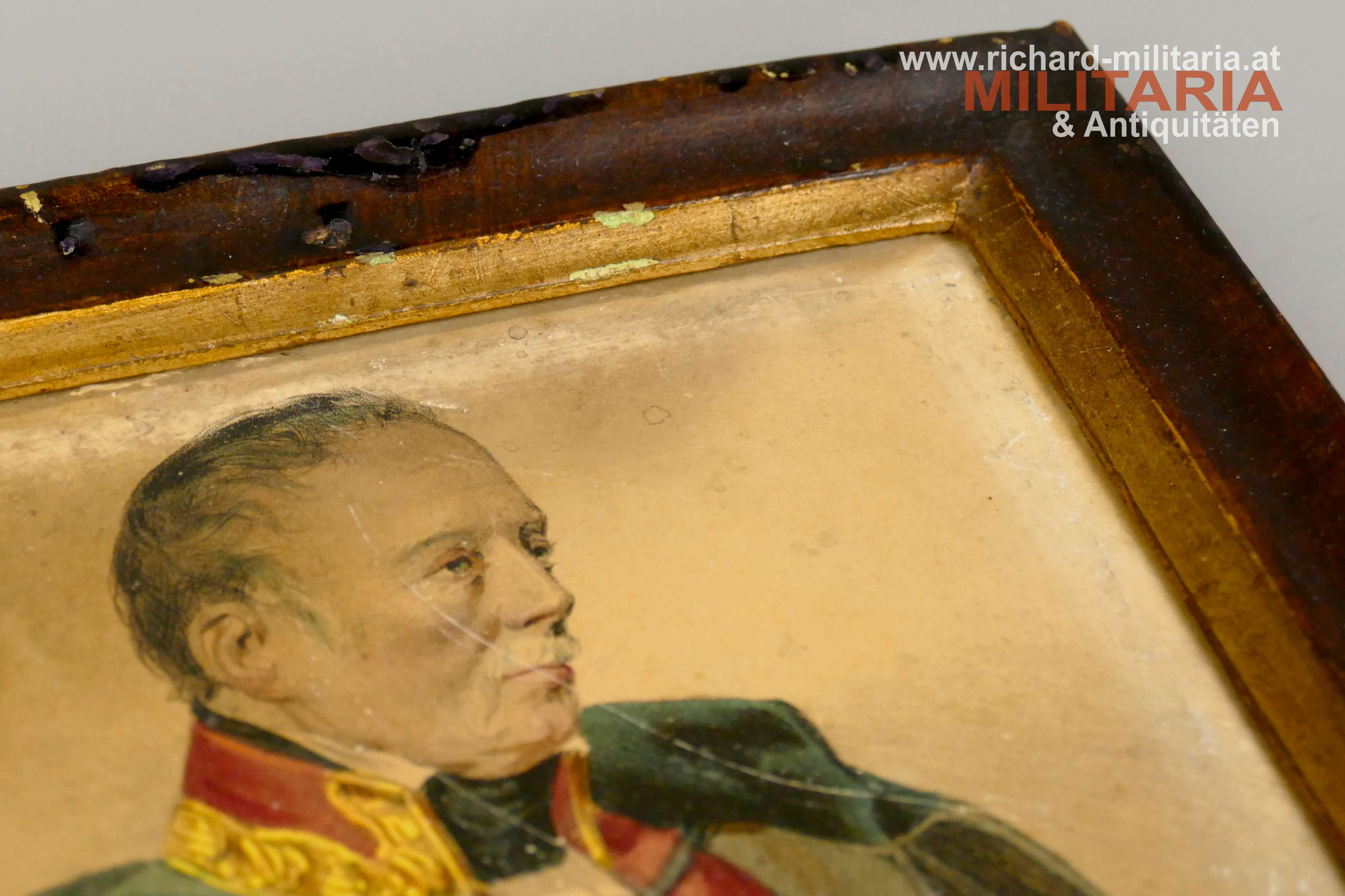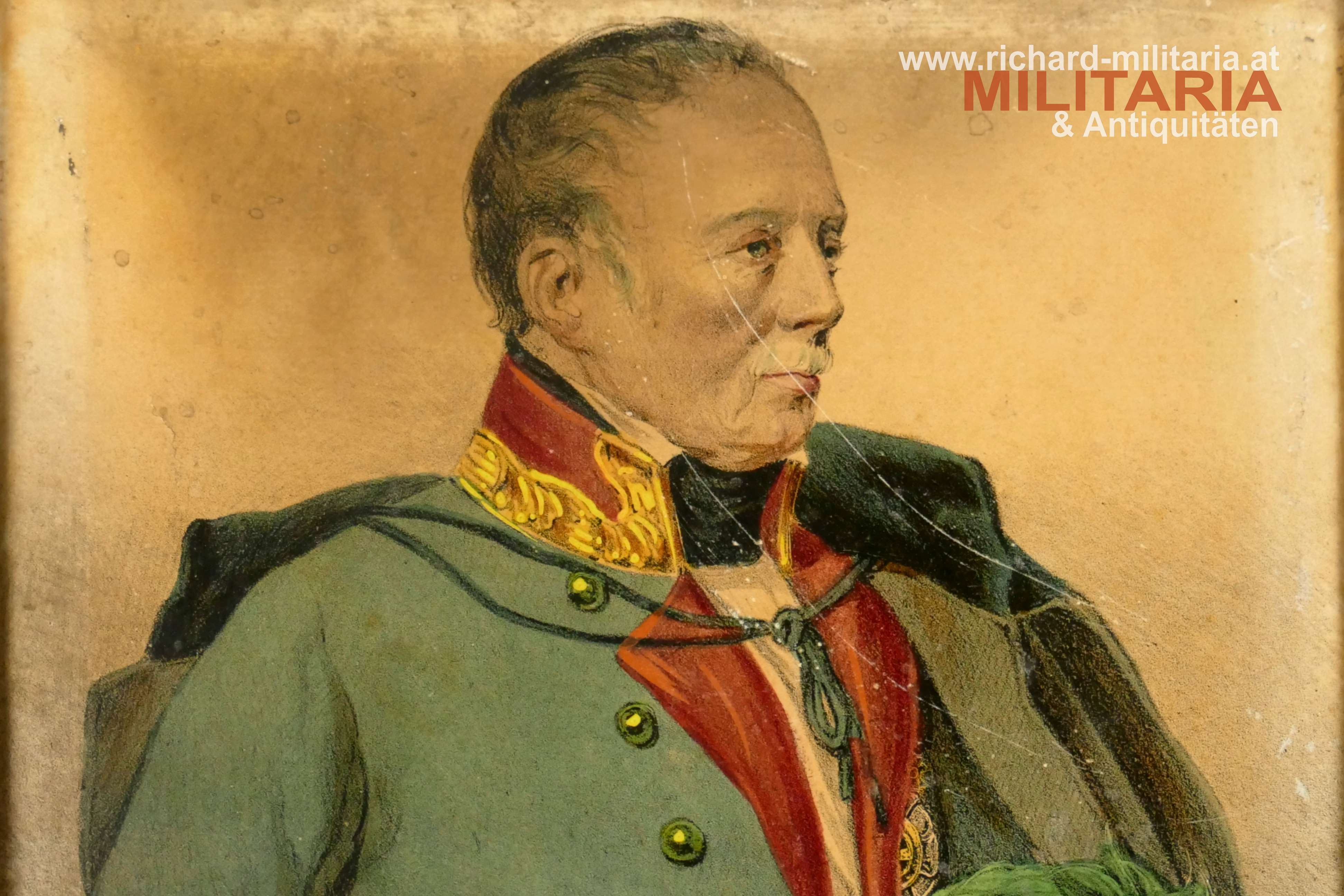 Gerahmtes Bild FM Radetzky, Farbdruck auf Papier - Rückseite mit Leinen verstärkt, brauner schlichter Holzrahmen mit Goldrand; Hochformat im Rahmen: 17,5 x 12,3 cm