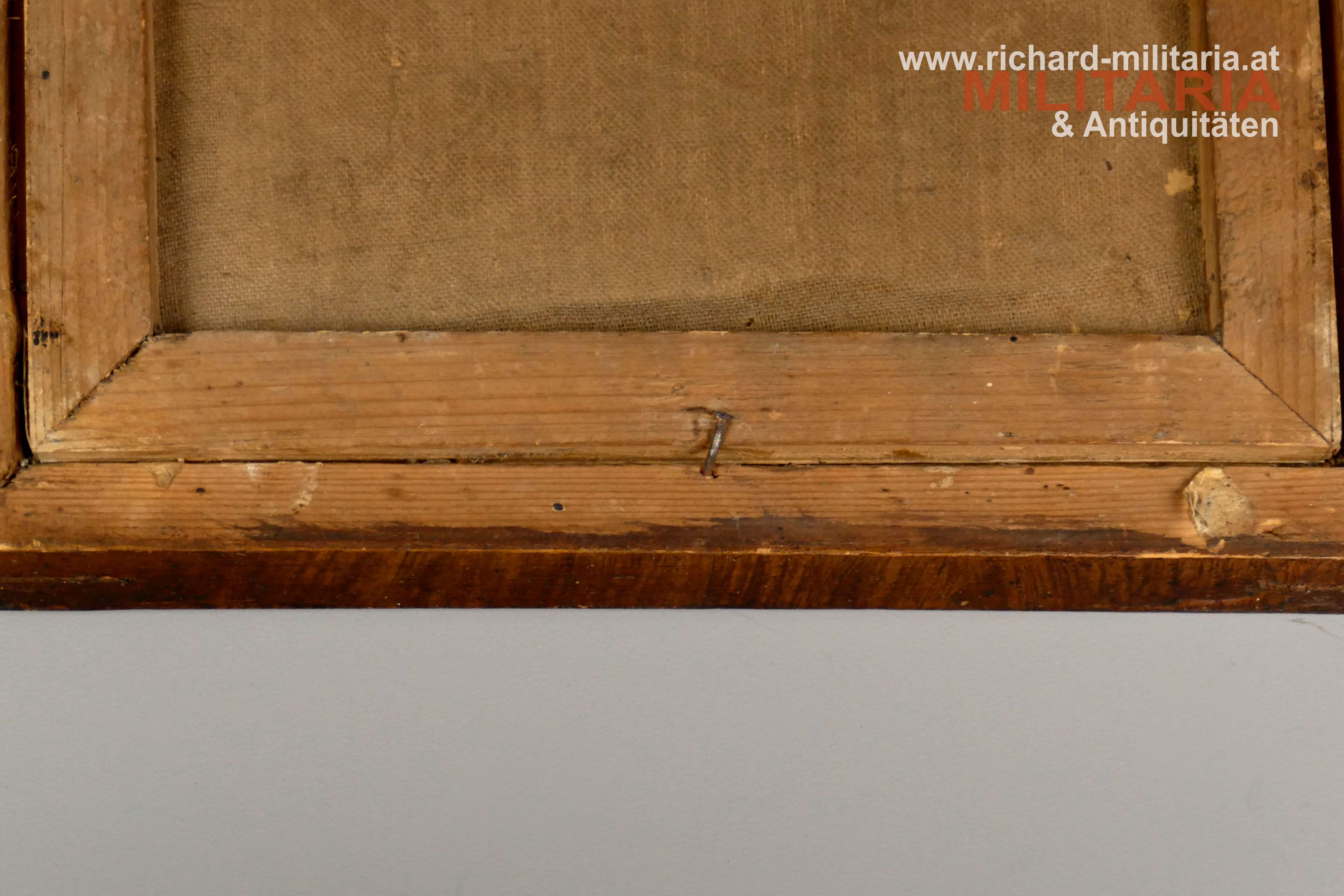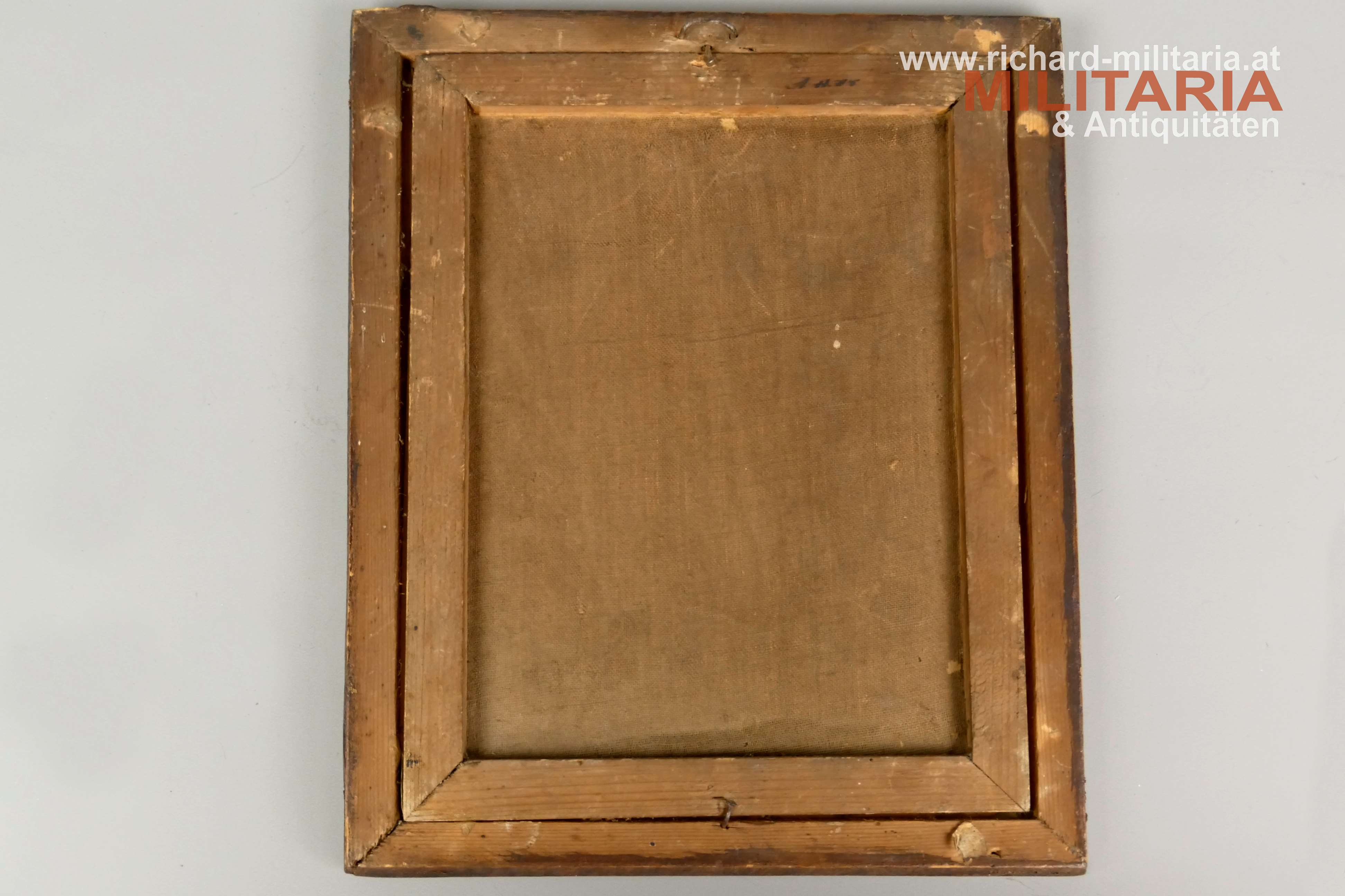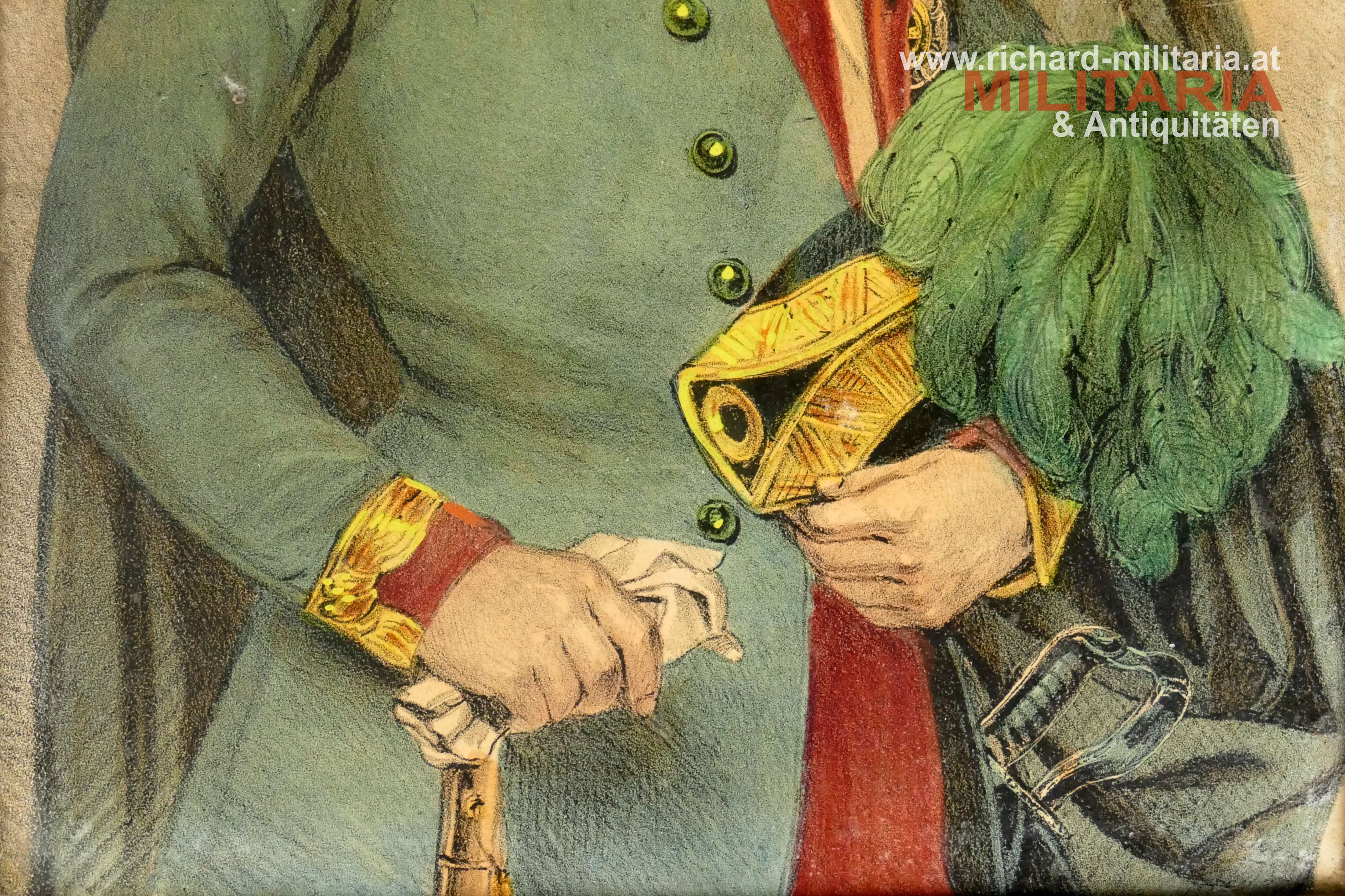 Gerahmtes Bild FM Radetzky, Farbdruck auf Papier - Rückseite mit Leinen verstärkt, brauner schlichter Holzrahmen mit Goldrand; Hochformat im Rahmen: 17,5 x 12,3 cm