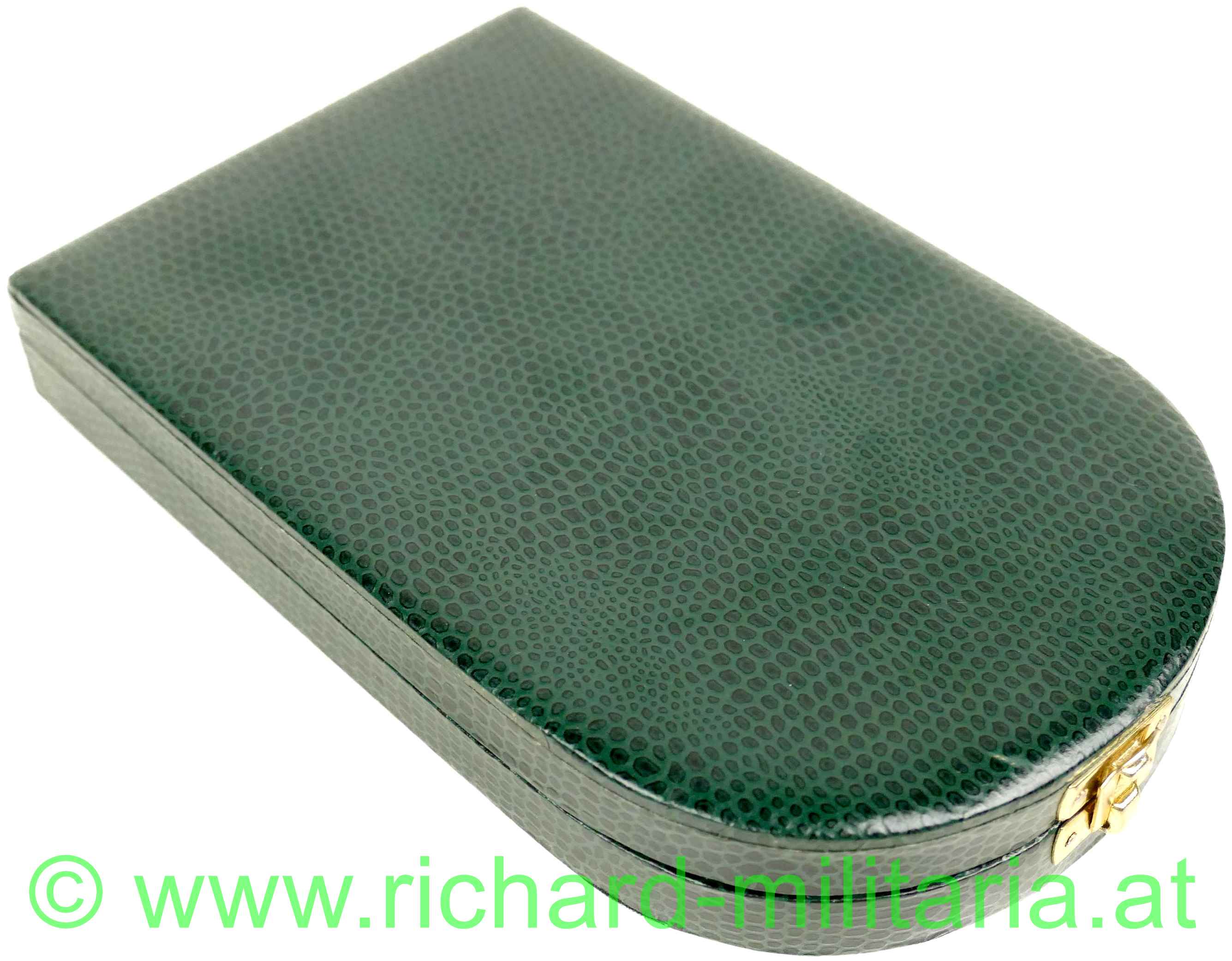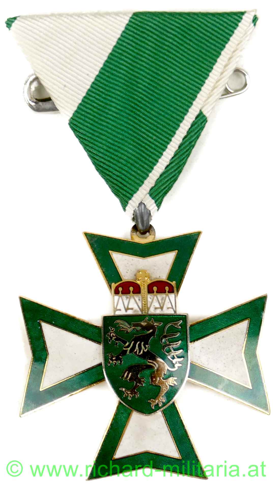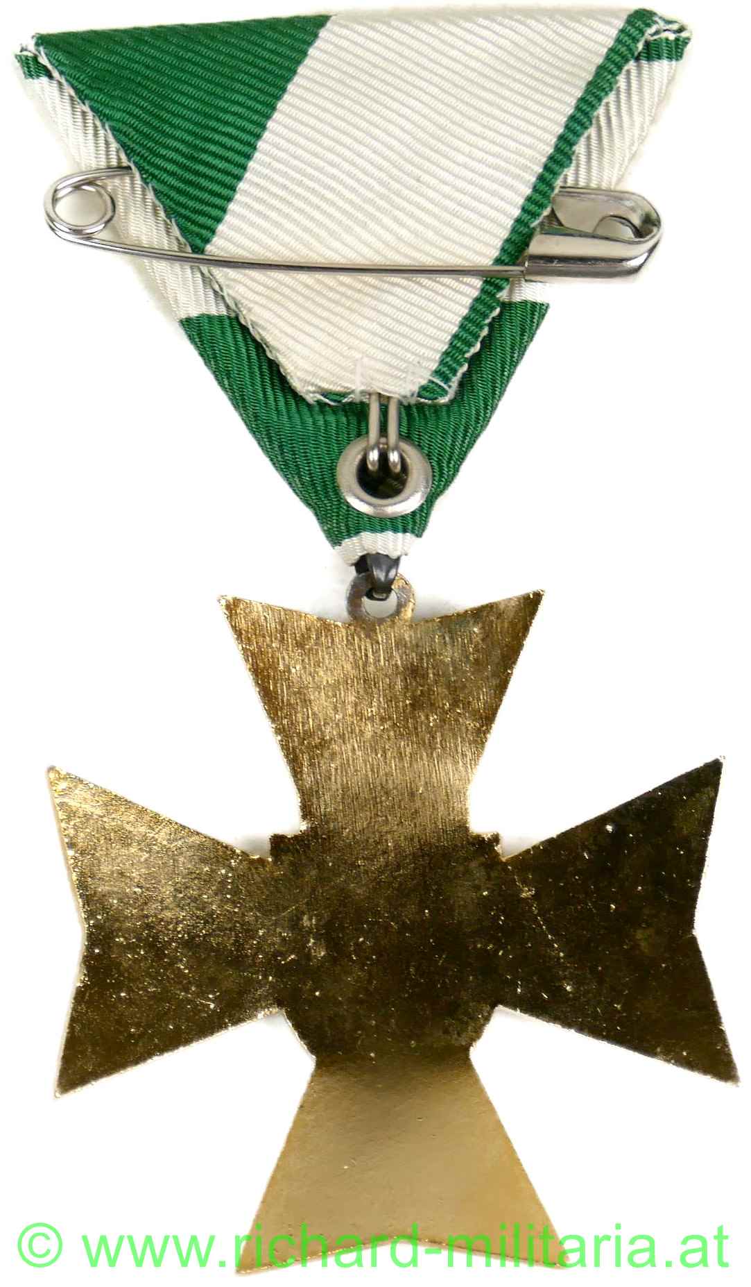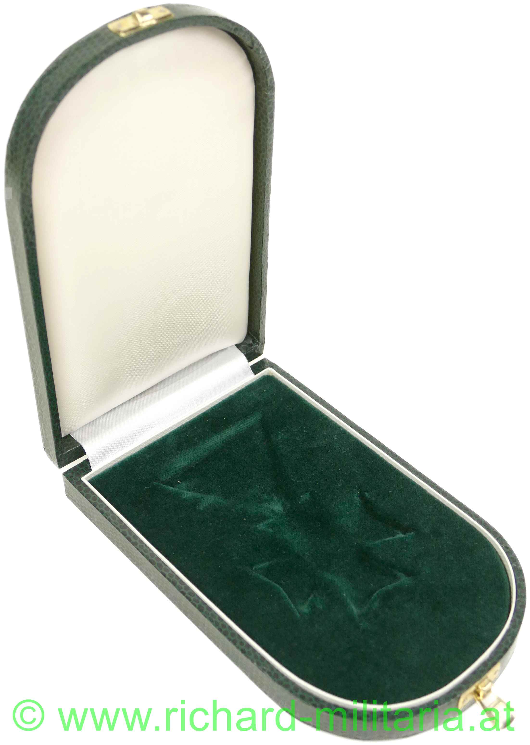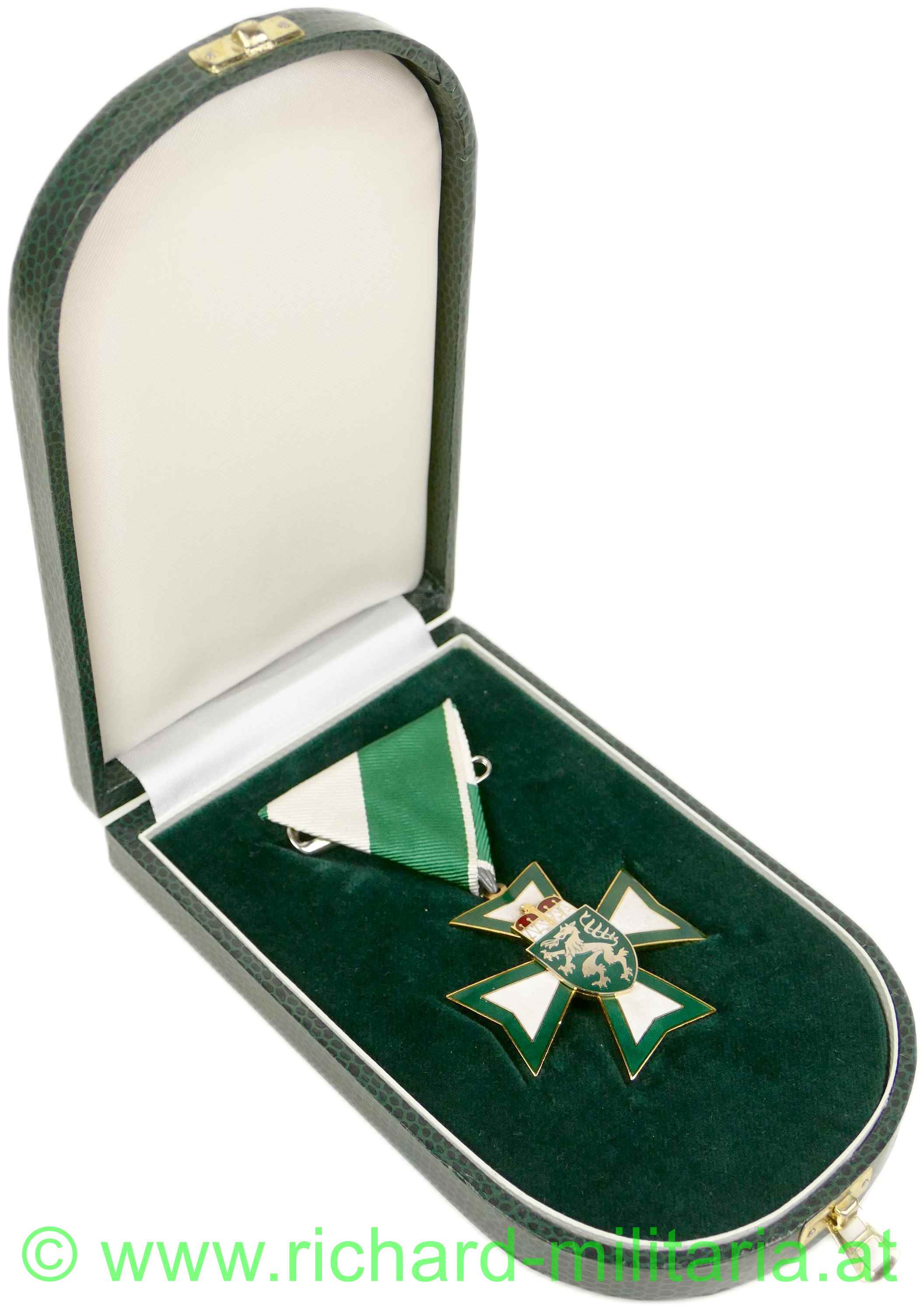Goldenes Ehrenzeichen des Landes Steiermark mit Etui, Tombak vergoldet und emailliert, originales Band; dazugehöriges halbrundes grünes Etui; weiße Emaillierung etwas gedunkelt; am Etuiboden Händleretikett: "Puchmann, Weiz";