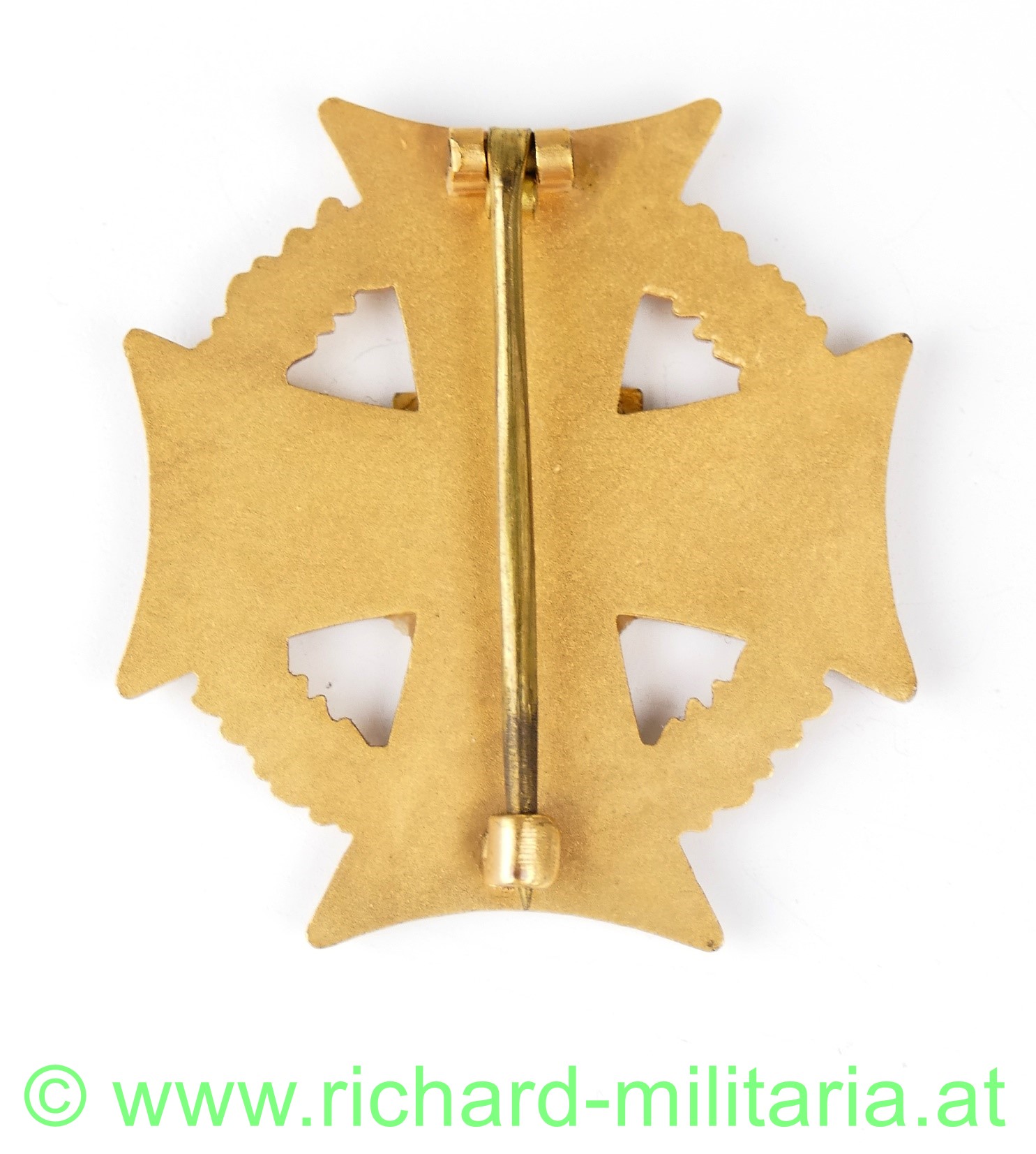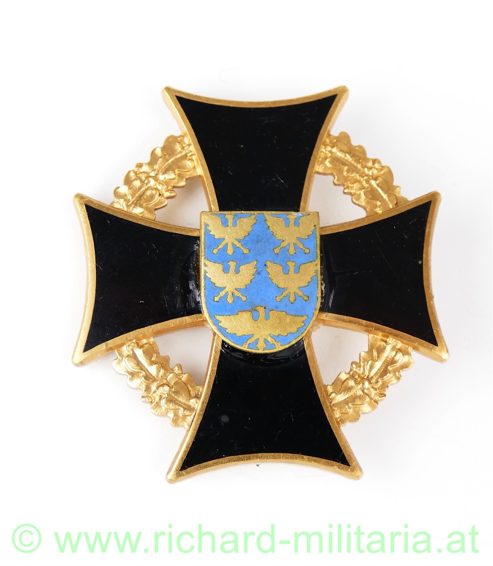Goldenes Ehrenzeichen des Kameradschaftsbundes im Landesverband Niederösterreich, schwarzes Tatzenkreuz mit silberfarbenen Rand und dem Landeswappen Niederösterreichs im Zentrum, mit einem silbernen Eichenlaubkranz unterlegt, originale Nadel