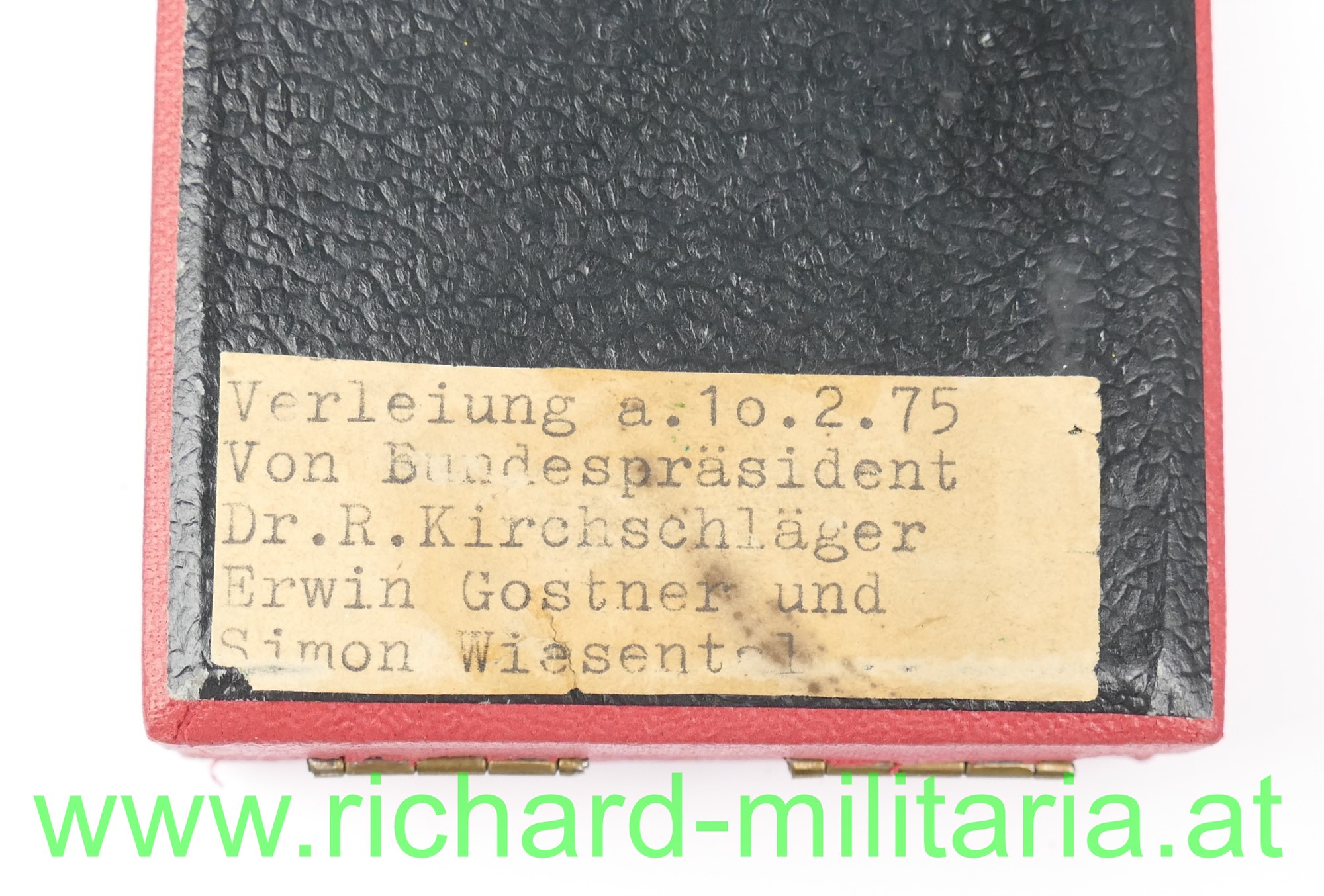 Beschriftung am Boden des Etuis: "Verleiung (sic!) a. 10.2.75 Von Bundespräsident Dr.R.Kirchschläger Erwin Gostner und Simon Wiesental"